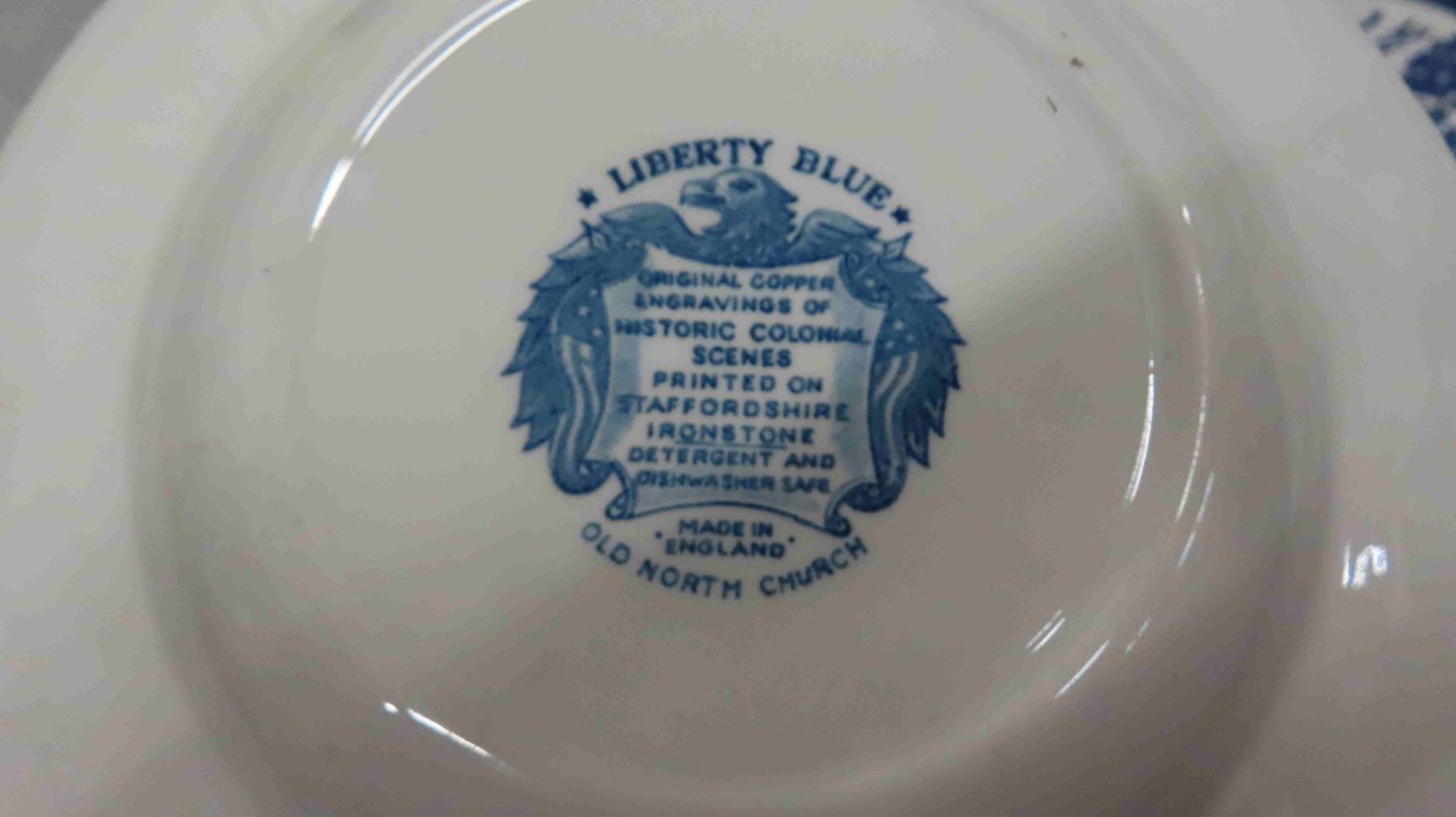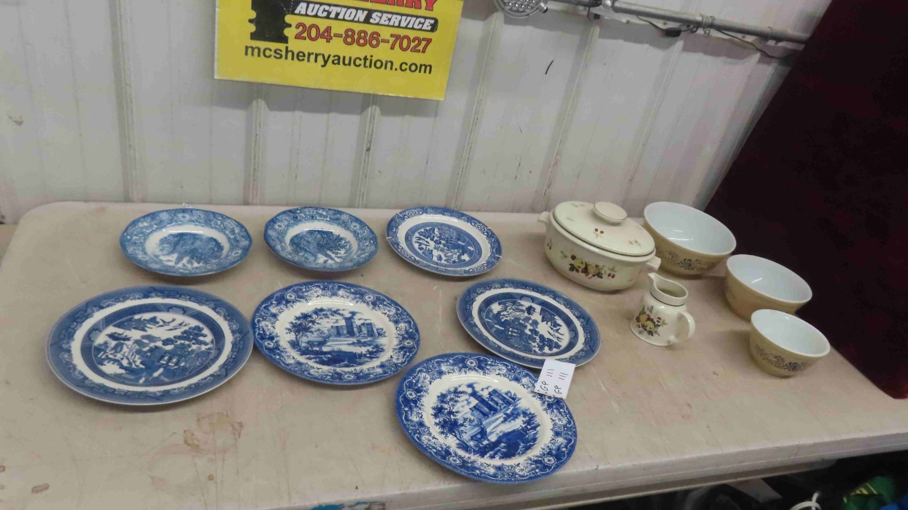 Royal Doultan Casserole and Pitcher, 3 Pyrex Mixing Bowls, Homestead Bowls, Assorted Blue Tableware