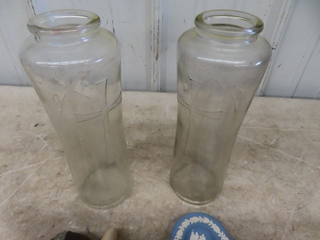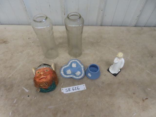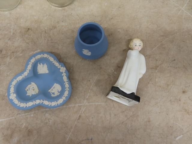 Royal Doulton Figurines - Darling, 2 Wedgewood Items, Chalkware & 2 JArs with Crosses