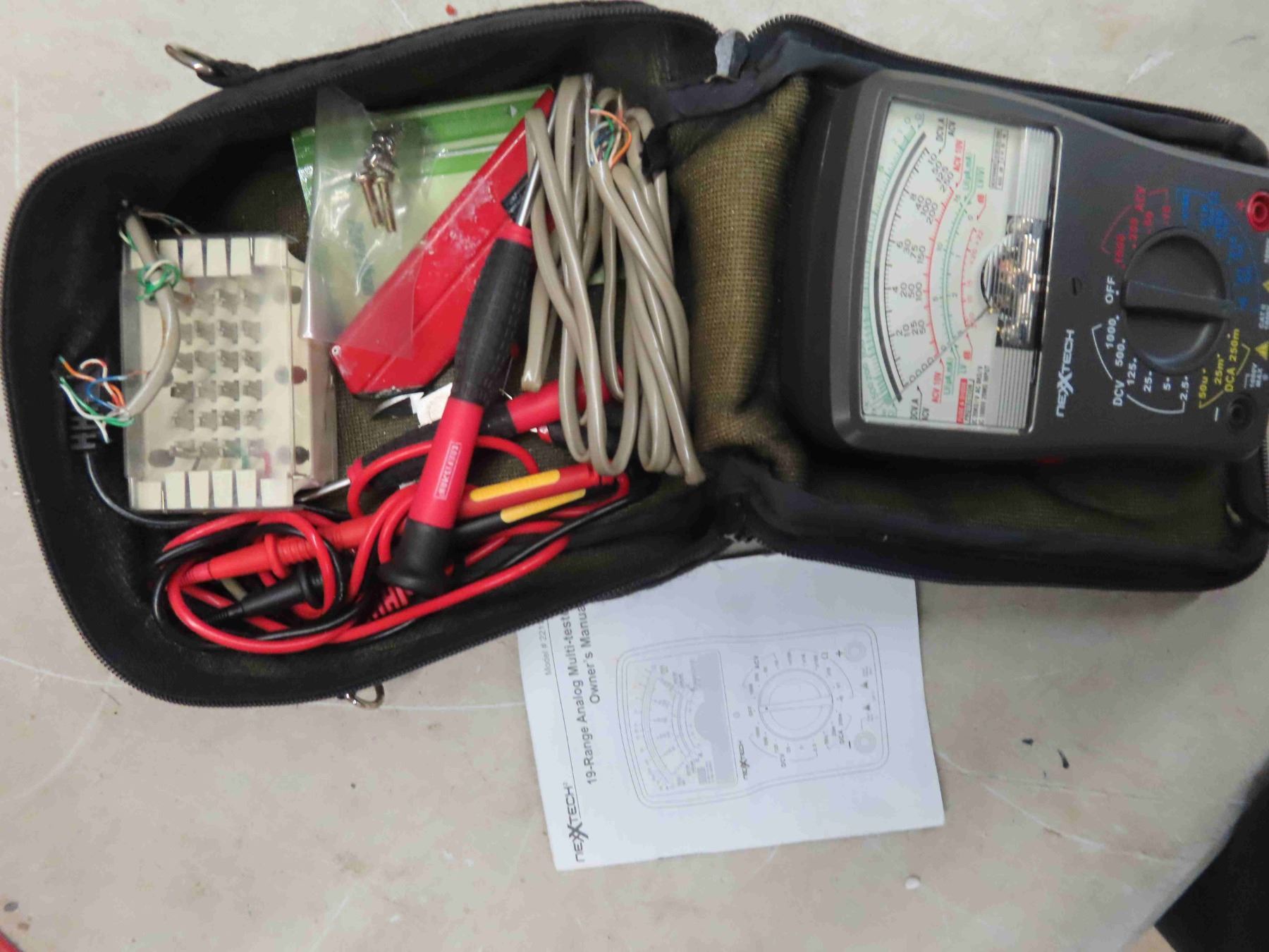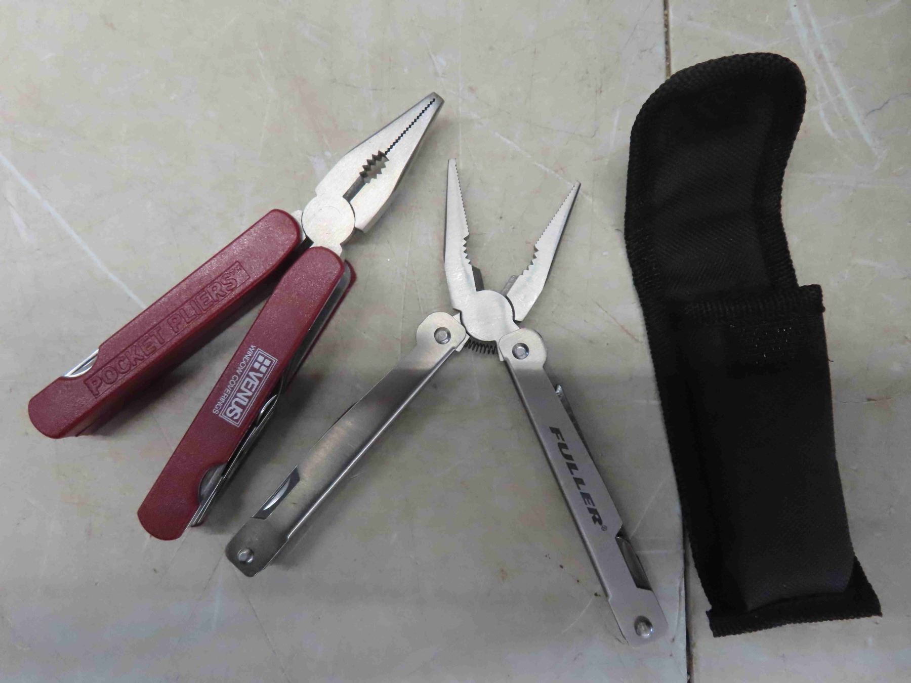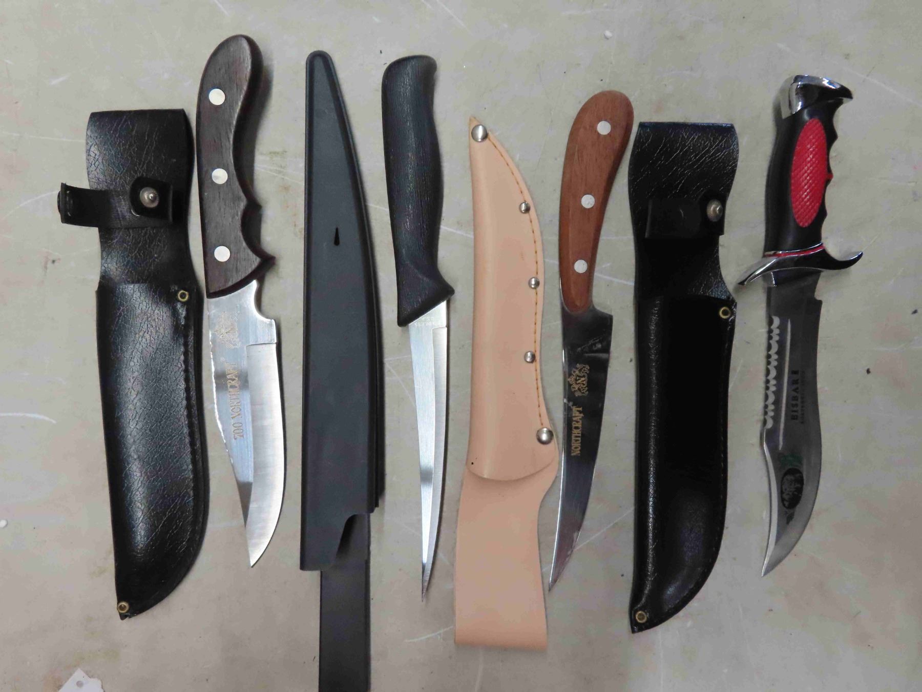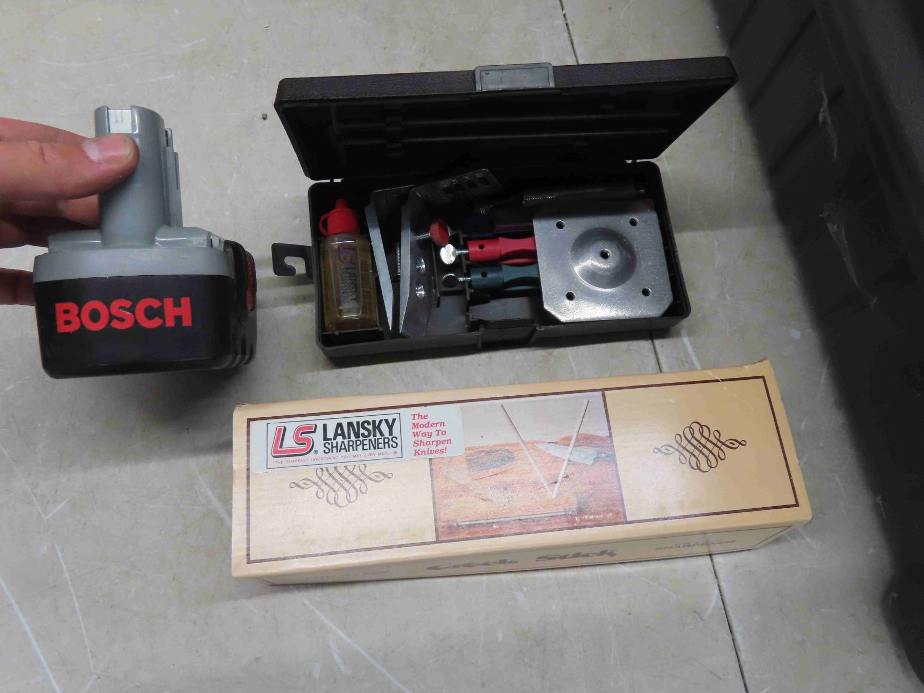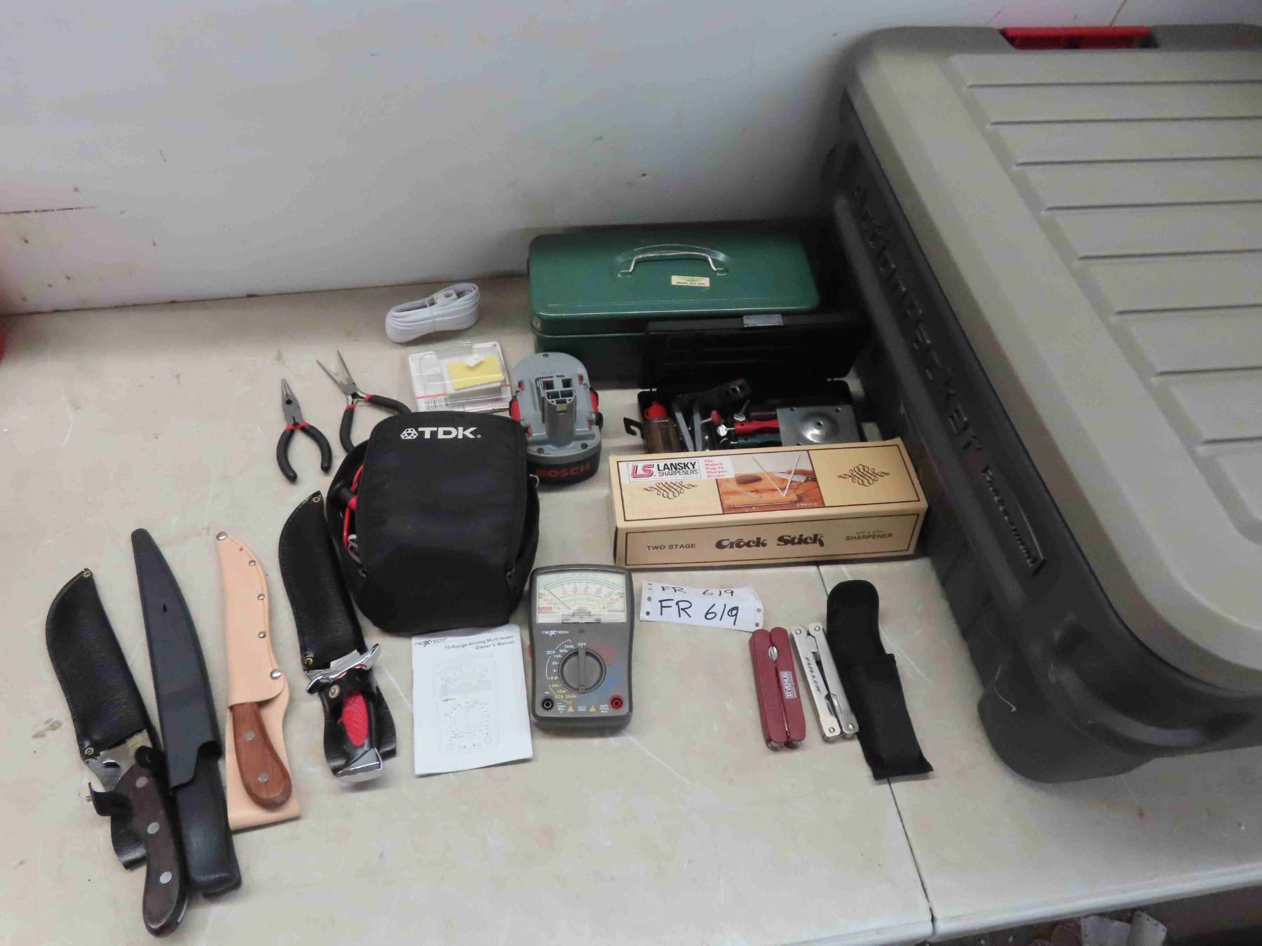 Rubbermaid Tote with (4) Knives, (2) Multi Tools, (2) Knife Sharpeners, Bosch Drill Battery , Nexxtech Multi Tester.