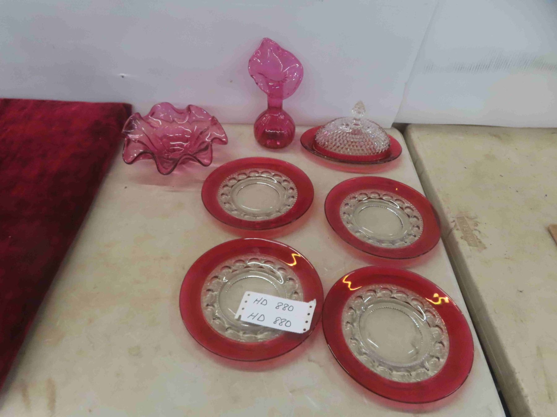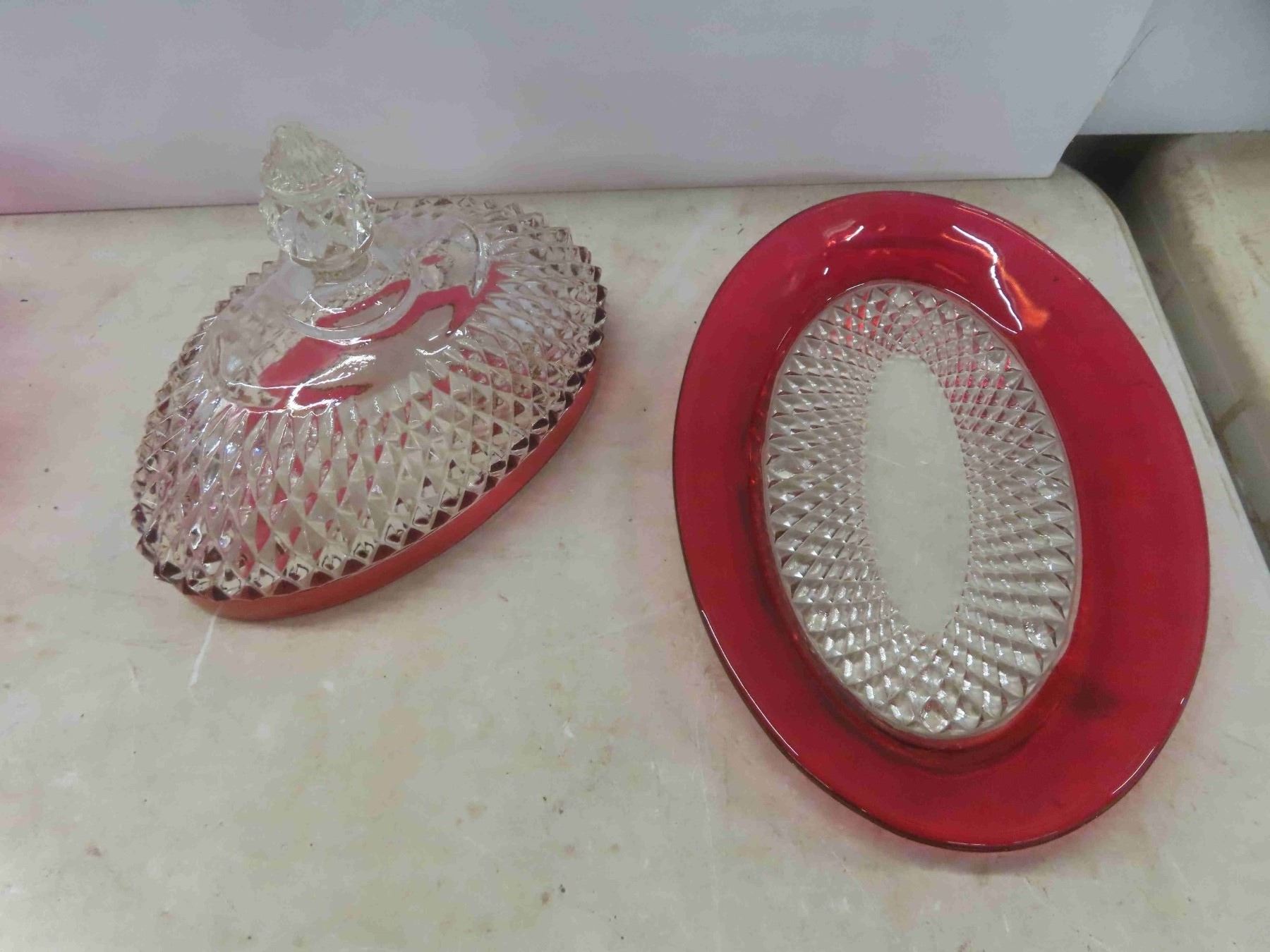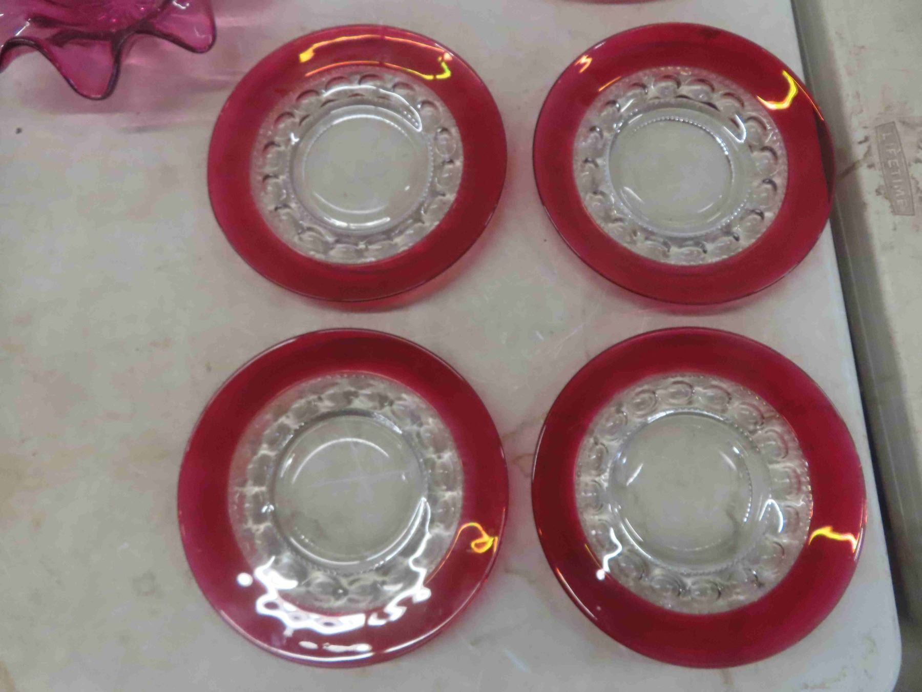Ruby Crystal Butter Dish , Vase , 4 Bread and Butter Dishes , Candy Bowl