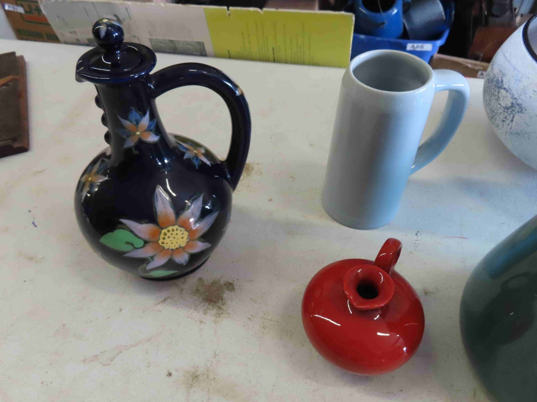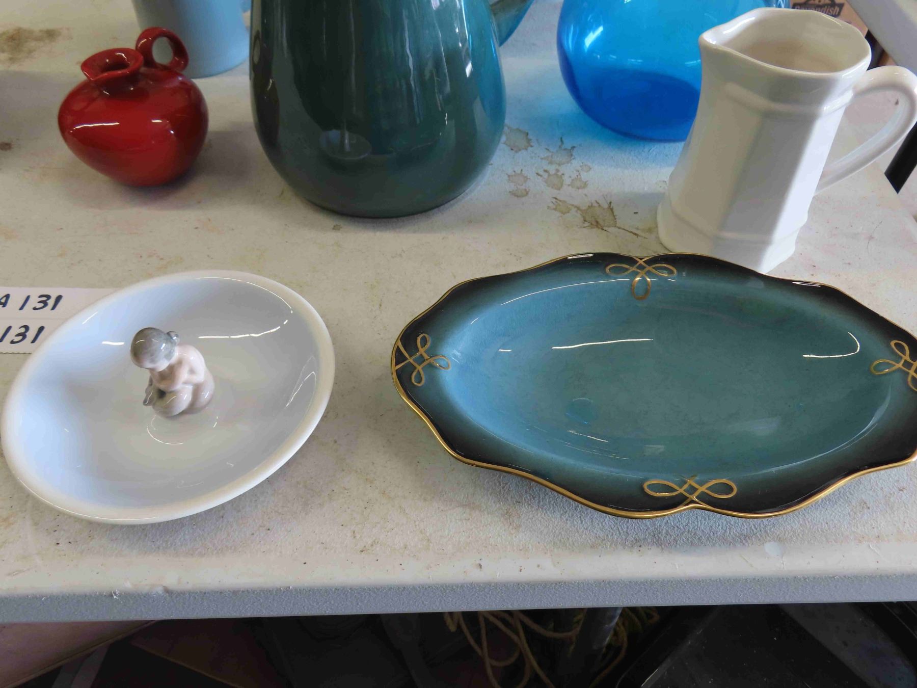 Russel Wright Ceramic Pitcher, Blue Glass Decanter, Large Colored Glass Bowl, Floral Tea Pot, plus more