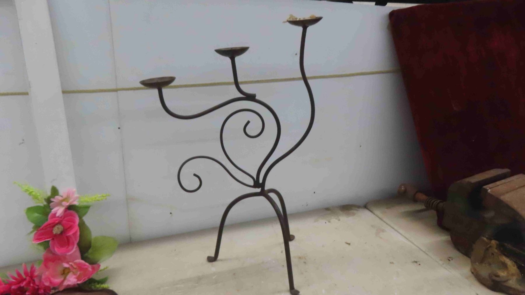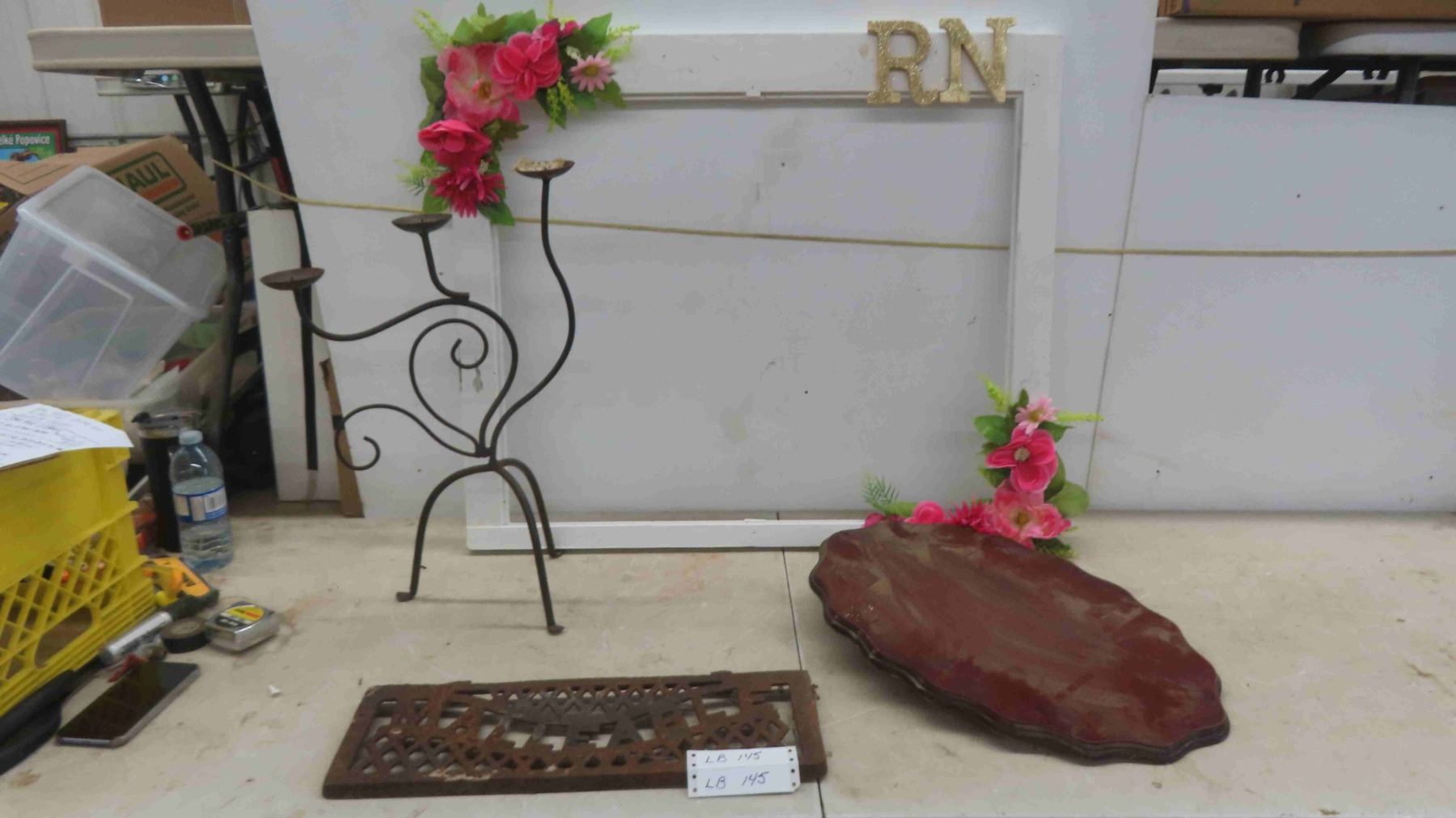 Rustic Wood Frame 33'' x 28'' , Wrought Iron 3 Candle Stand 22'' H , Grate 19'' x 7'' & More