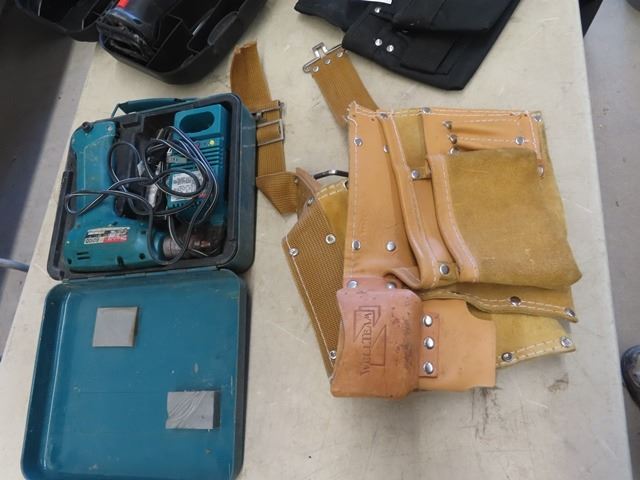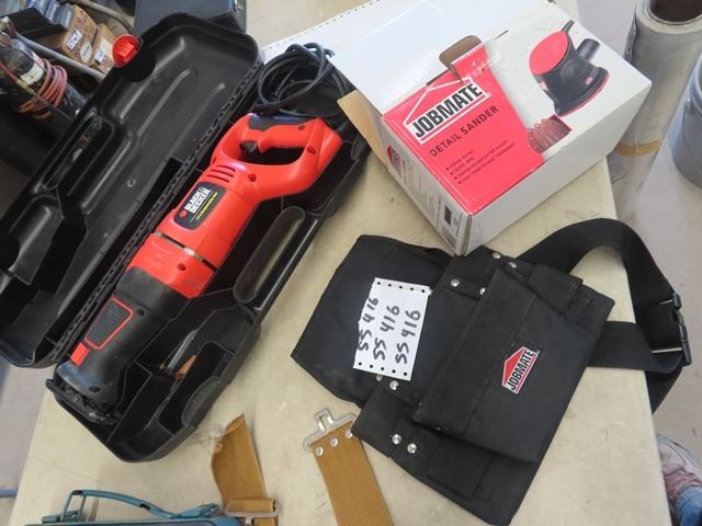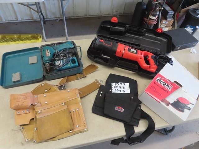 (SS) B & D Recip Saw, Jobmate Sander, Makita Cordless Drill & 2 Carpenters Belts