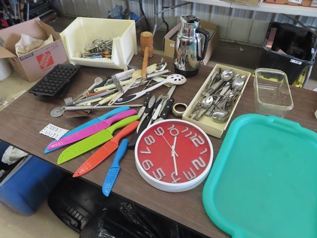 (SS) Colored Glass, Platters, Ashtrays, Kitchen Ware, Utensils, & Clock