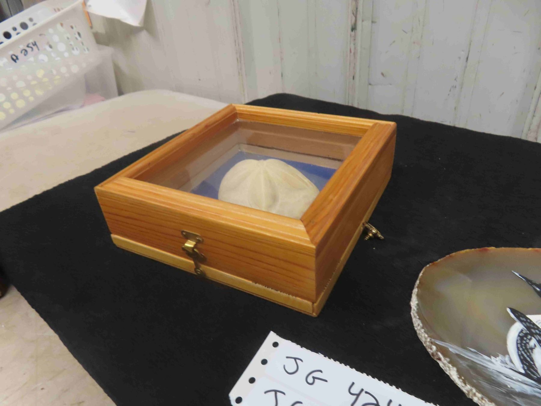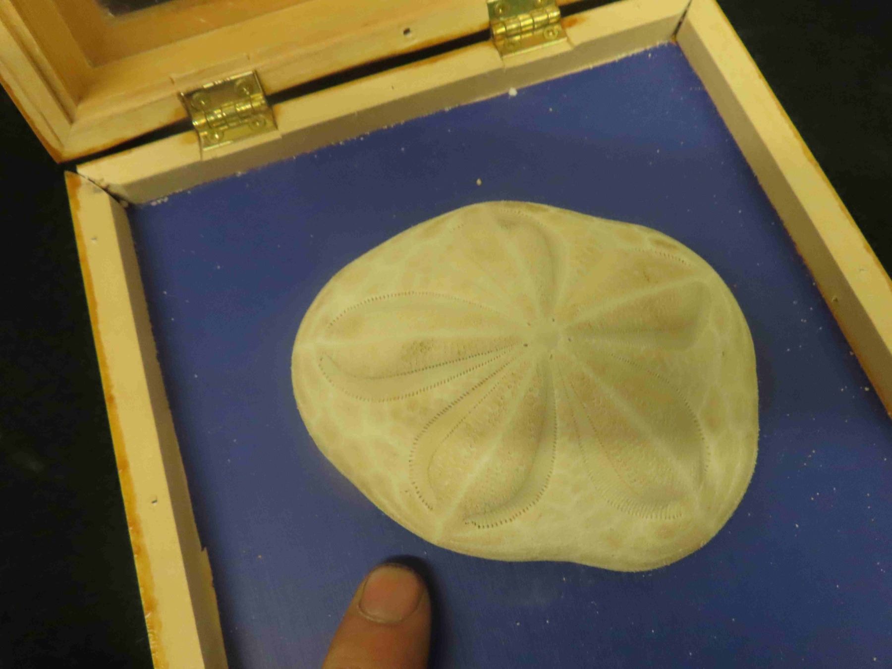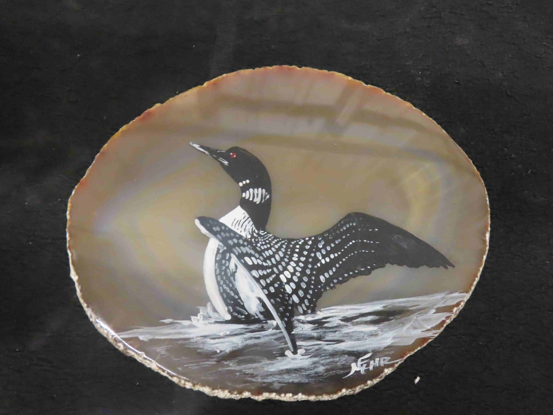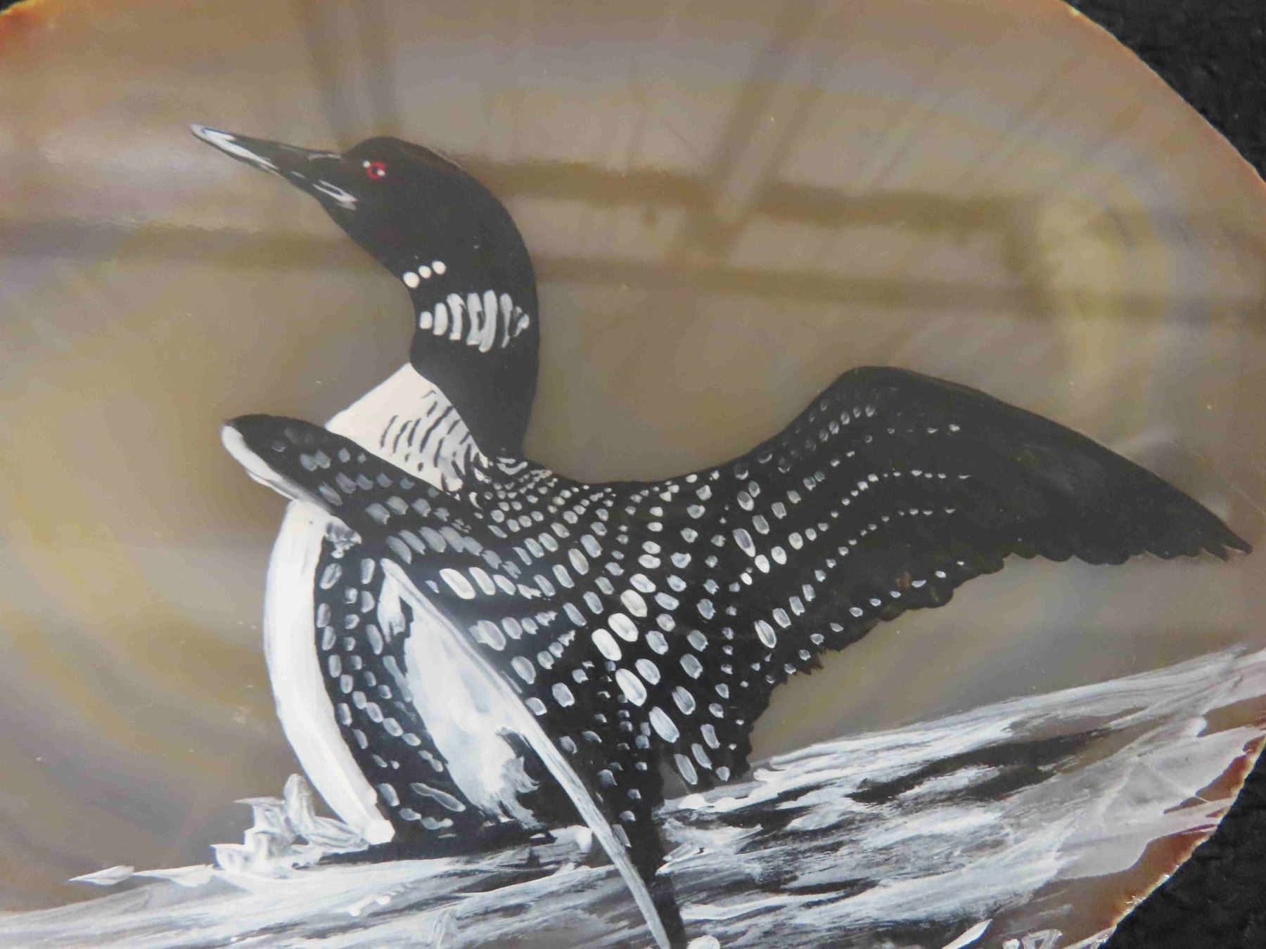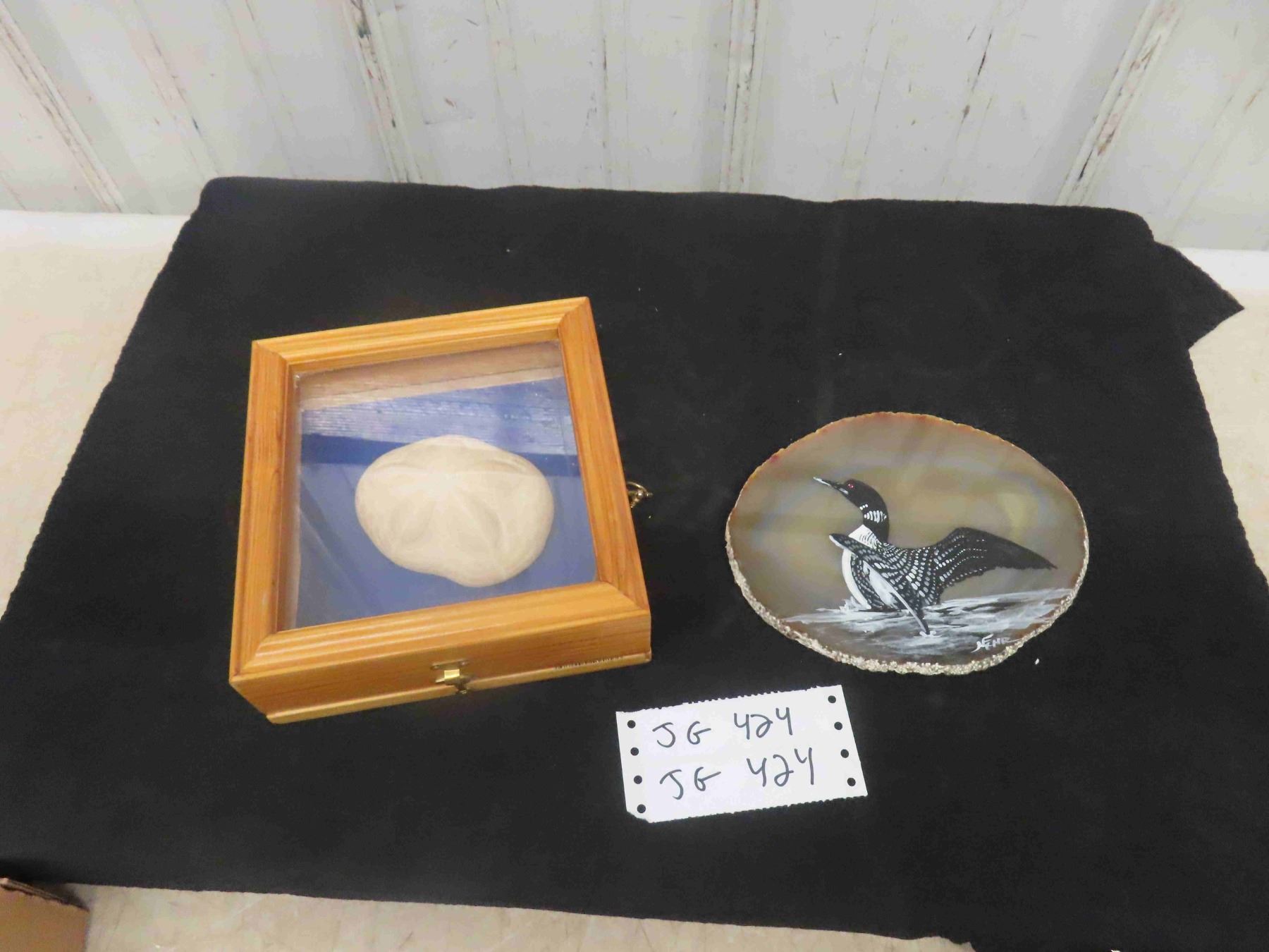 Sand Dollar in Wooden Display Case, Painting of Loon on Polished Stone