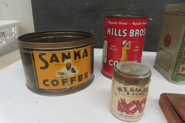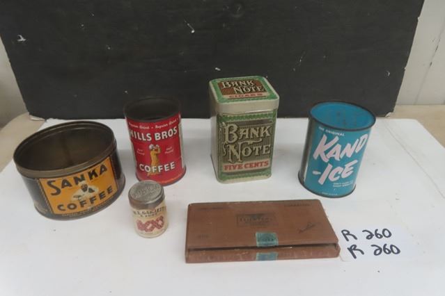 Sanka Coffee Tin, Hills Bro Coffee Tin, Bank Note Tin, Kand-Ice Tin, Tripsis Snuff Tin, Hollywood Cigarette Box + Product