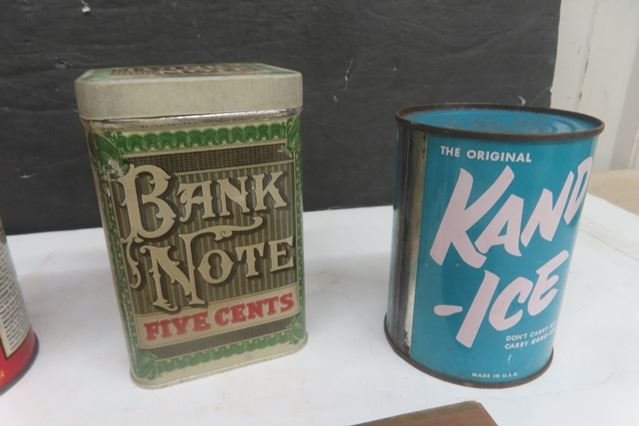 Sanka Coffee Tin, Hills Bro Coffee Tin, Bank Note Tin, Kand-Ice Tin, Tripsis Snuff Tin, Hollywood Ci