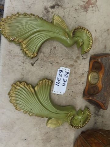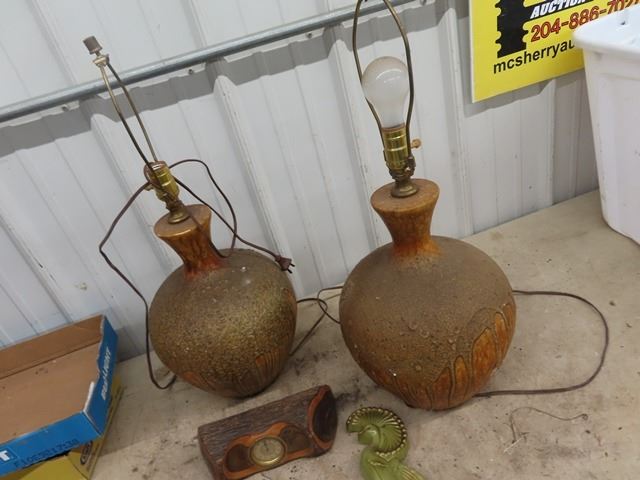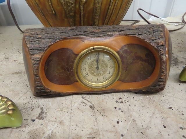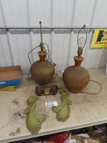 Set of Lamos- No Shade, Westclock Tiny Tin Mantle Clock,  & 2 Chalkware Peacocks