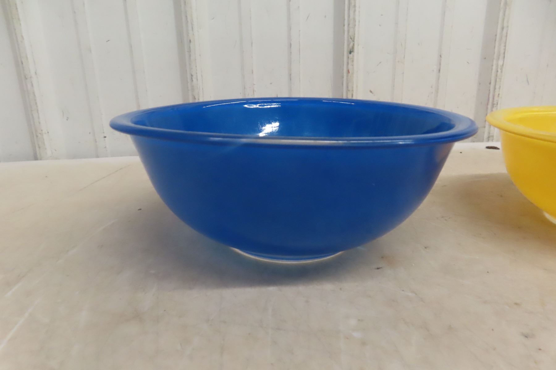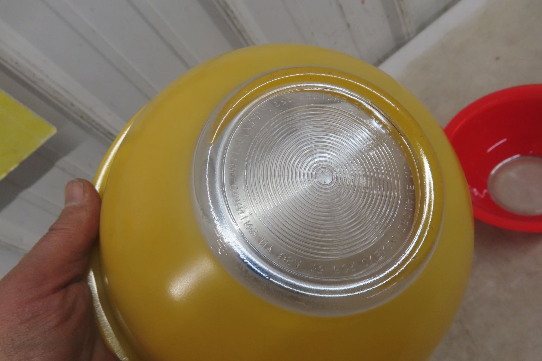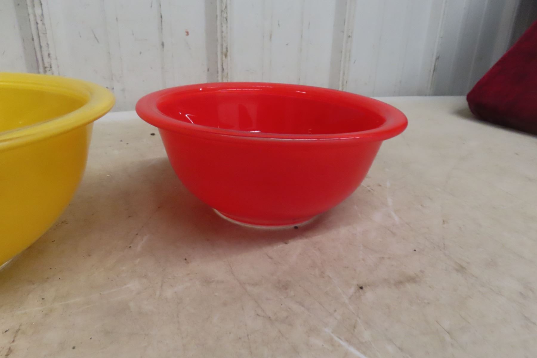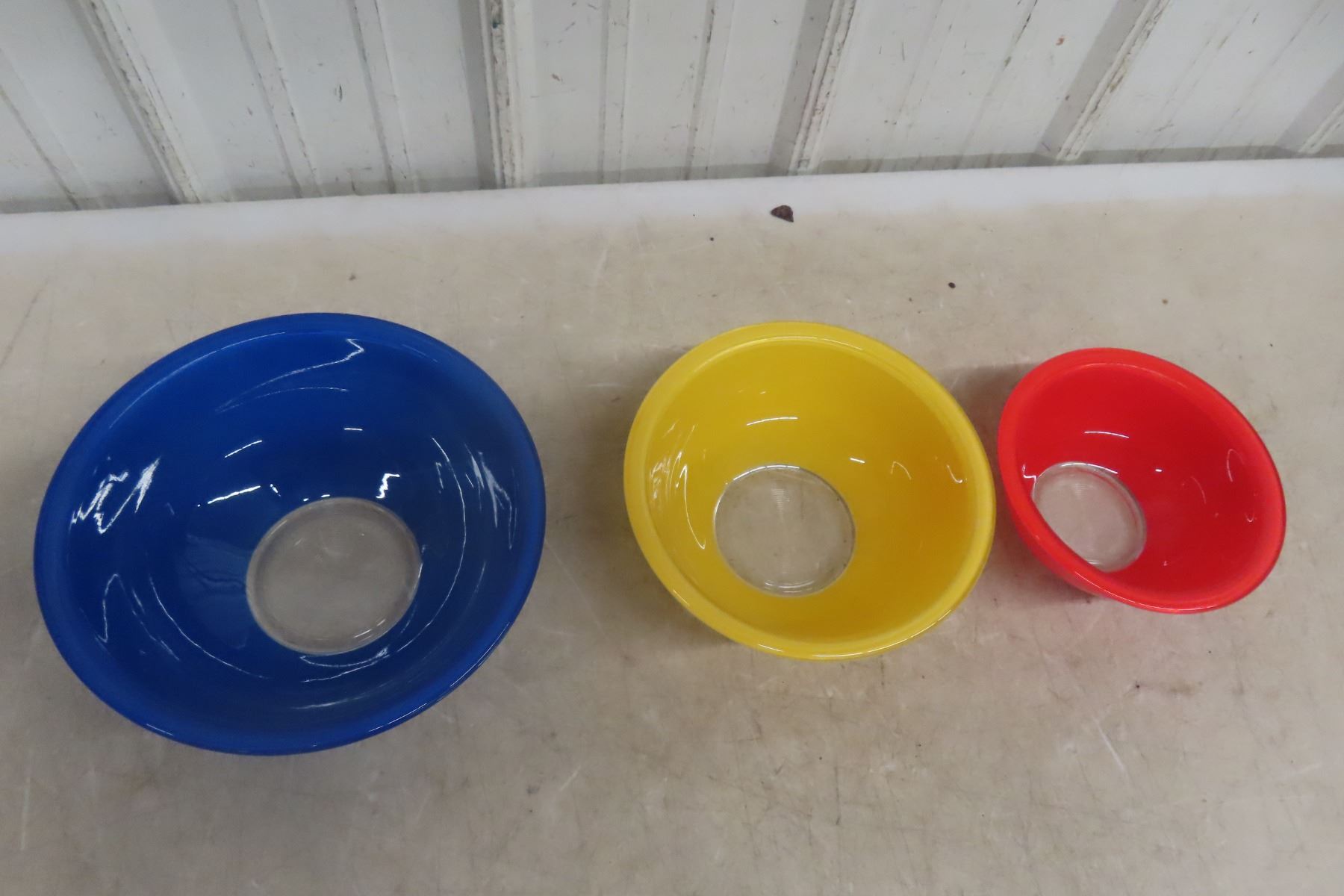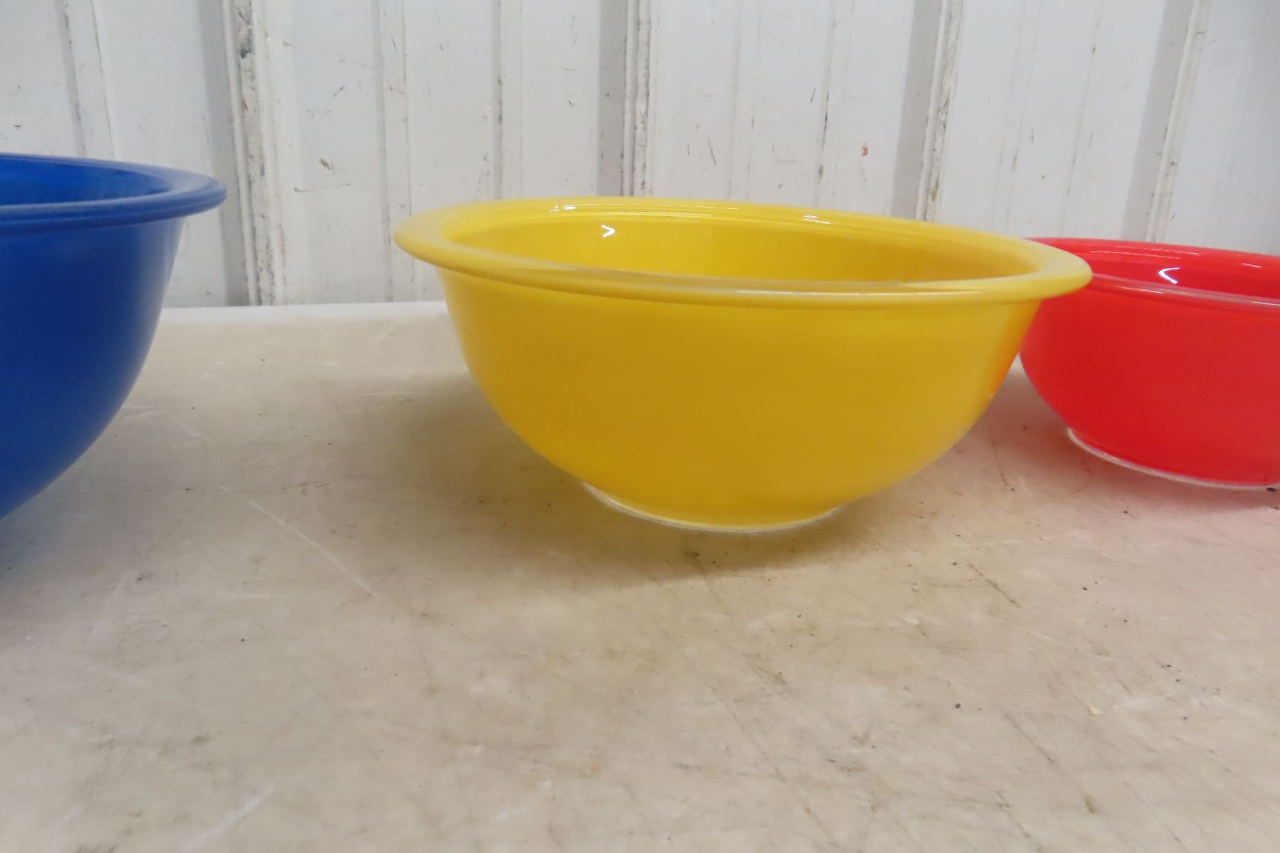 Set of Three Vintage Pyrex Primary Colour Mixing Bowls with Clear Bottom