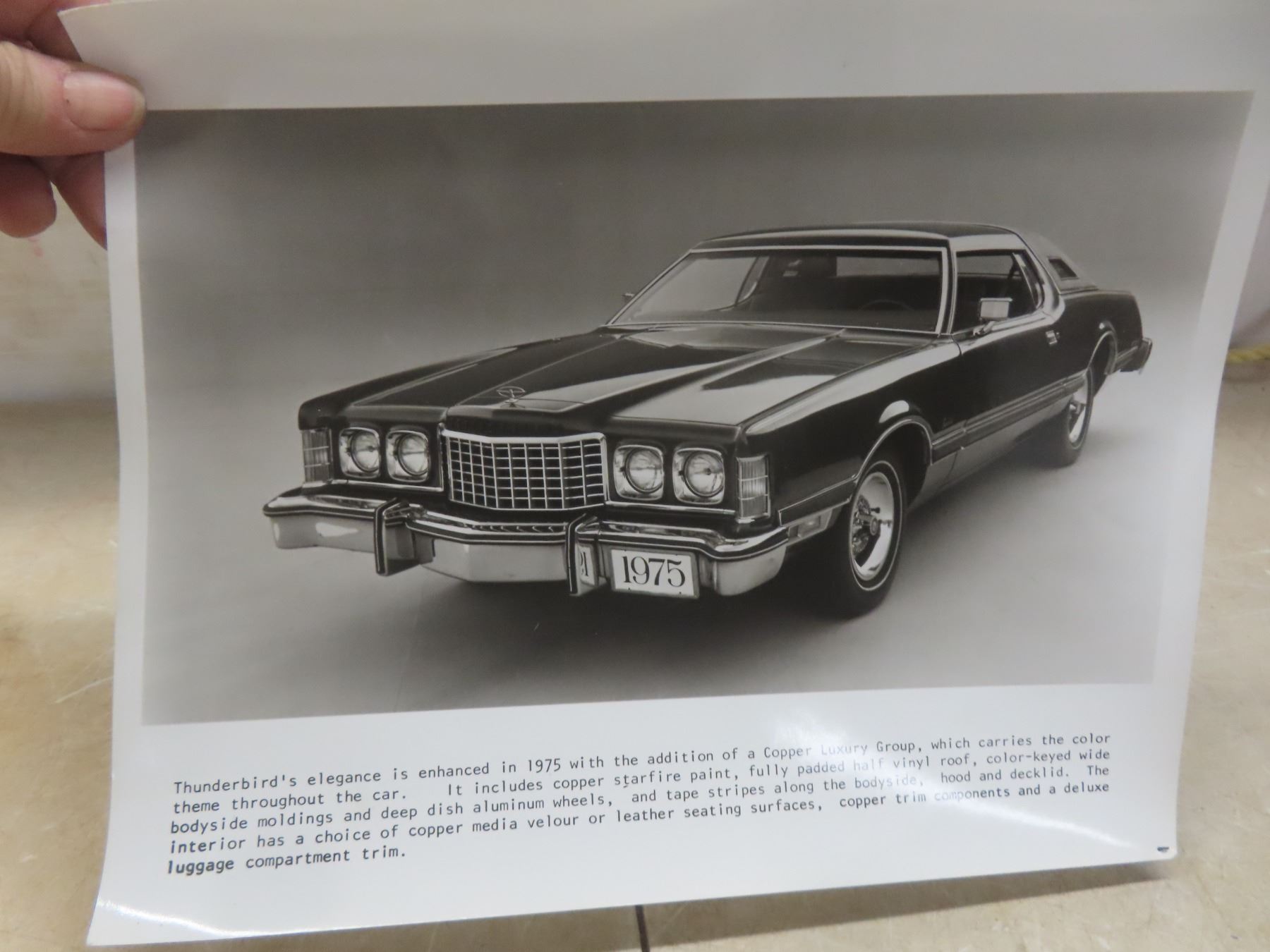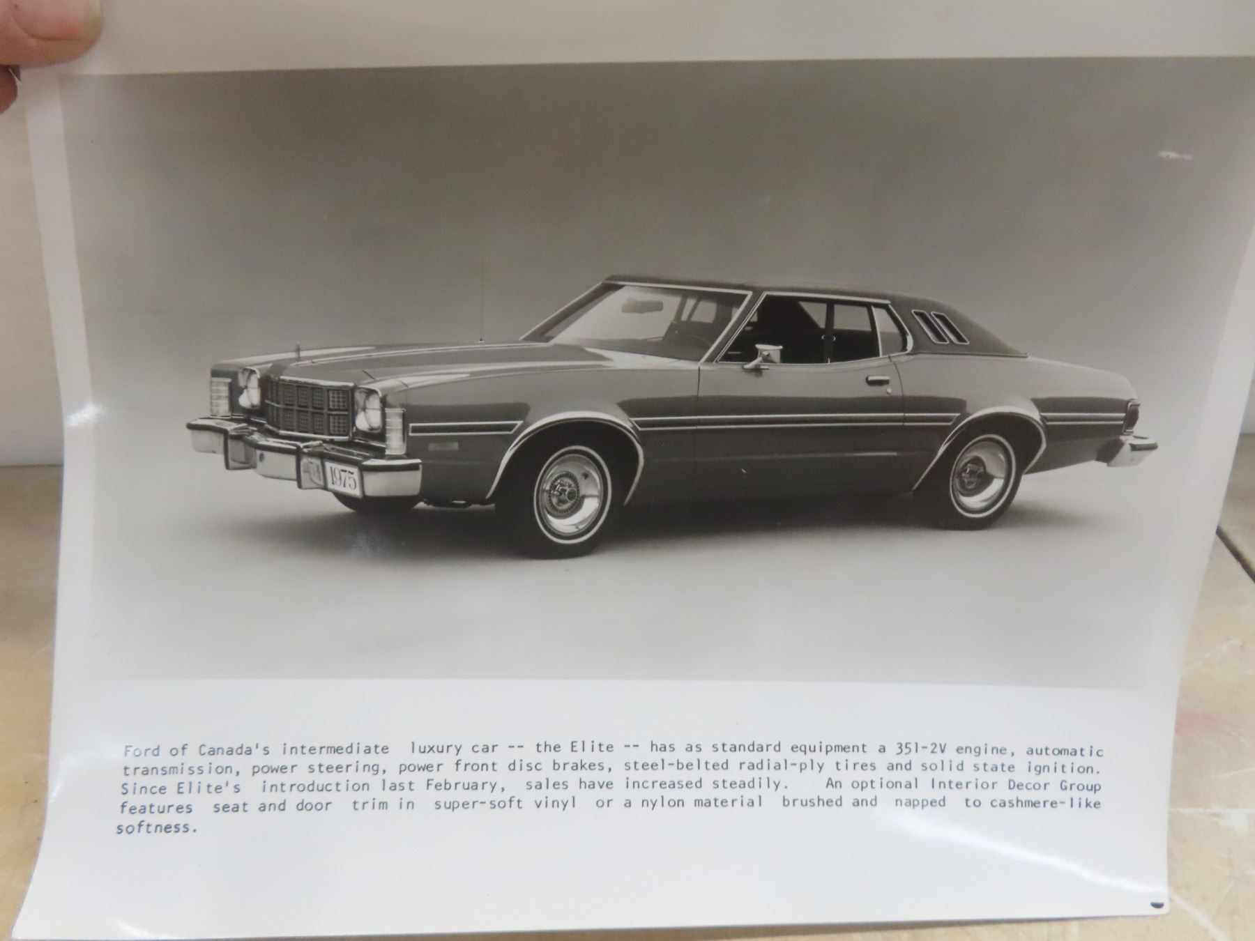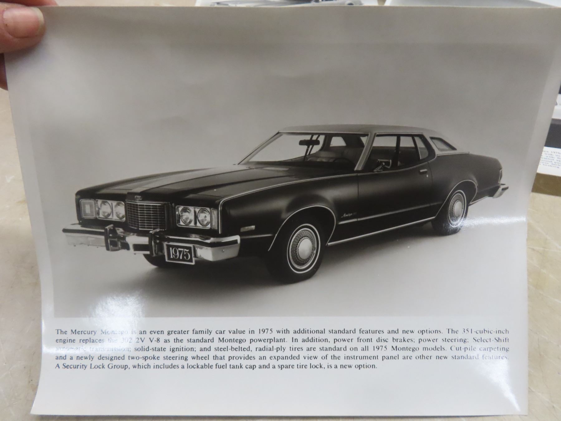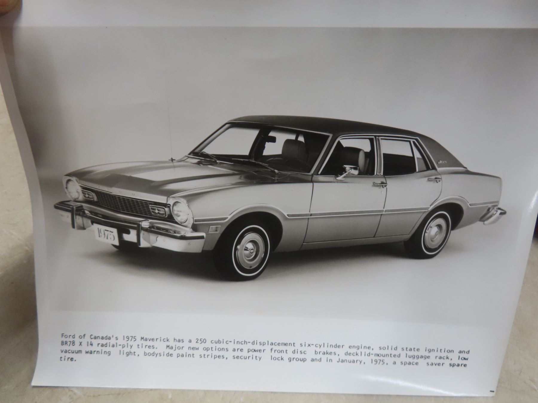 Seven 1975 Ford Dealership Promotional Black-and-White Glossy Photos: Montego, Thunderbird, Continental, Elite, and Maverick, 10" x 8"