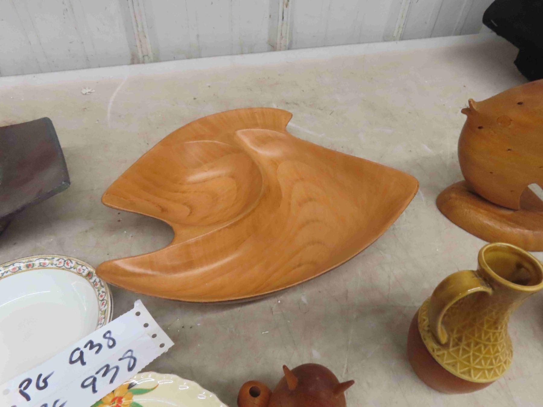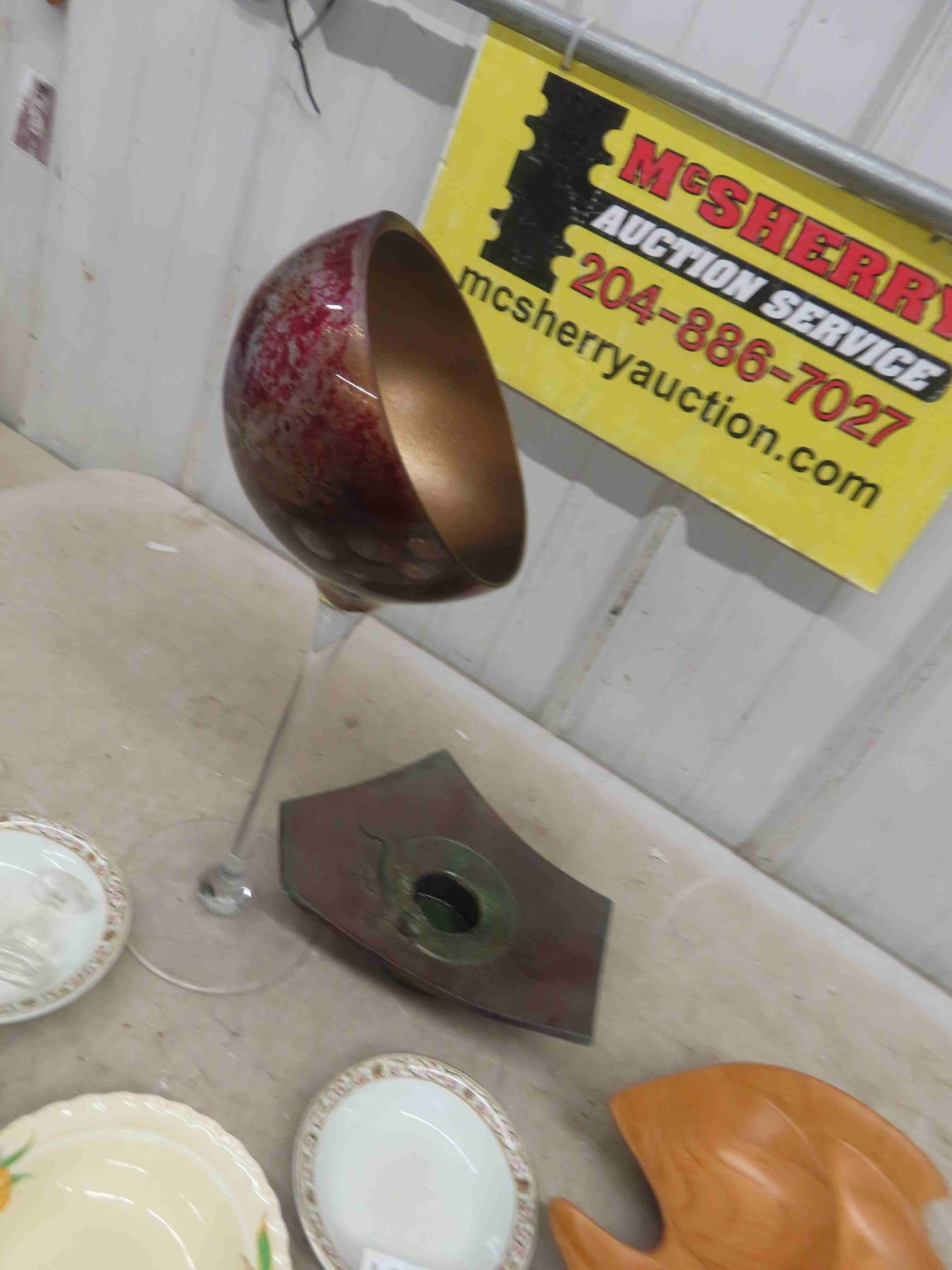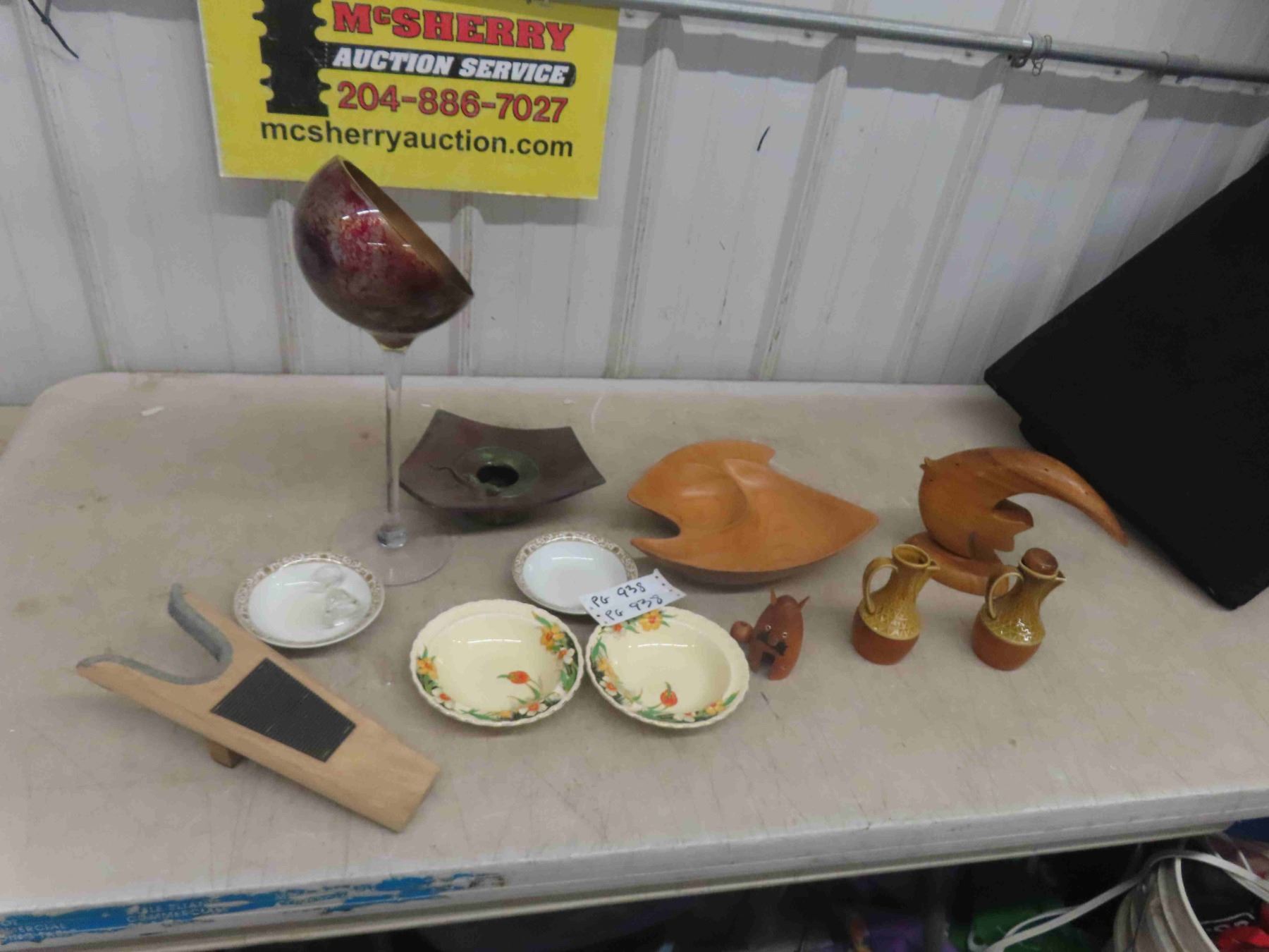 Signed Abstract Art Glass Like a Large Wine Glass Signed 'Bohn Pinaua MB' , Boot Jack for Cowboy Boots Made in Texas USA , 4 Vintage Bowls, Floral Frog, Glass Eye Cup, 5 Pottery & 2 Wood Items : Calif Pottery No Chips or Cracks, Nut Cracker, Fish Carving