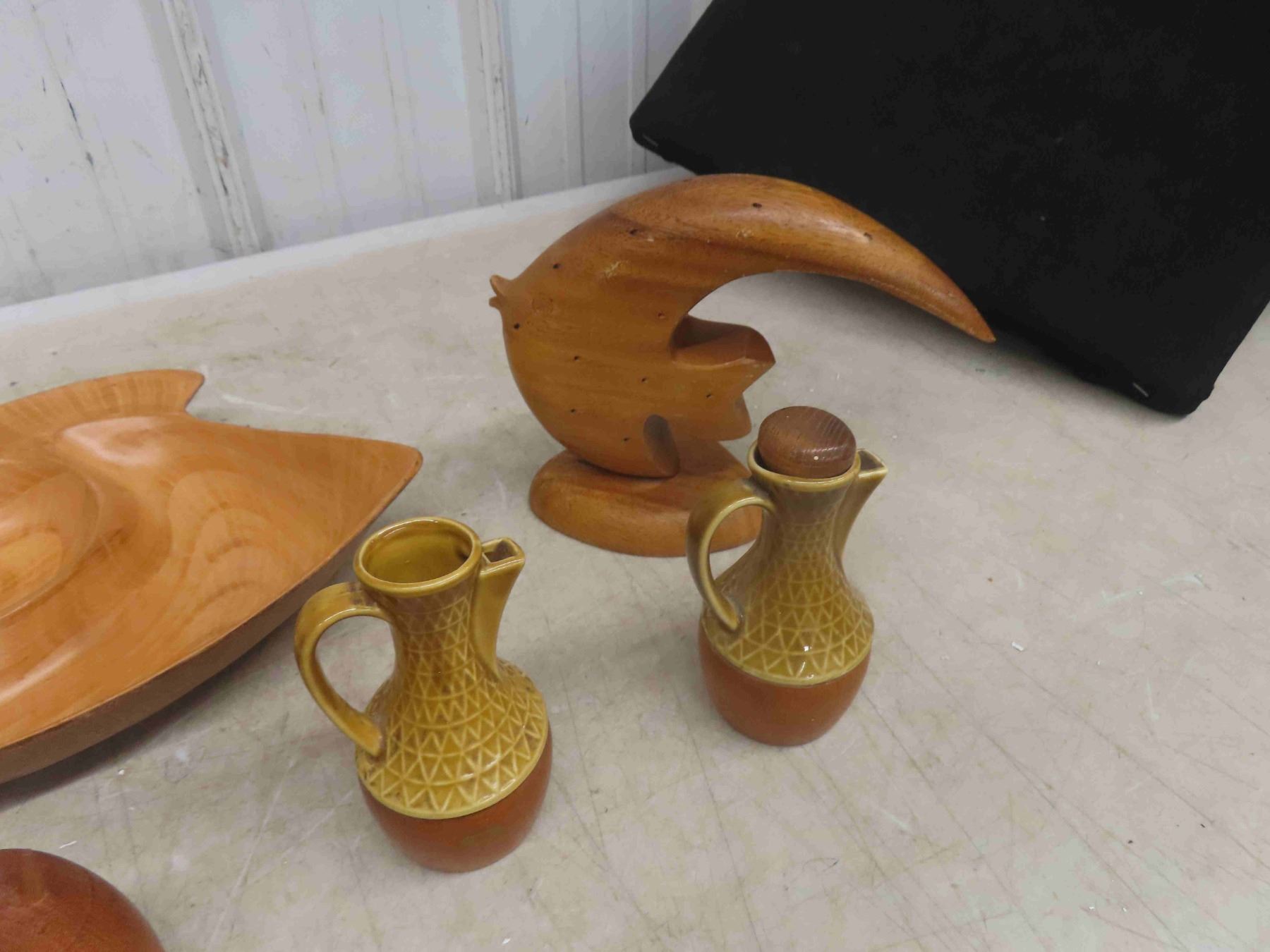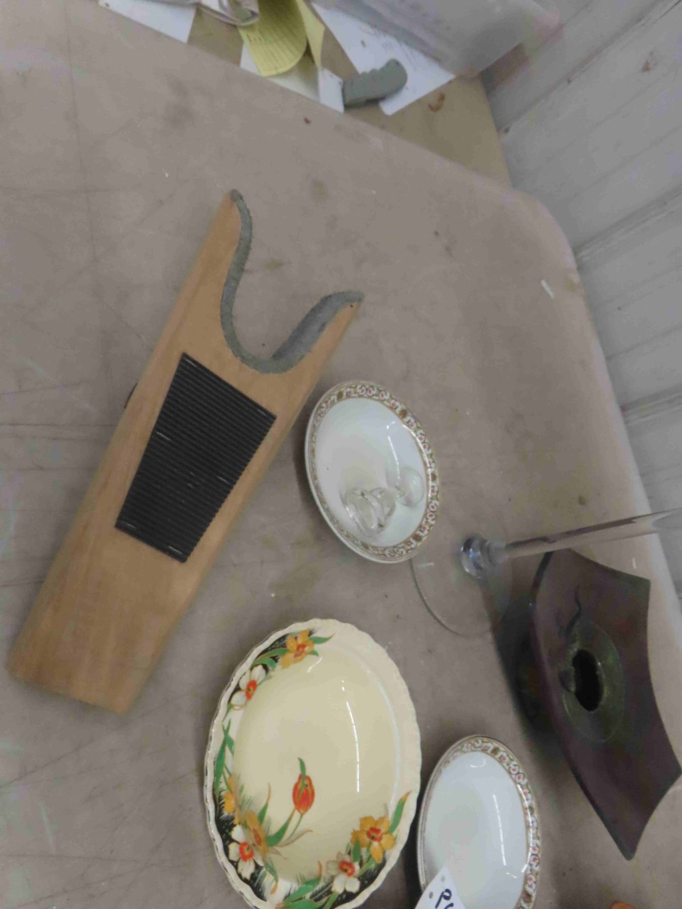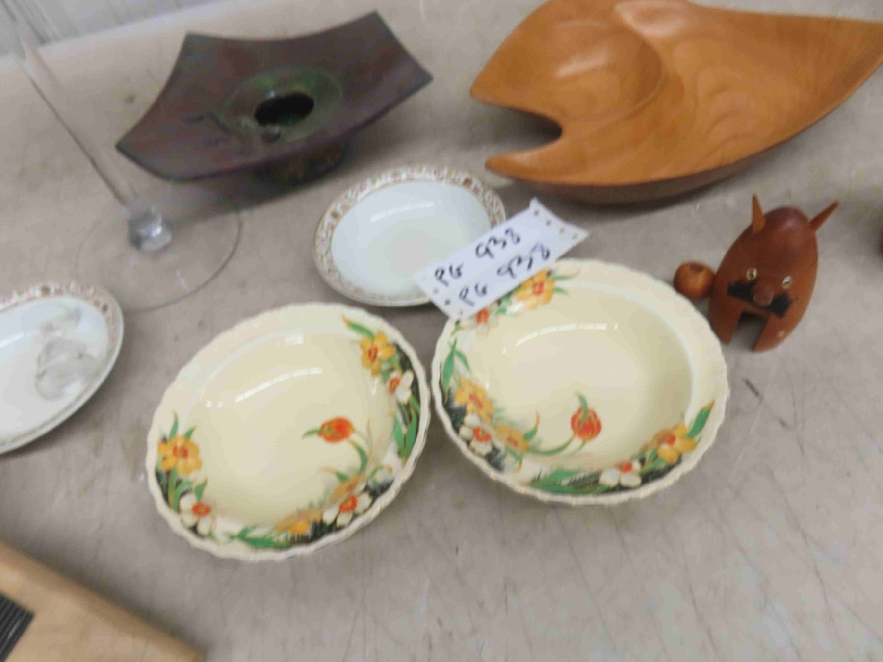 Signed Abstract Art Glass Like a Large Wine Glass Signed 'Bohn Pinaua MB' , Boot Jack for Cowboy Boots Made in Texas USA , 4 Vintage Bowls, Floral Frog, Glass Eye Cup, 5 Pottery & 2 Wood Items : Calif Pottery No Chips or Cracks, Nut Cracker, Fish Carving
