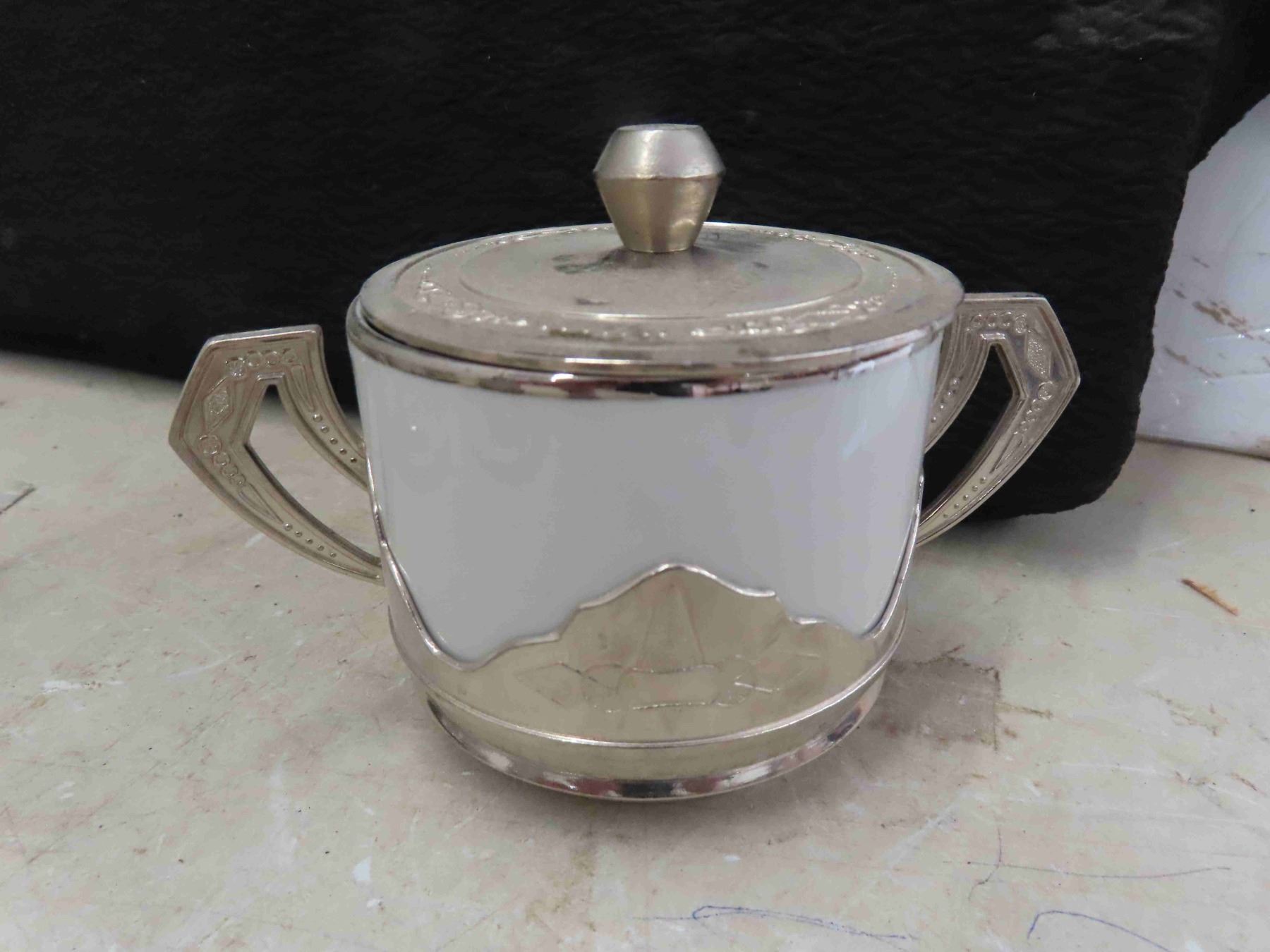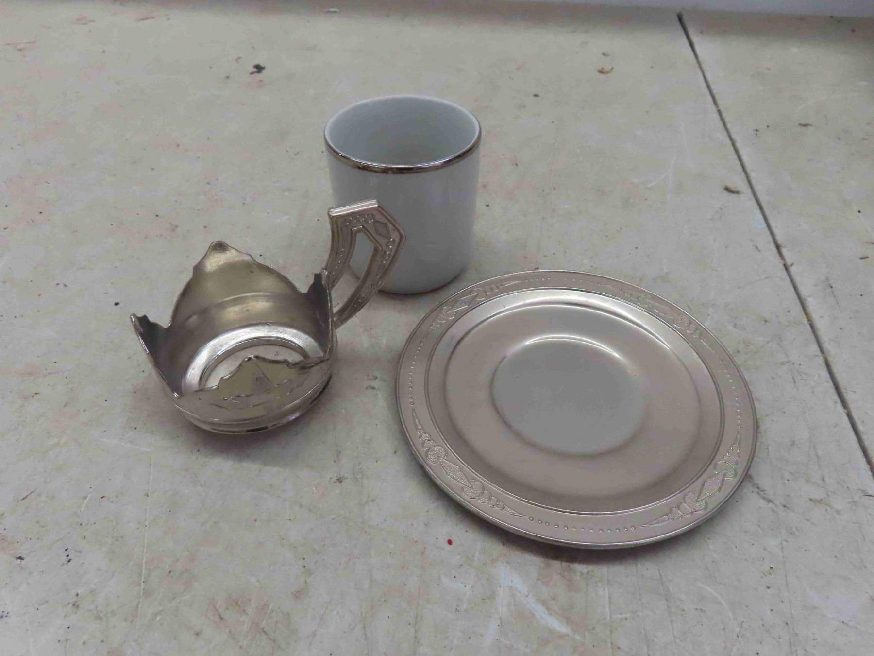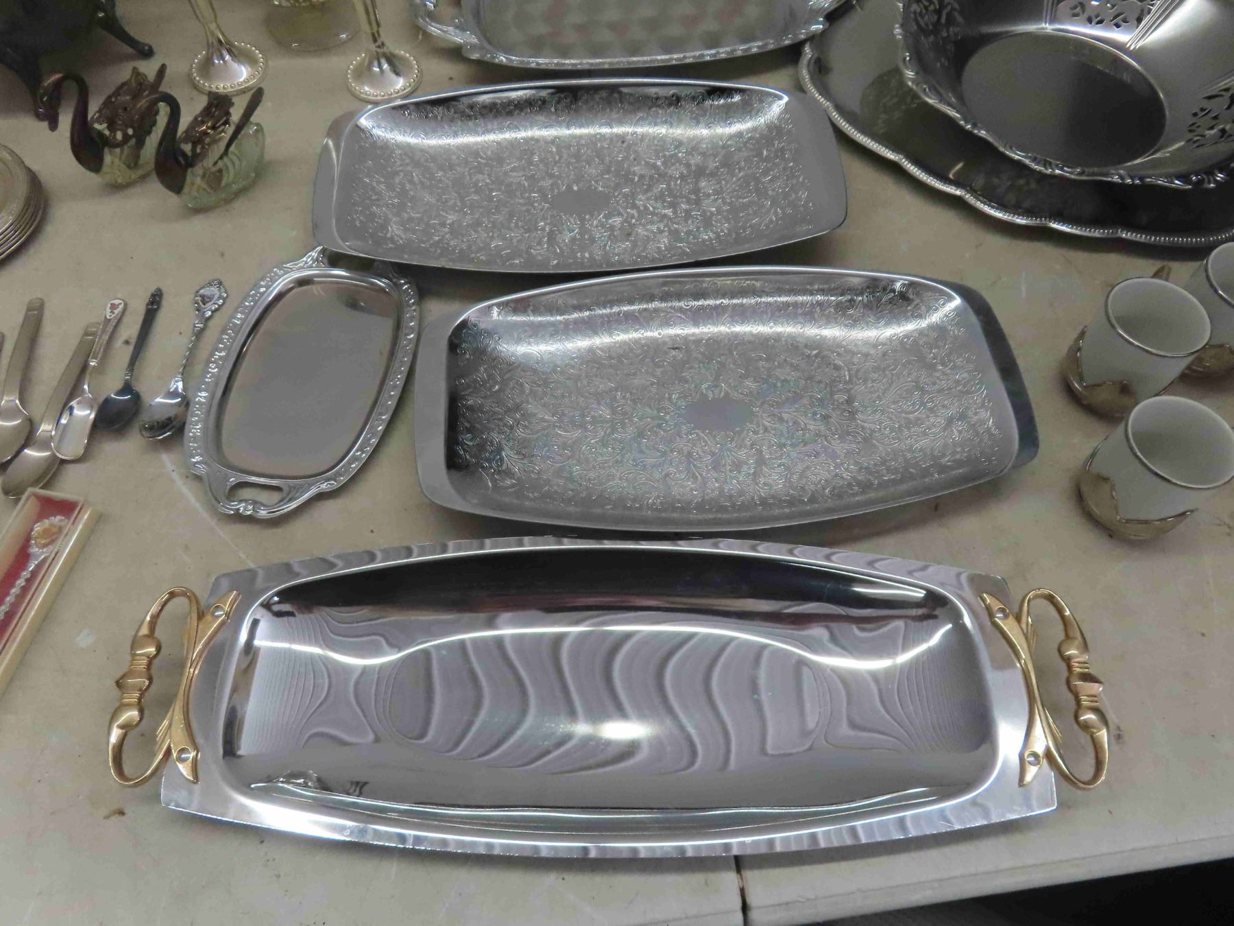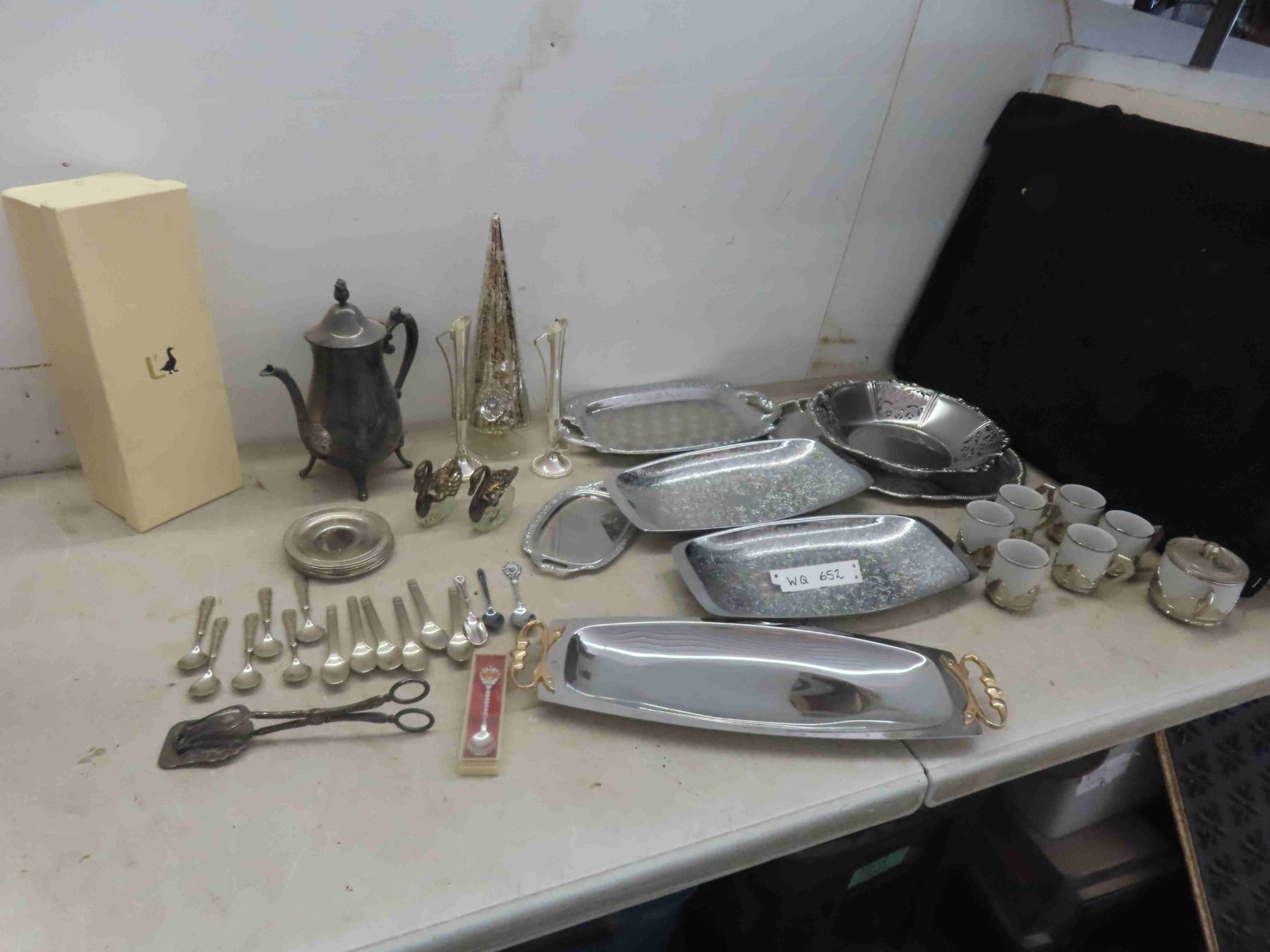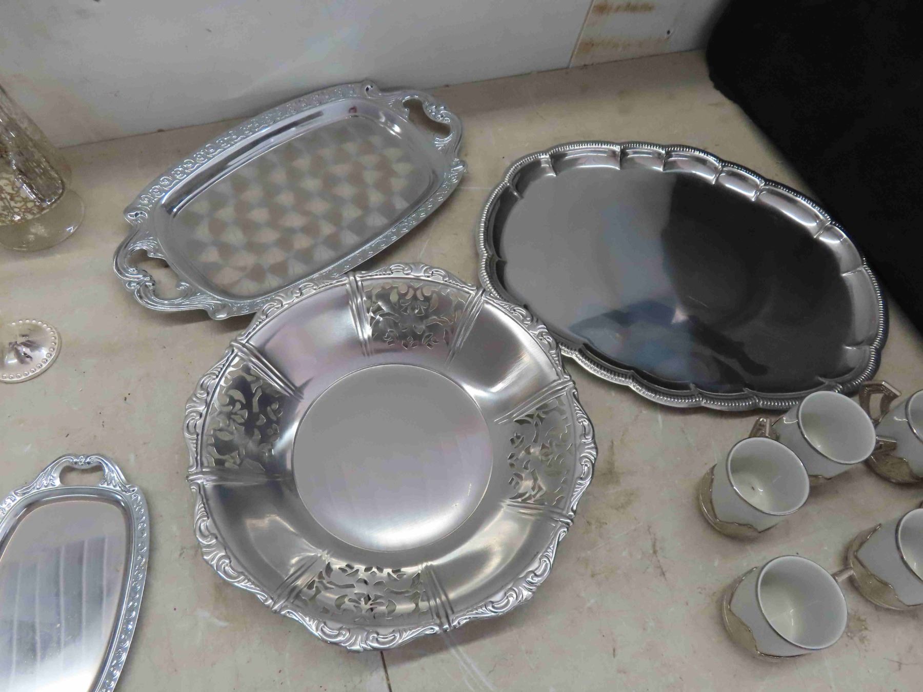 Silver Plated Serving Trays, Coffee Pot, Rose Holders, Spoons, 6 Cappacino Cups and Sugar Bowl