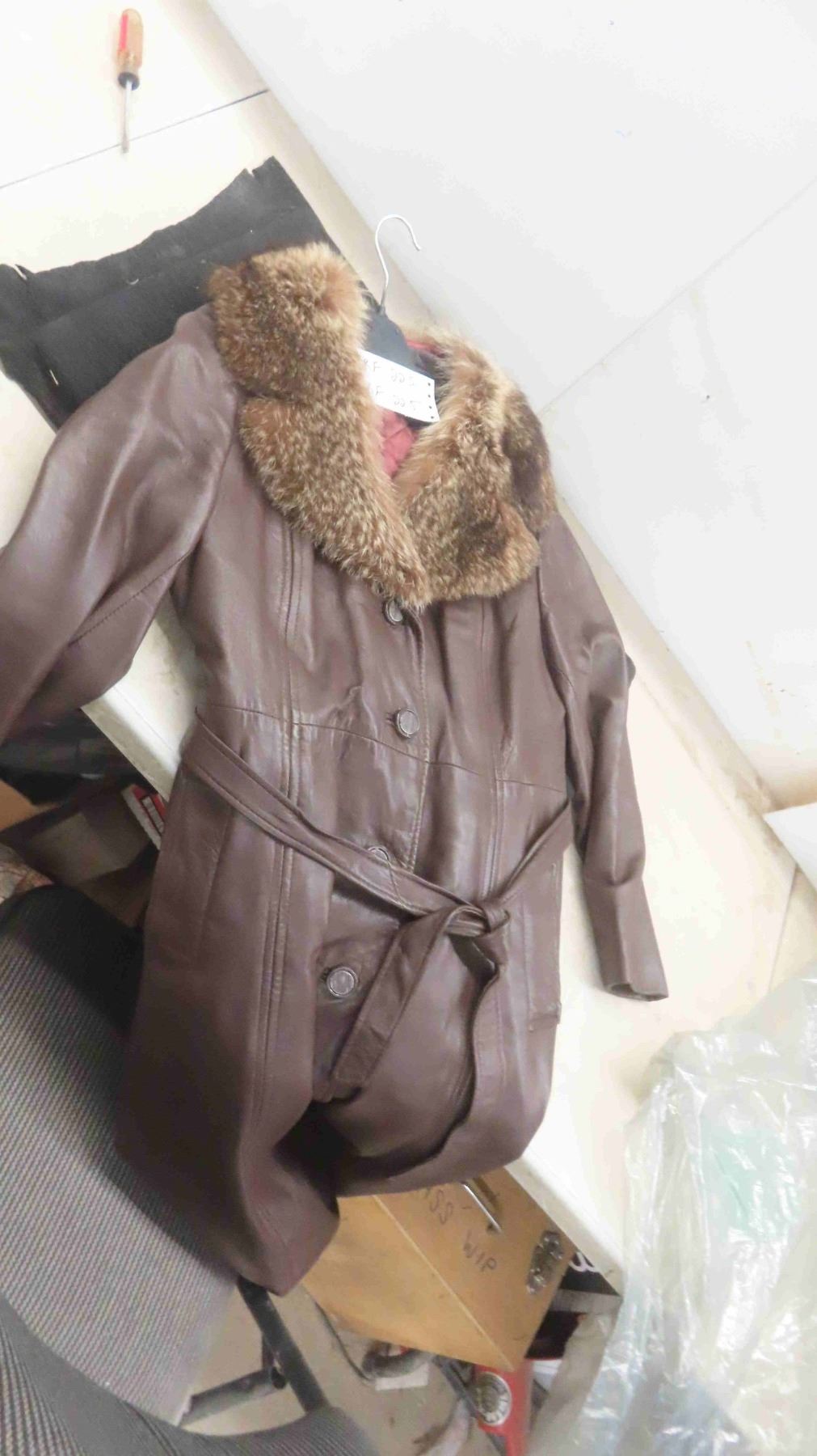 Size 16 Genuine Leather Brown Ladies Coat with Removeable Fox Collar , Zip In Zip Out Quilted Lining 3/4 Length Belt - Excellent Condition