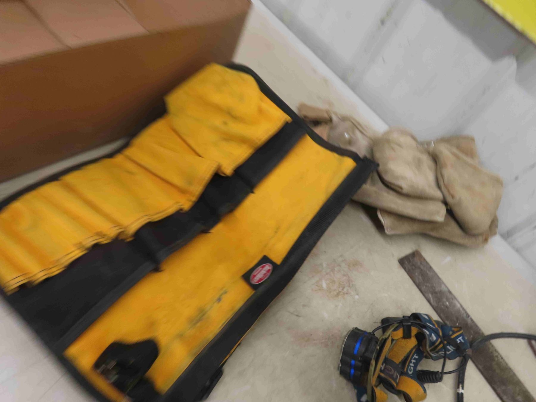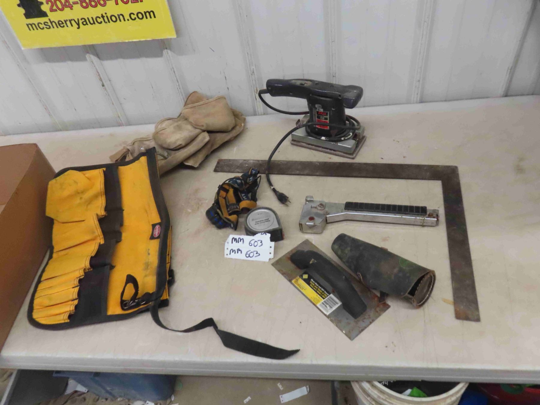 Skill Sander, Greenlee Knock Out Punches, 5 Gal Pail Tool Organizer, Tool Pouch, Headband Light, Square, Glue Trowel, 26' Tape Measure, Hammer Stapler