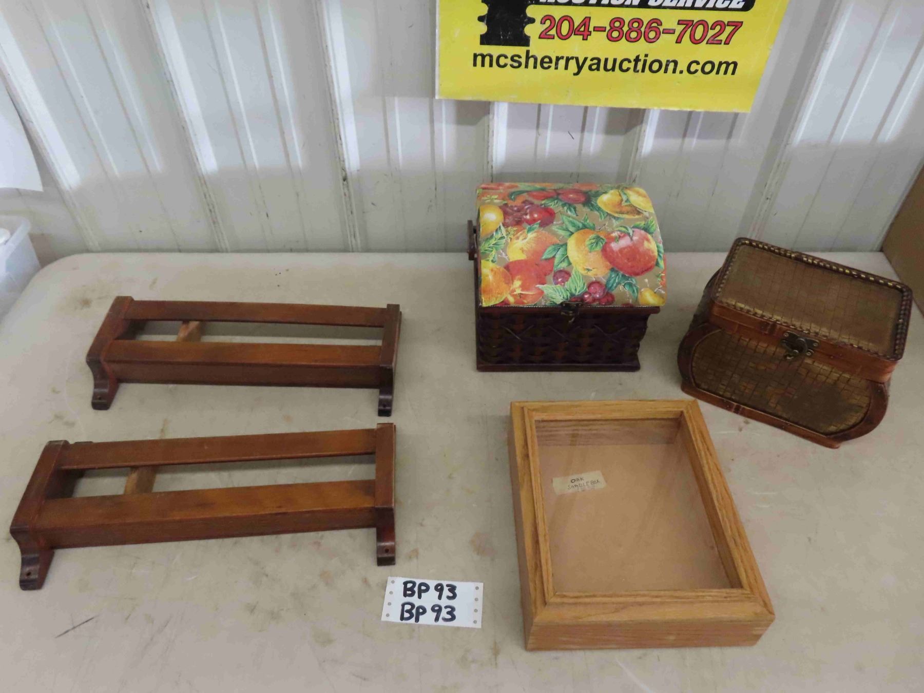 Small Oak Shadow Box 9.5" x 11" & 2 Church Pew Bible Holders 16" Wide, 2 Small Sewing Boxes
