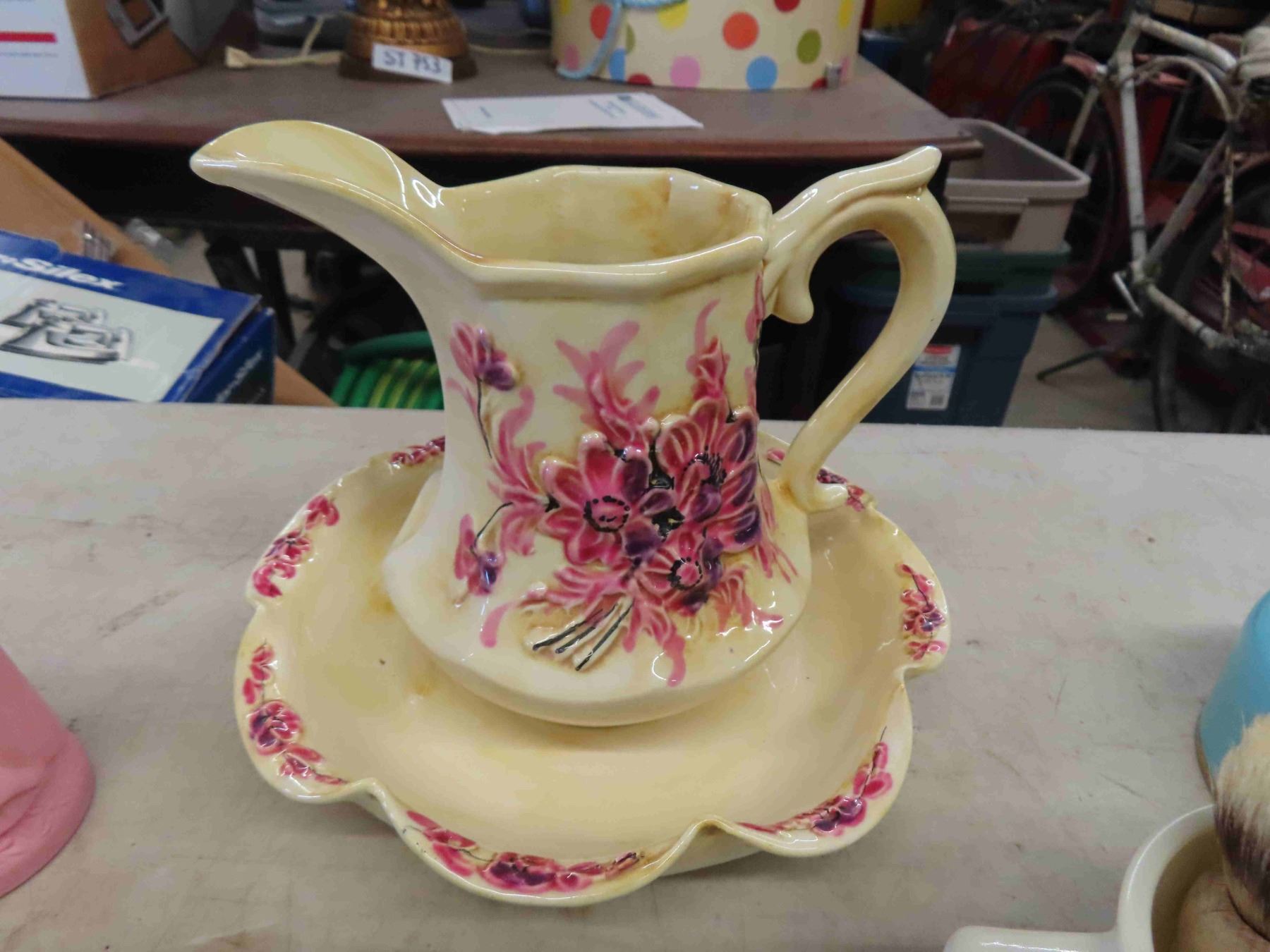 Small Porcelain China Wash Jug + Basin, Travel Iron, Dresser Brush + Mirror set,