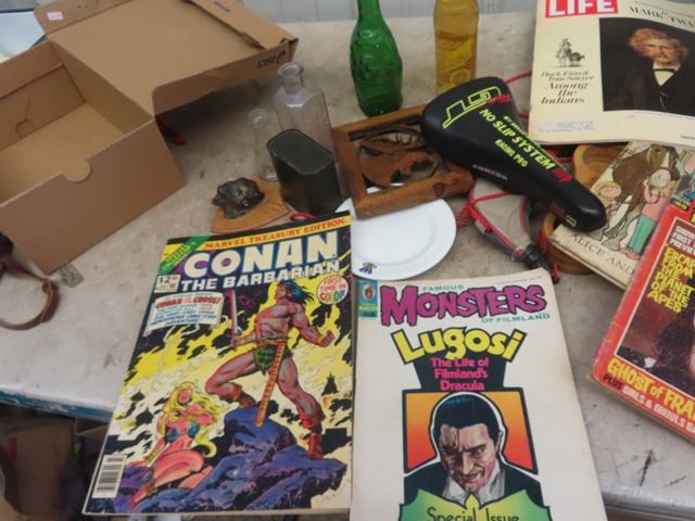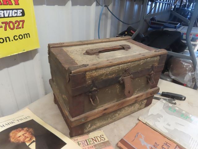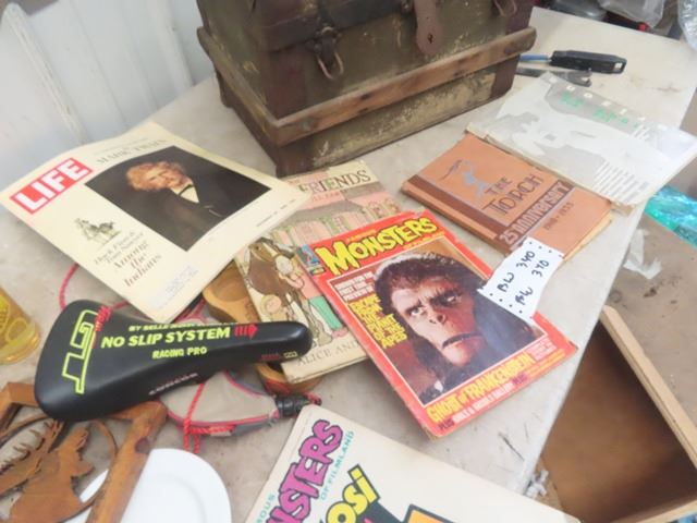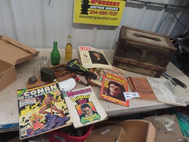 Small Trunk 12" x 17" x 10.5" , Nesbit Pop Bottles Military Fuel Can, Magazines 1971+72 plus more