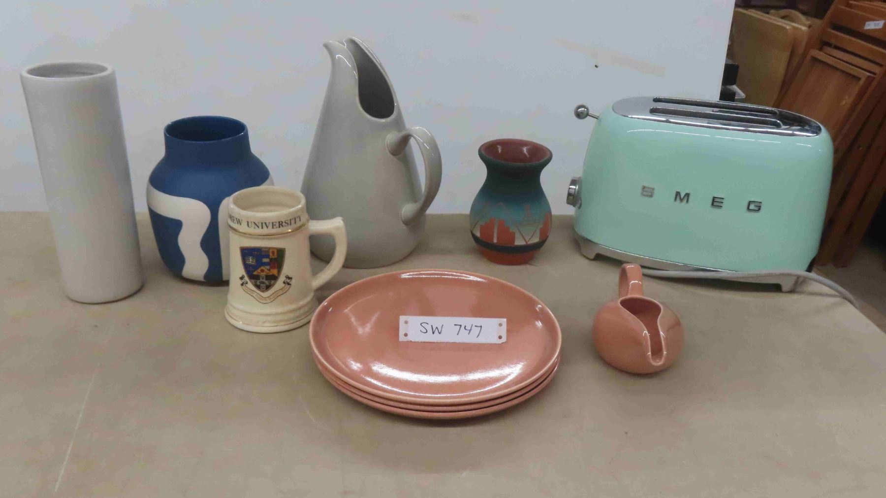 Smeg Toaster , Vases , Russel Wrights Pitcher, 3 Plates , Creamer
