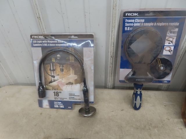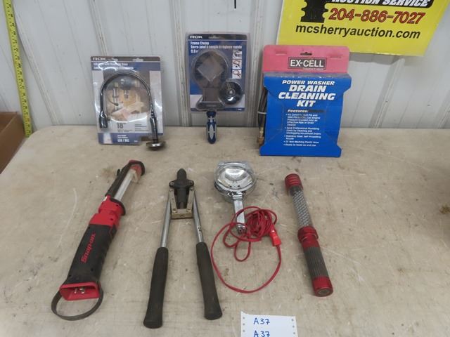 Snap On Plug in Light, Snap On Battery Operated LED Light, Chrome 12V Spot Light, Frame Clamp, Power Washer Drain Cleaning Kit, Big Daddy Riveter