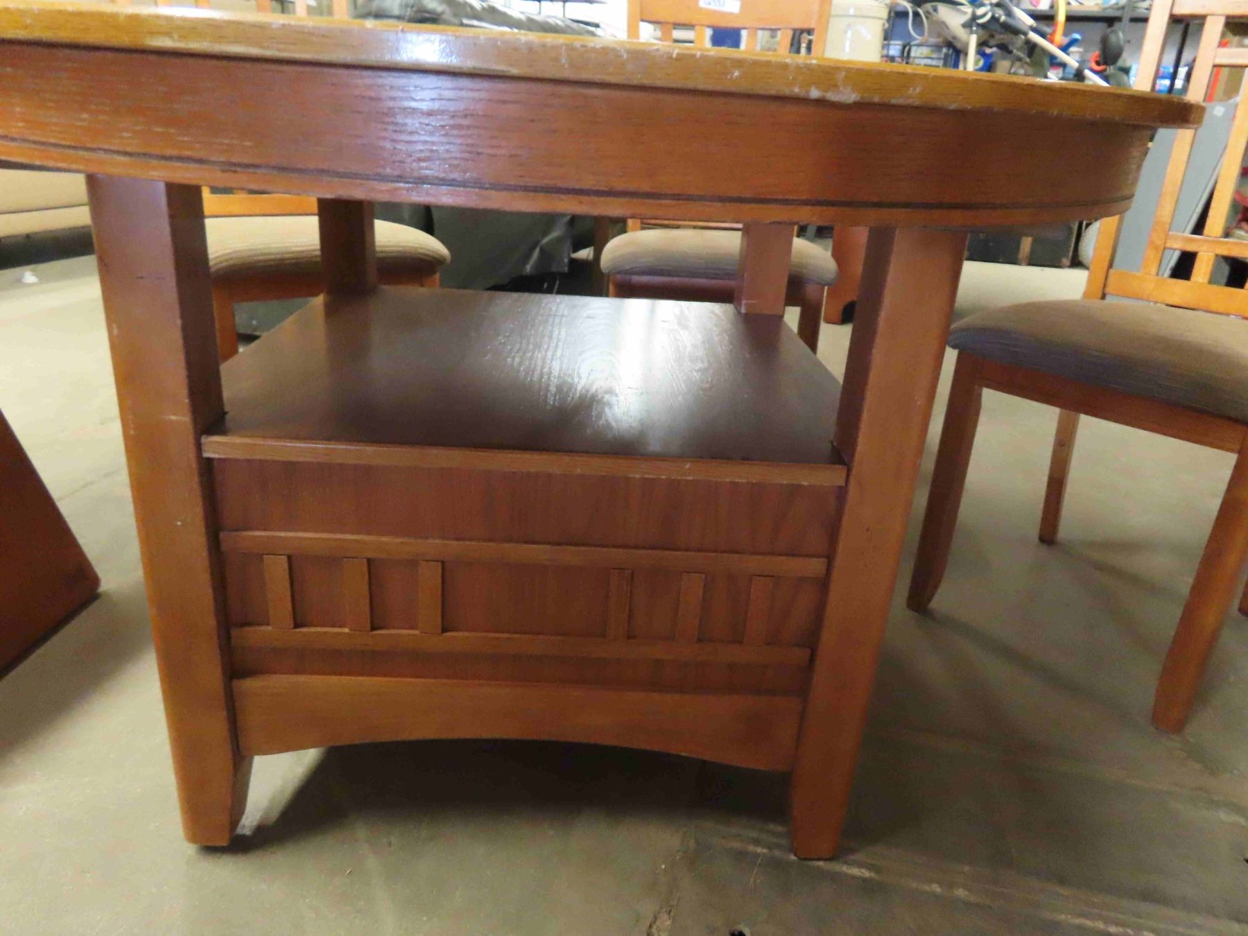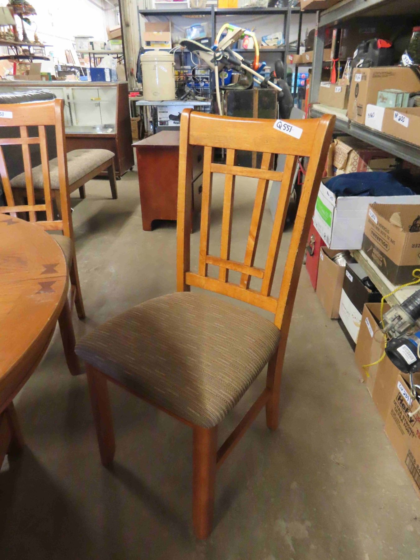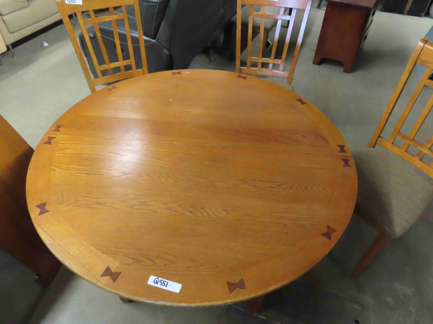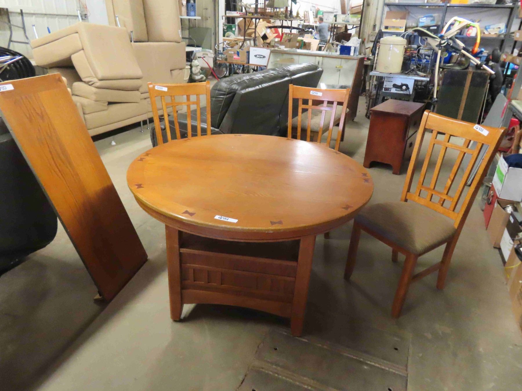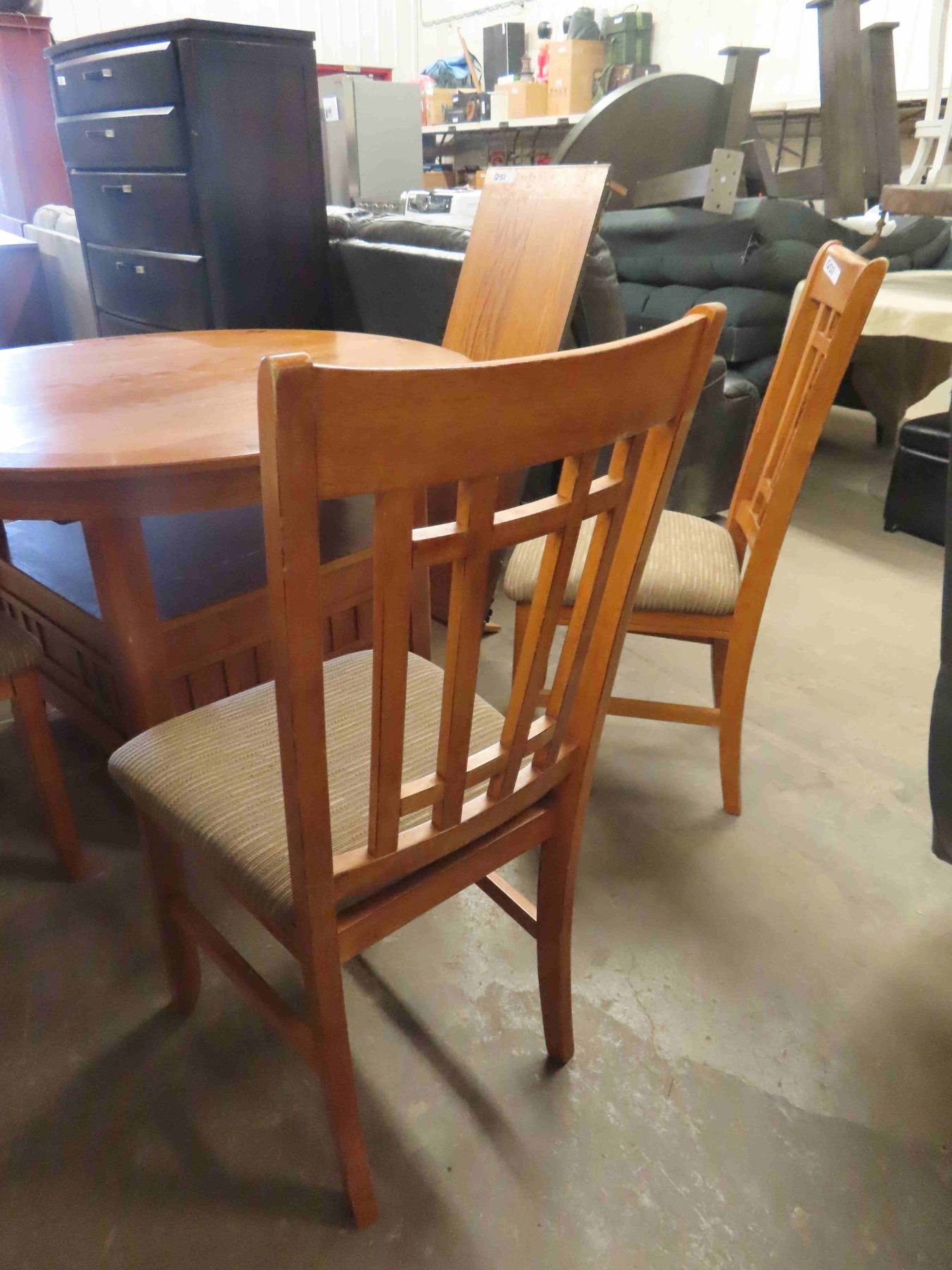 Solid Oak Round Dinner Table 31" x 48" with (1) 18" Leaf - Shel Style Pedestal & 3 Chairs