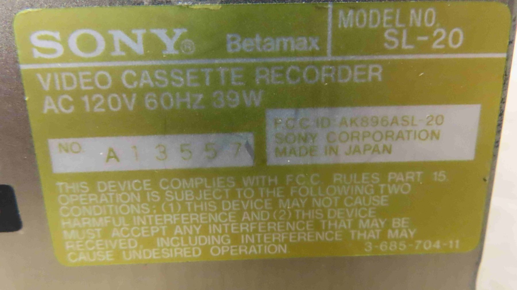 Sony Betamax Model SL-20 Video Cassette Recorder