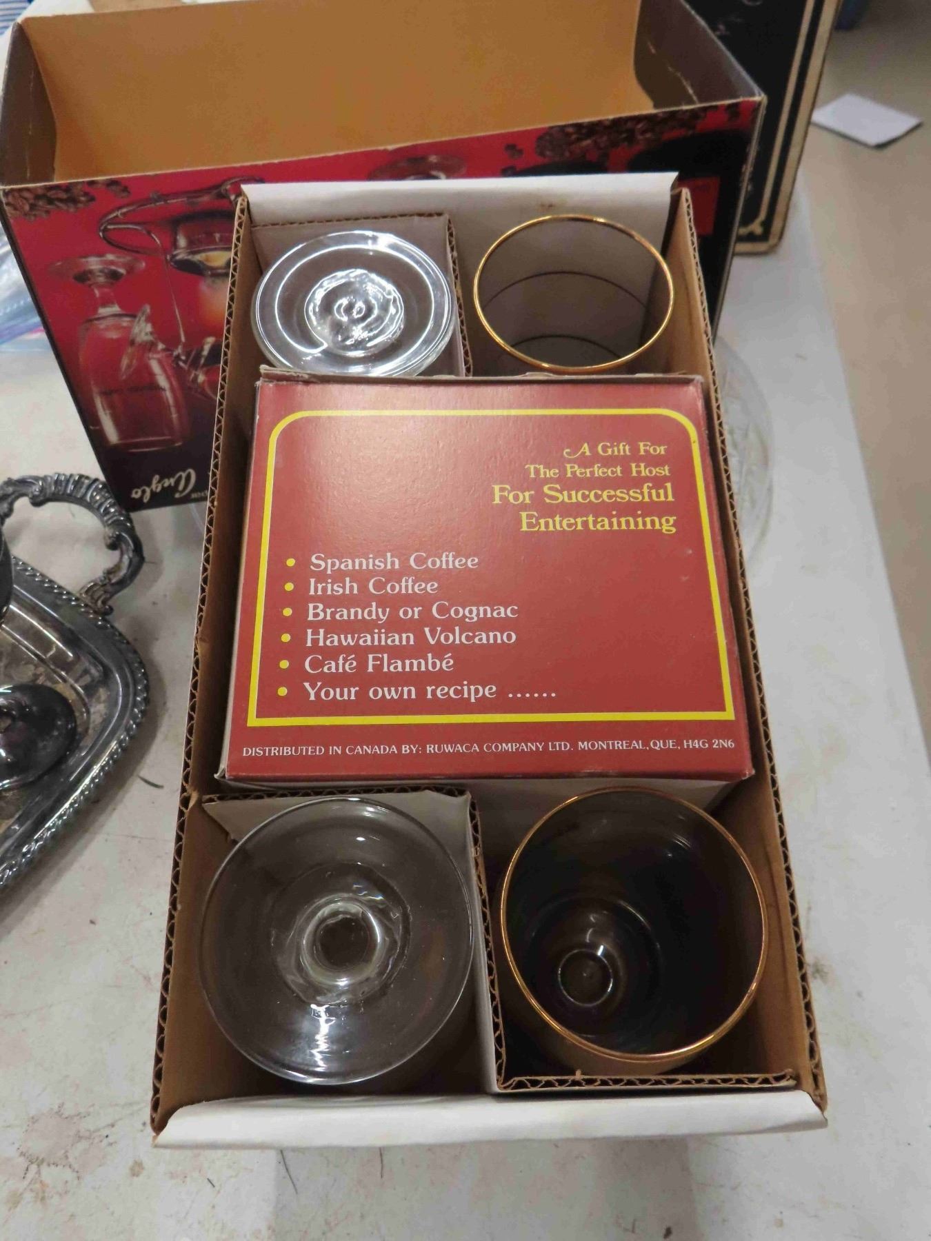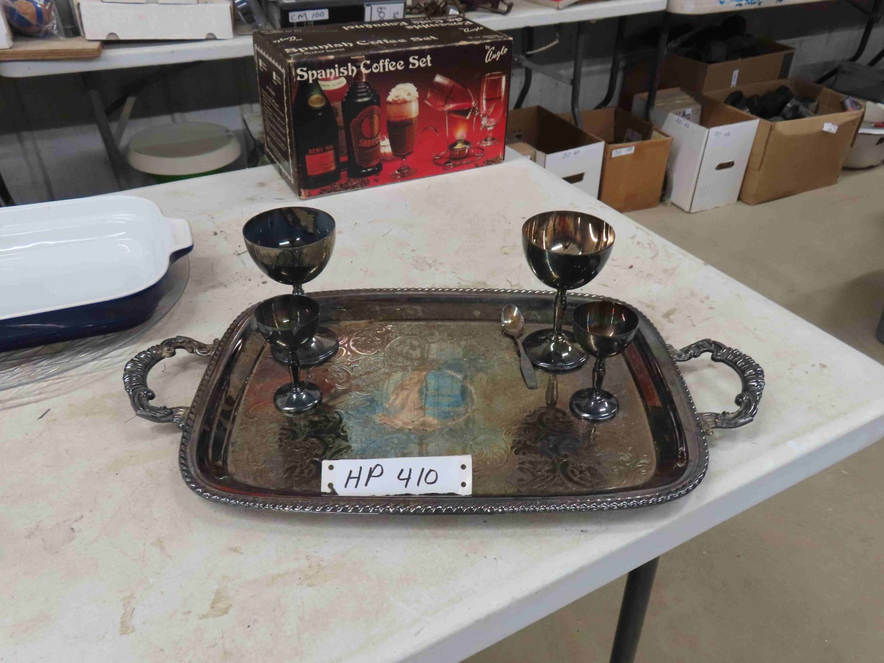 Spanish Coffee Set, Glass Punch Bowl Set, Silverware + 25th Anniversary Silver Plated Tray + Goblets