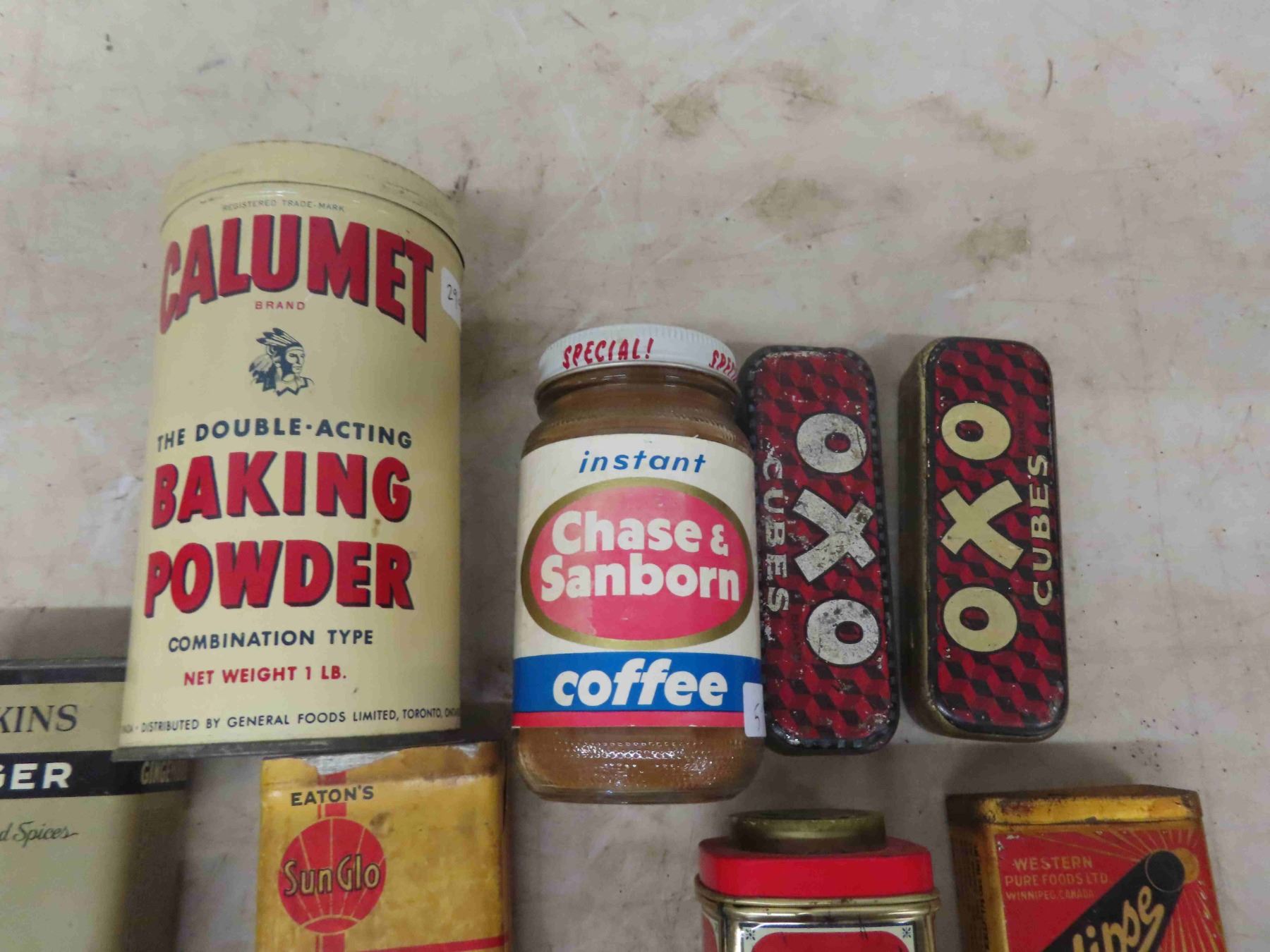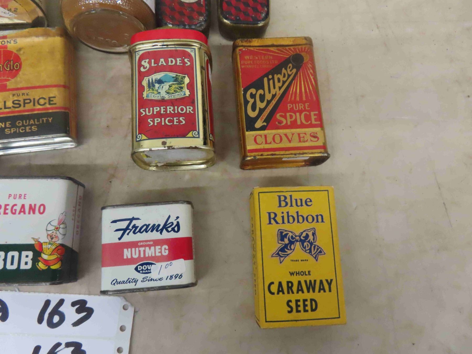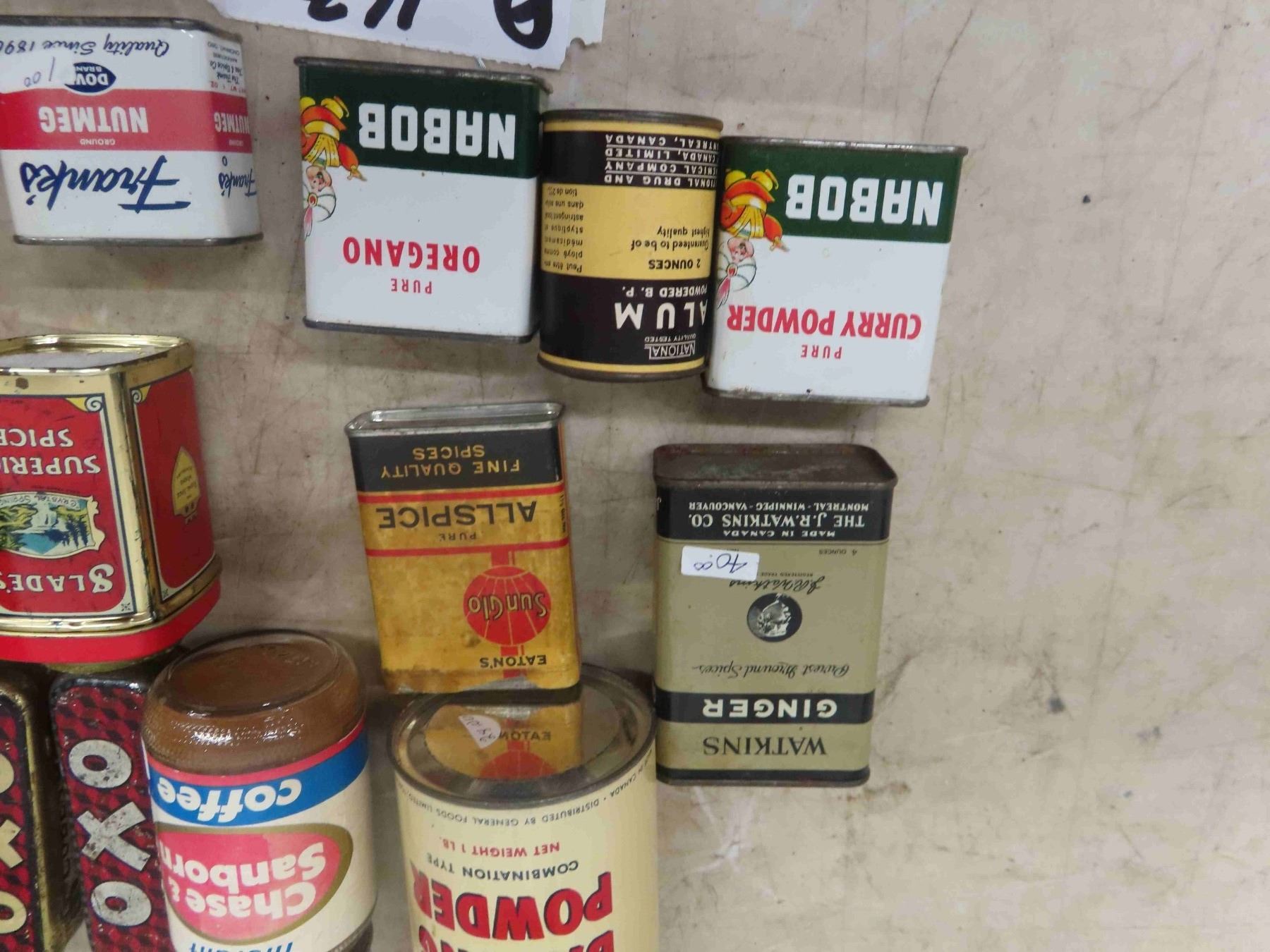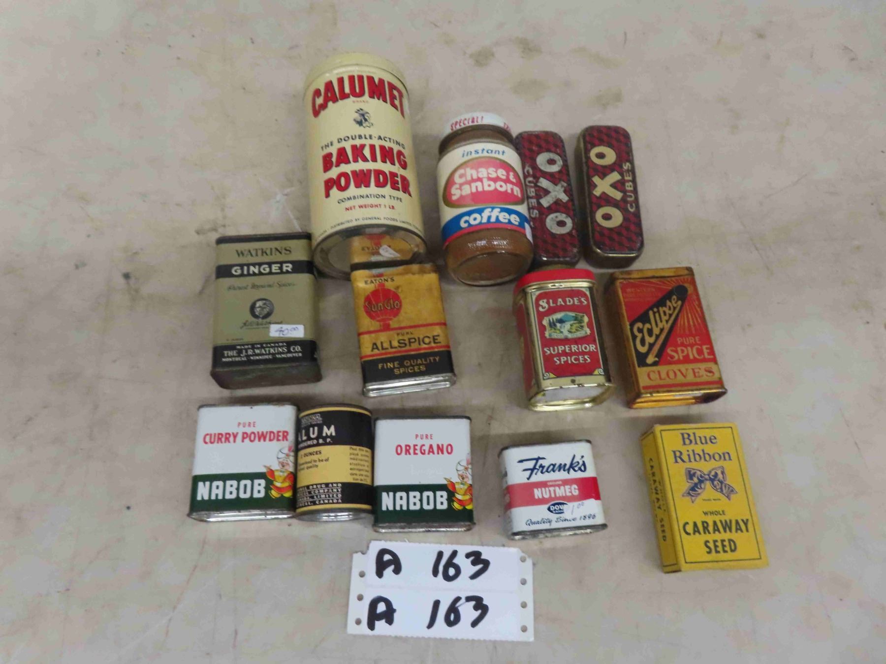Spice Tins ; Baking Powder, Blue Ribbon, Nabob, Slade's, Calumet, Watkins, plus others