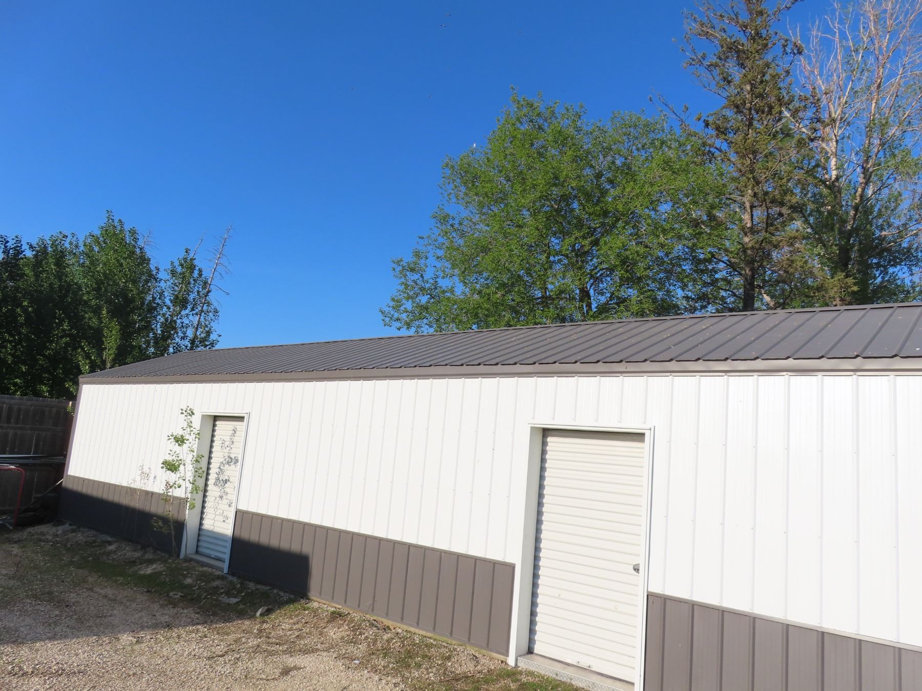 Steel Clad Storage Building (4 Years Old) 60.5ft Long x 14ft Wide x 12.5ft Peak with 9ft x 10ft Overhead Garage Door on End & 2 Side Roll Up Doors 4ft x 7ft , Built on Treated 6'' x 6'' Boards Wired with Light, Plugs & Switches. White Color with Charcoal Color Trim. 5% Buyers Fee. MUST BE REMOVED FROM SITE BY JULY 15TH. Contact Orval for Viewing Arrangements : 204-799-2264