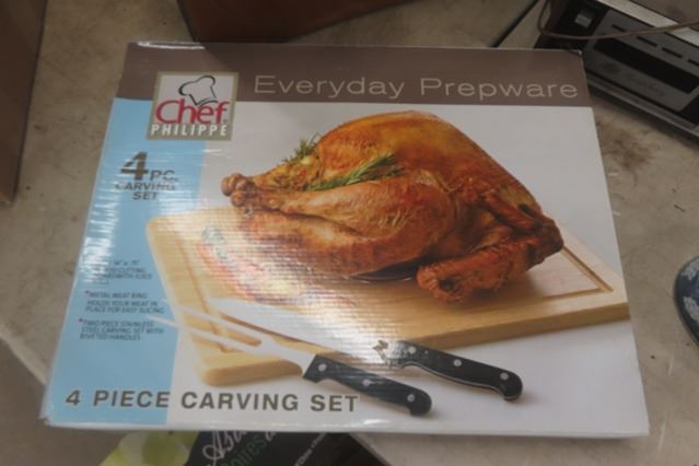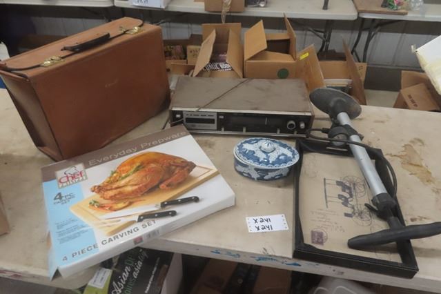 Stereo Receiver, Leather Case with Handle, 4 pc Carving Set, Bike Pump