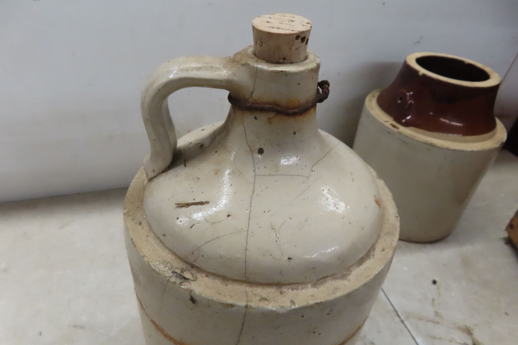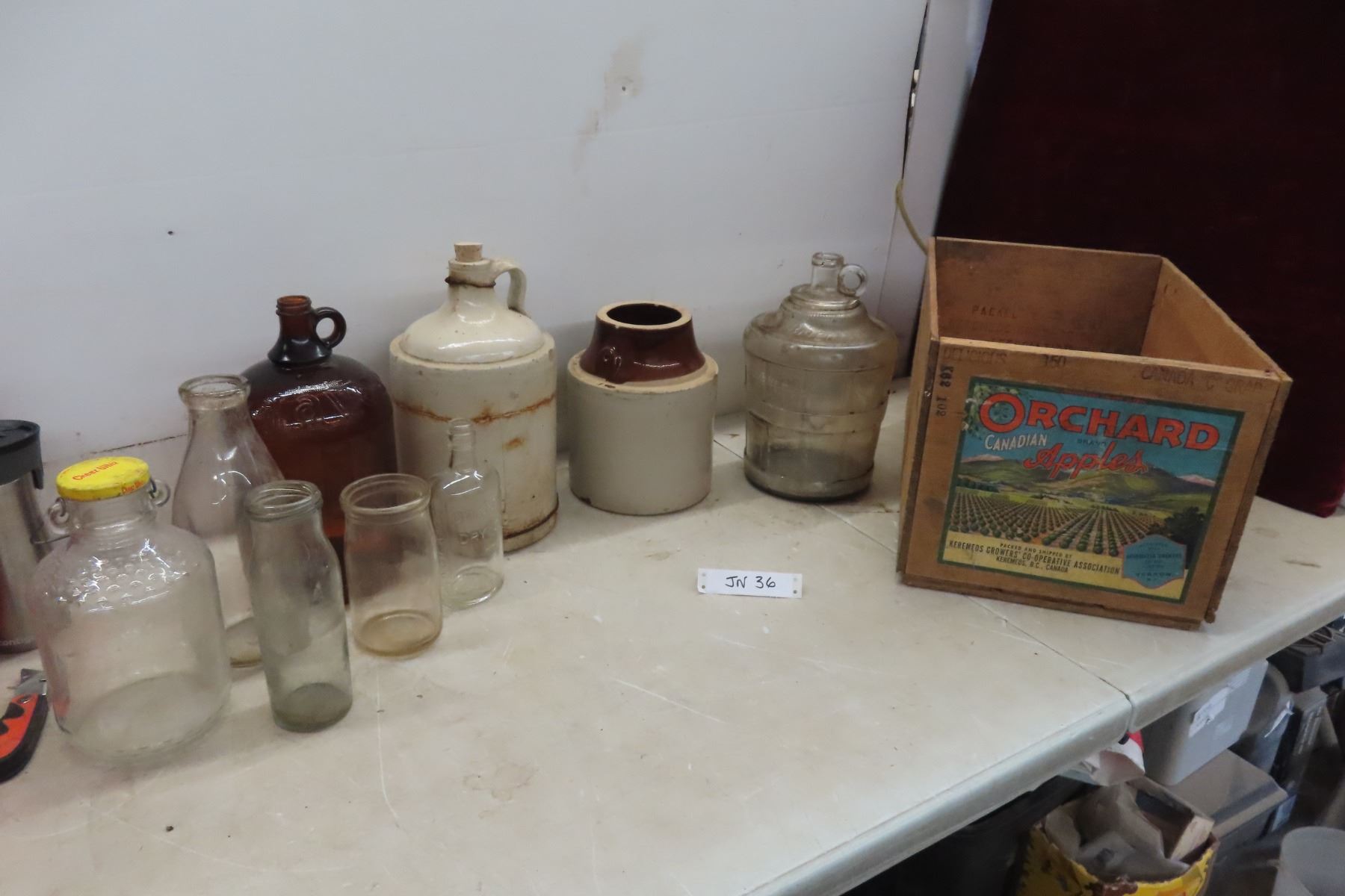 Stoneware Finger Jug, Pickle Crock Both With Damage, Vintage Bottles, Javex, Brights, Milk Bottles and Crate