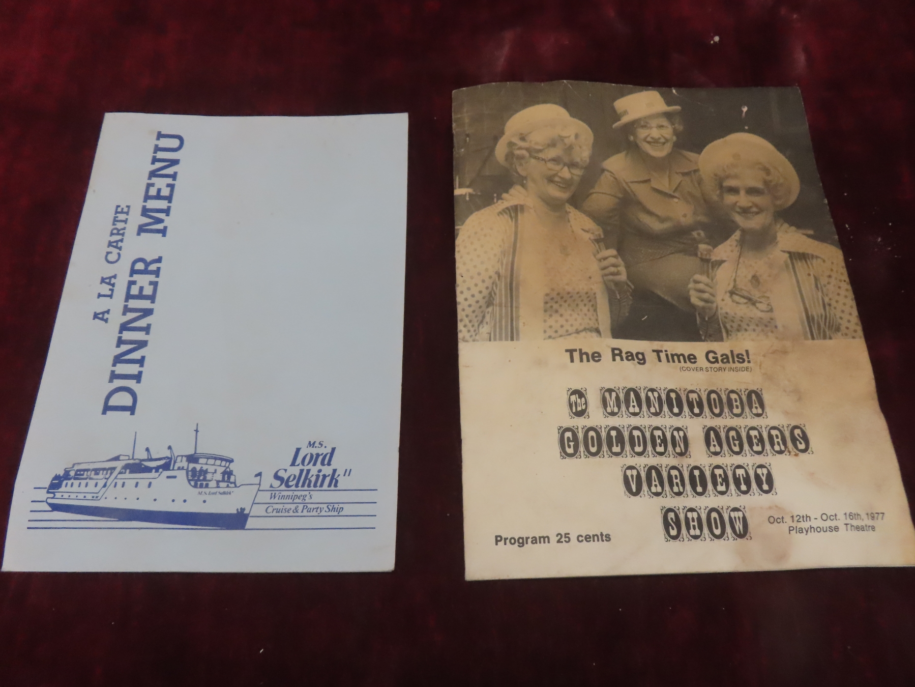 Stoneware Finger Jug with Minor Handle Damage, Five Soup Spoons, Lord Selkirk Dinner Menu, and Program for The Ragtime Gala