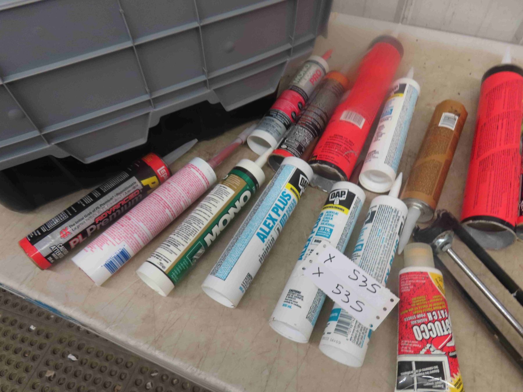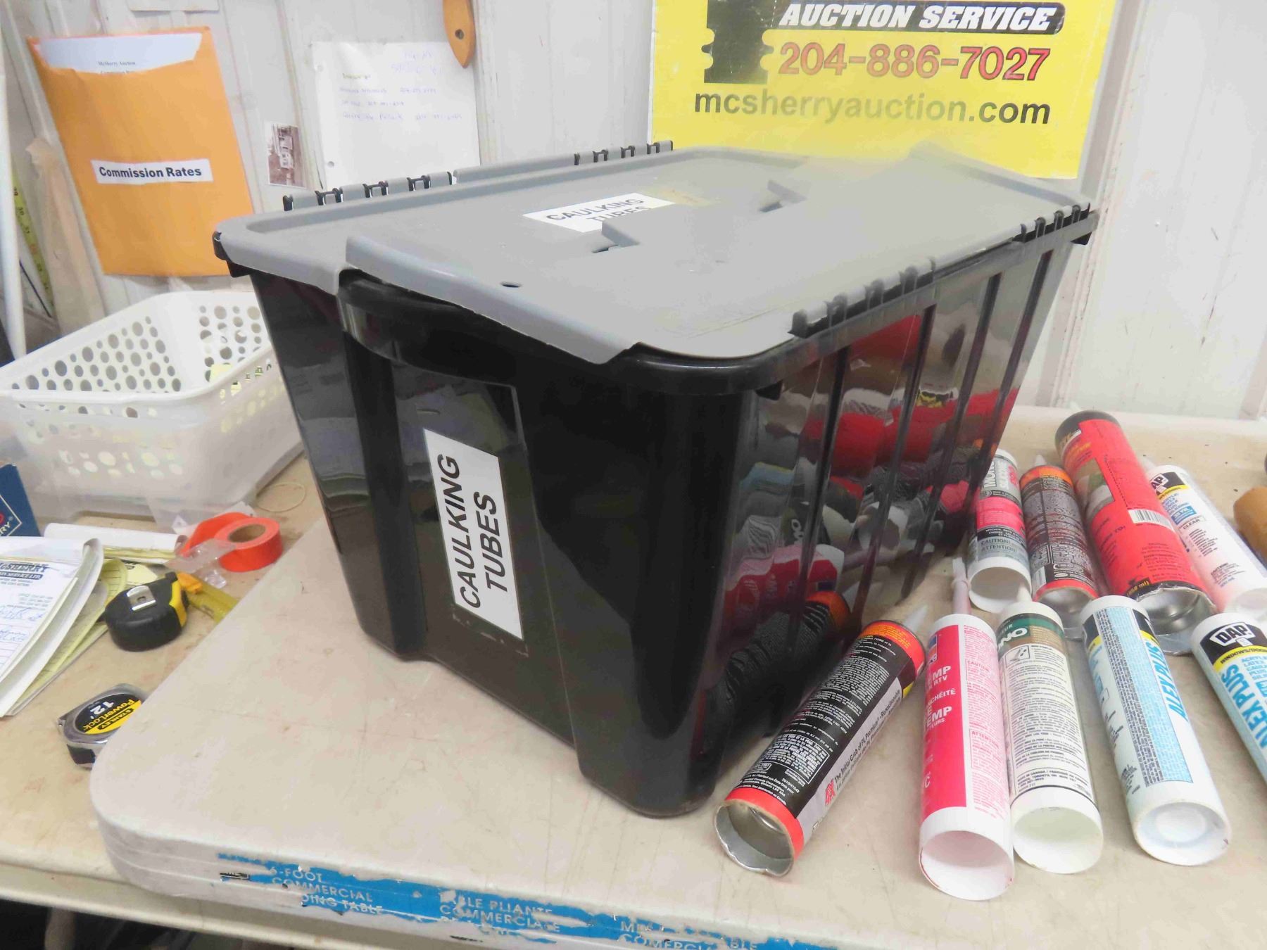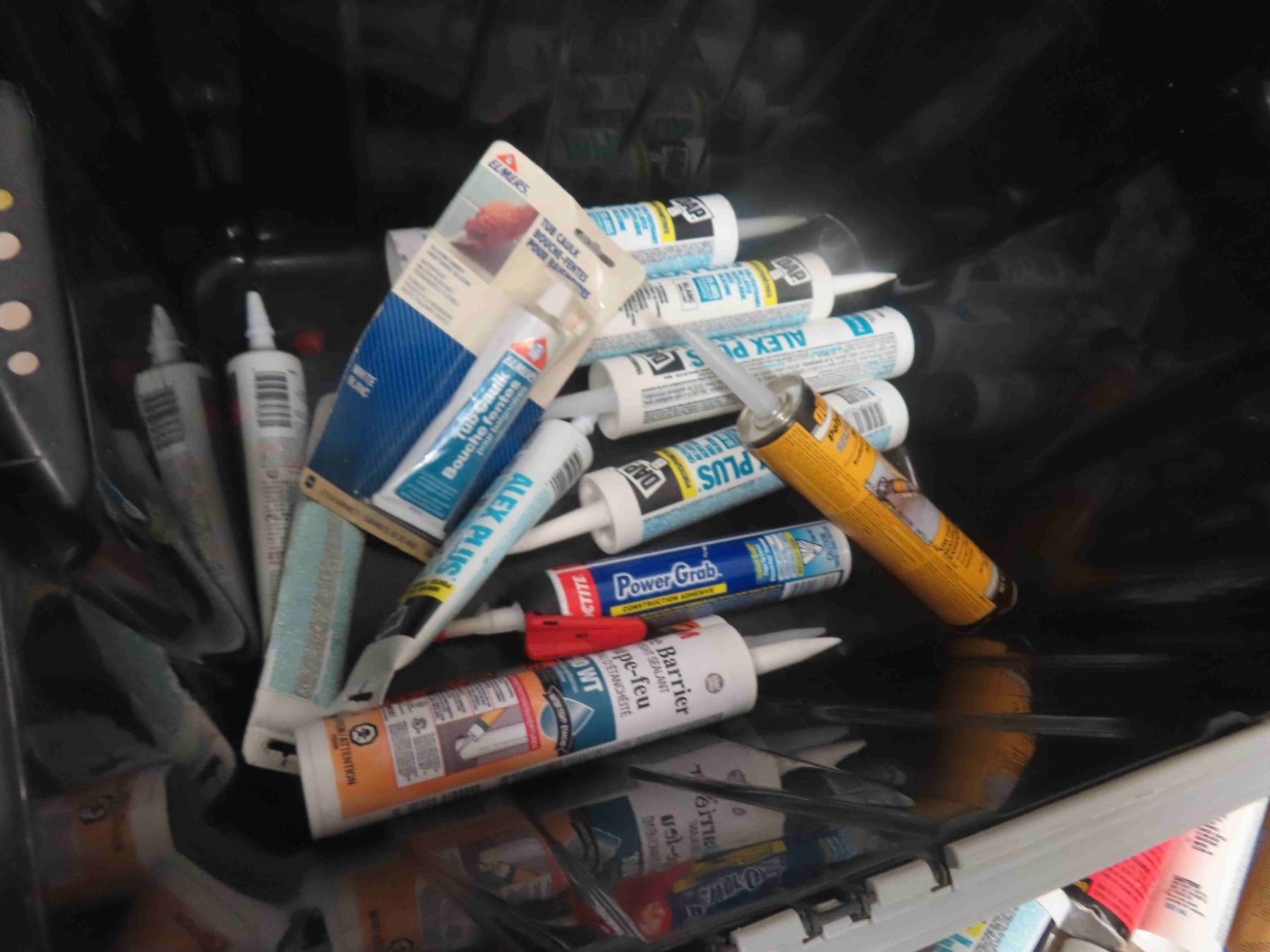 Storage Tub Full of Caulking Tubes + Caulking Guns