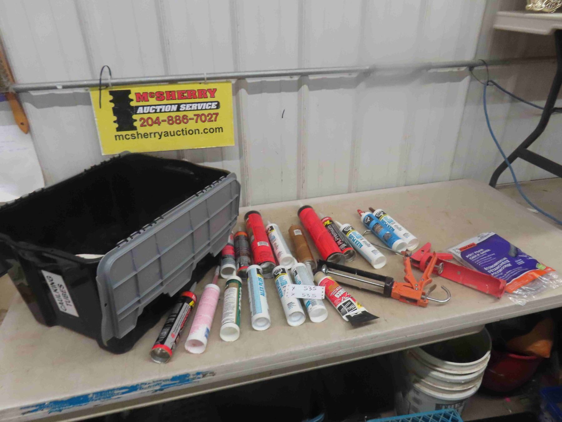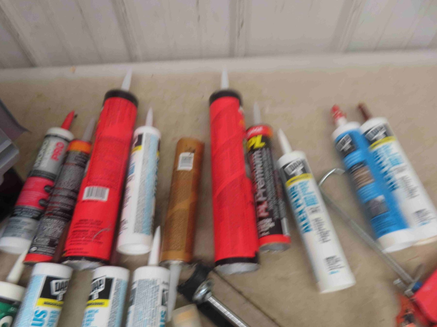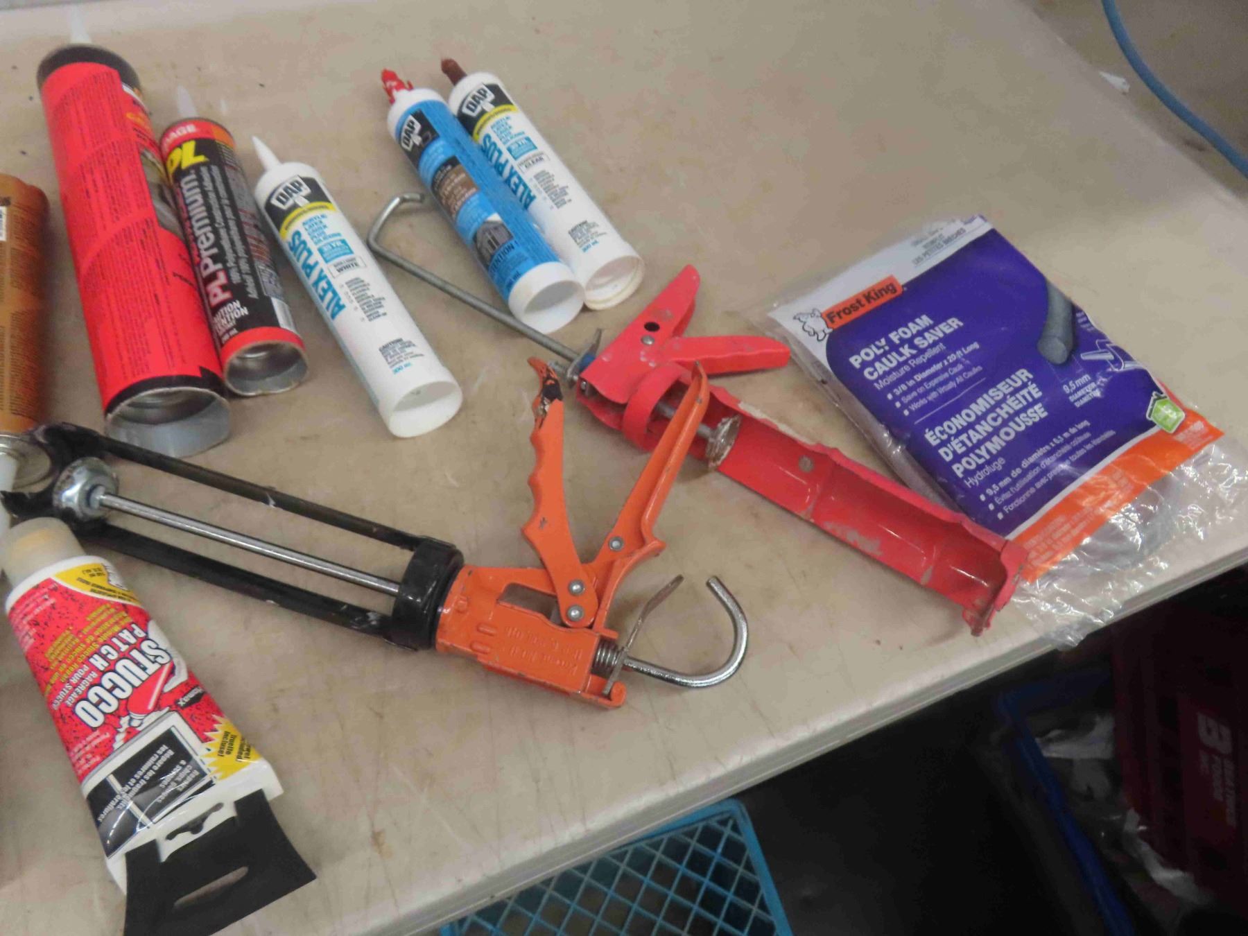 Storage Tub Full of Caulking Tubes + Caulking Guns