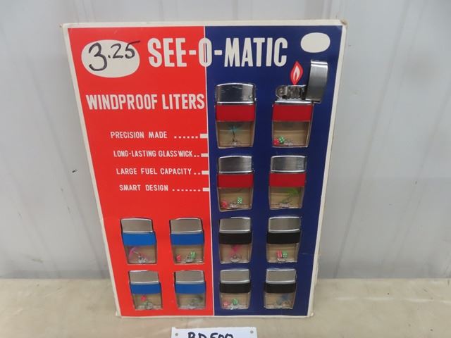 Super Cool See-O-Matic Windproof Lighters Cardboard with Easel Back Counter Display- Comes with 12 New Old Stock Original Lighters- 2 Styles: Dice + Fly Fishing Hook 10"×14"
