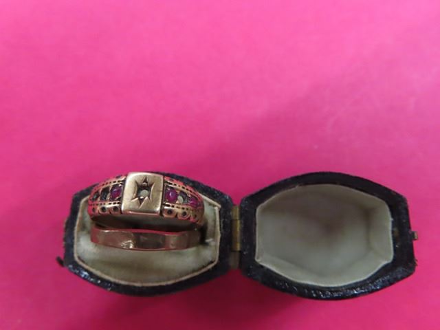 Super Vintage Great Grandma Bessies Gold- Unknow Karatt-Wedding Band Set w Rubies? Bands are cut w Original Box & Small Pearl ? Inside, A Real Treasure Find! 2.73 Grams Approx