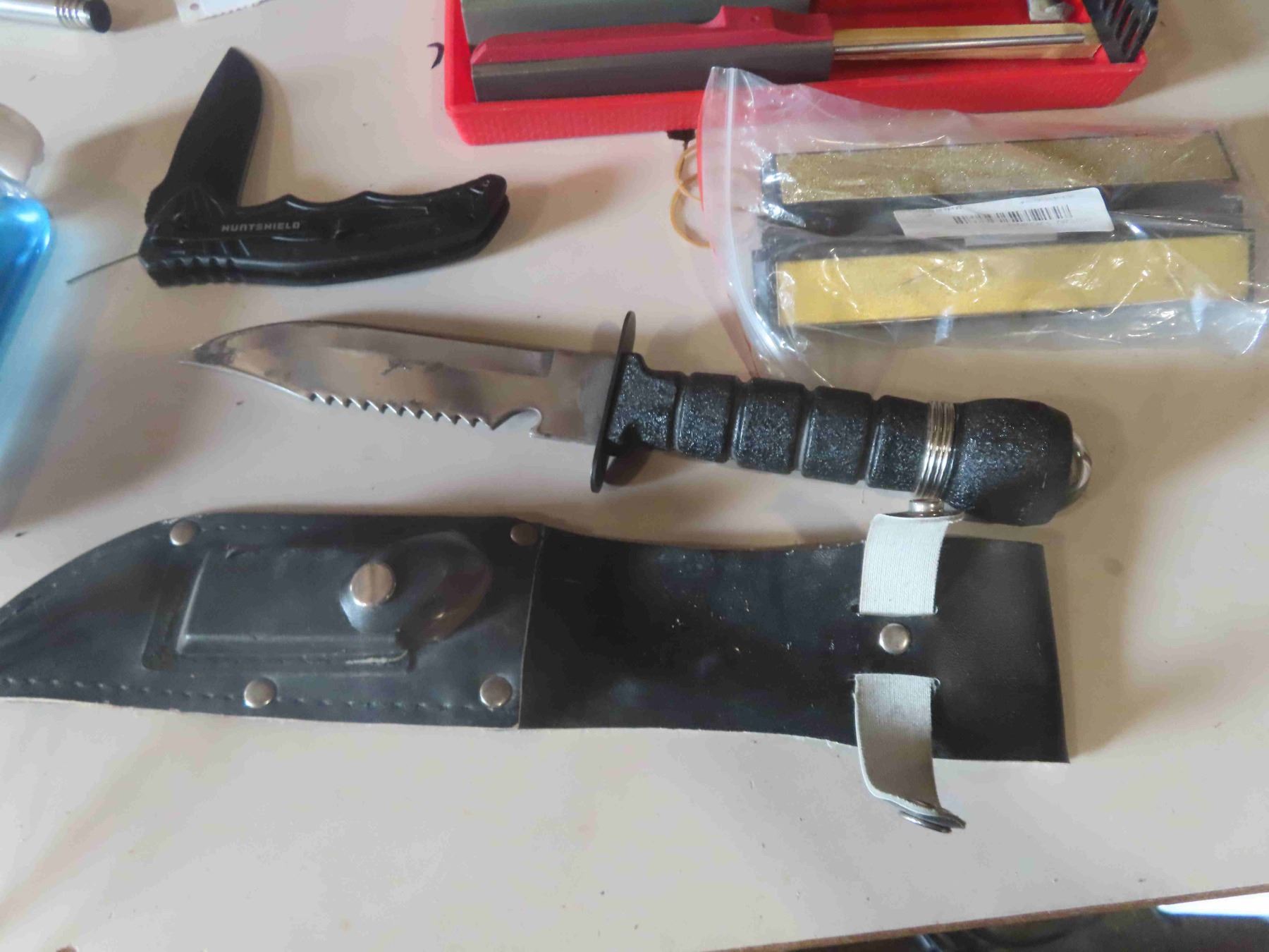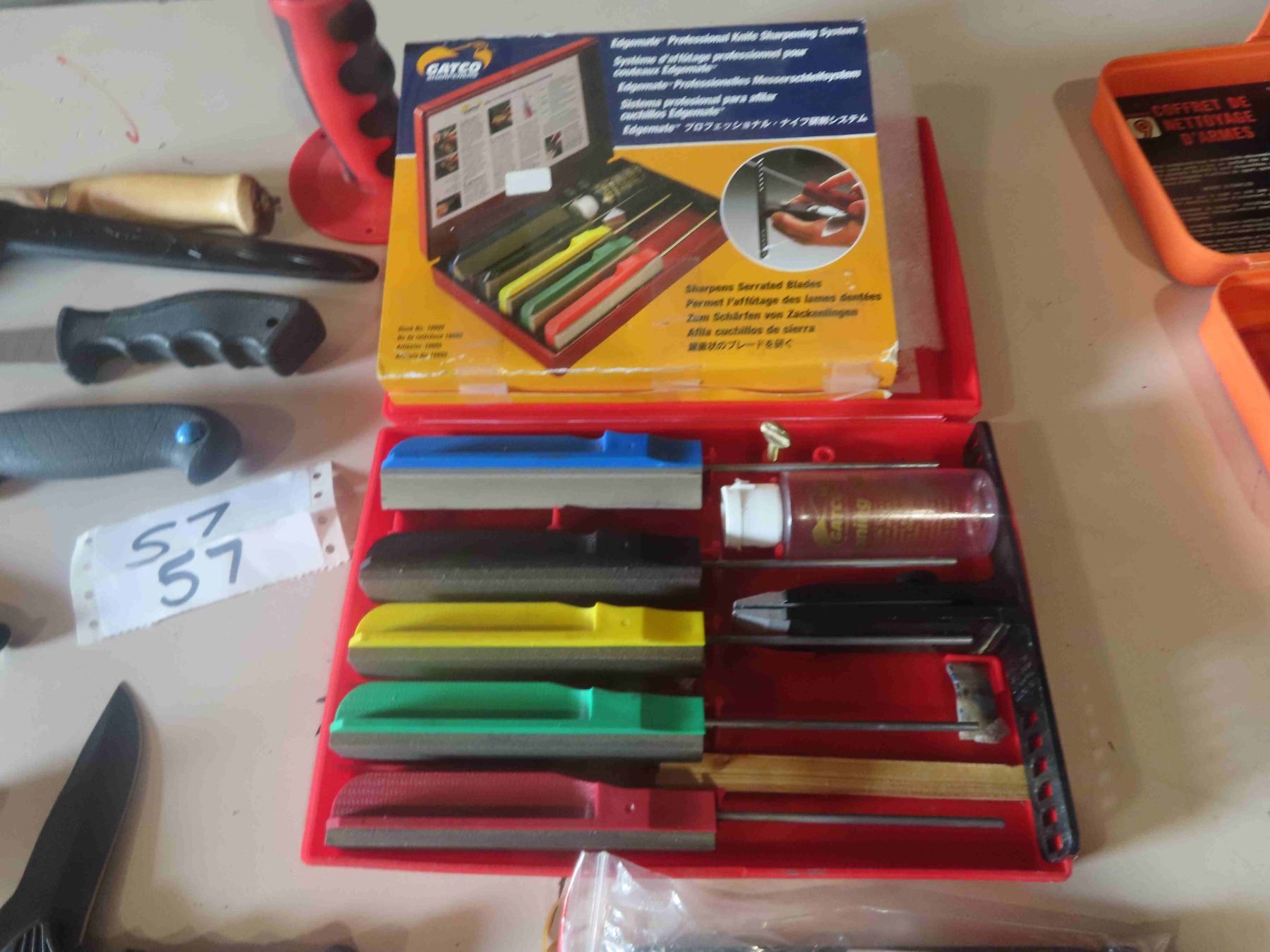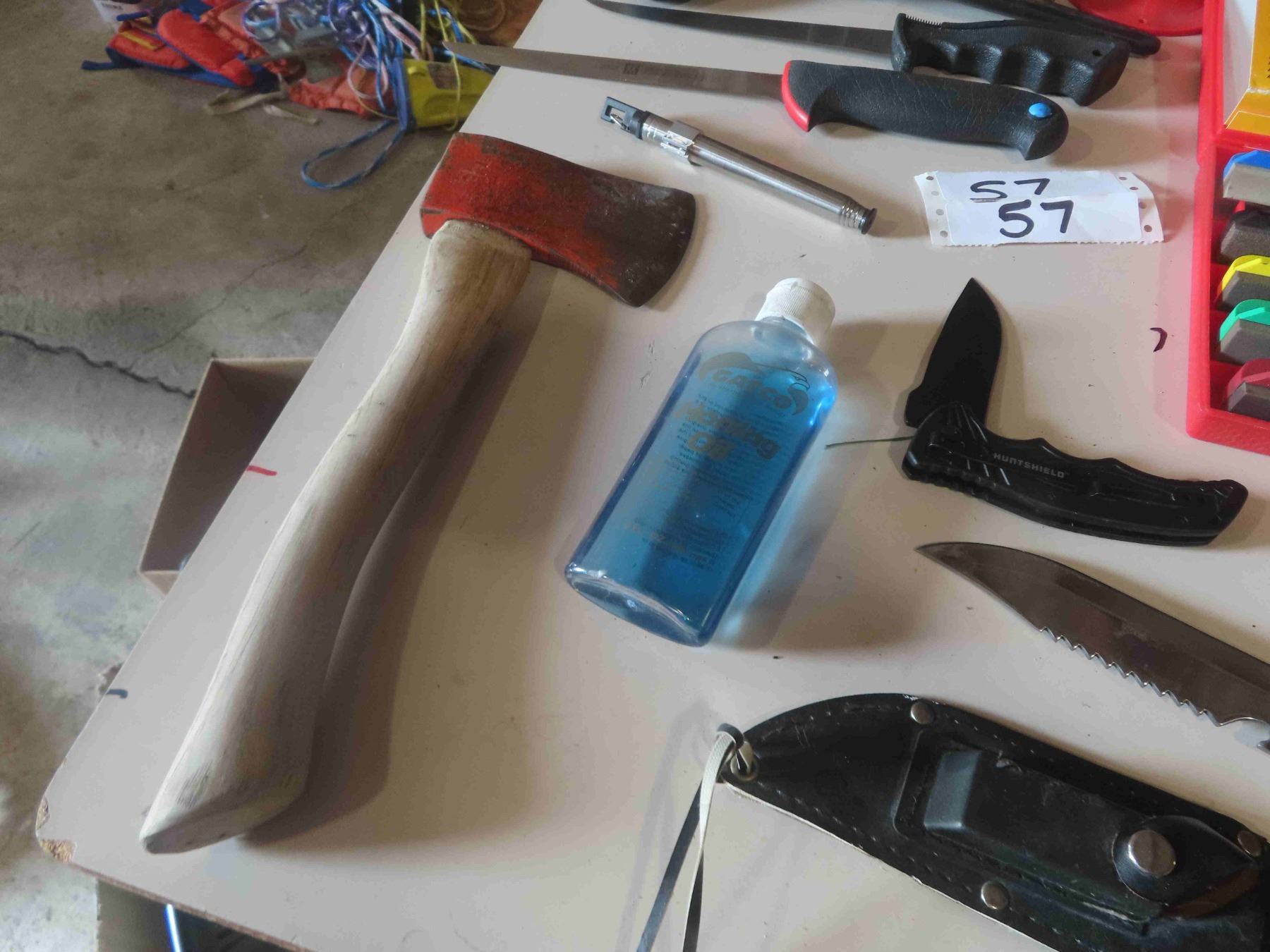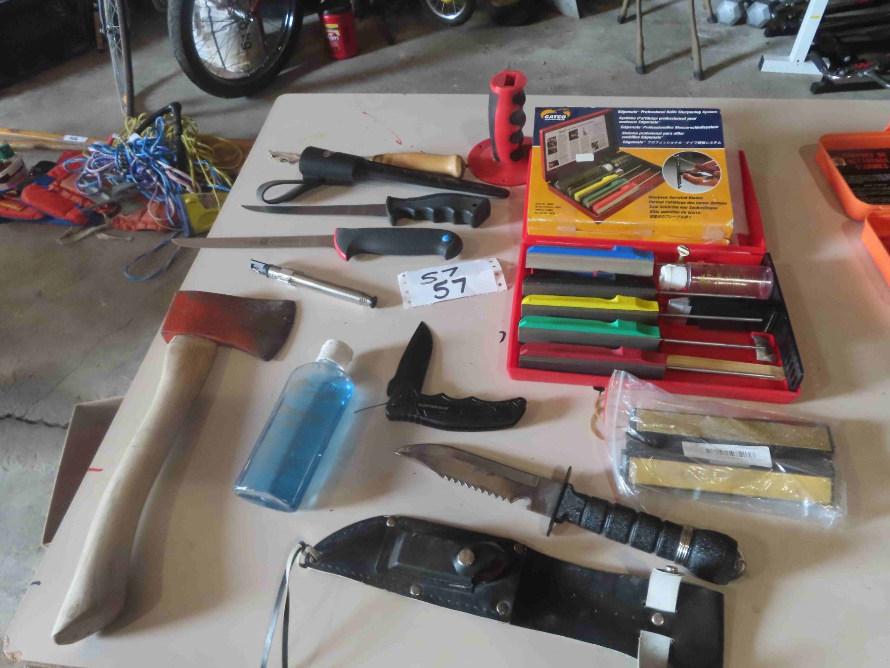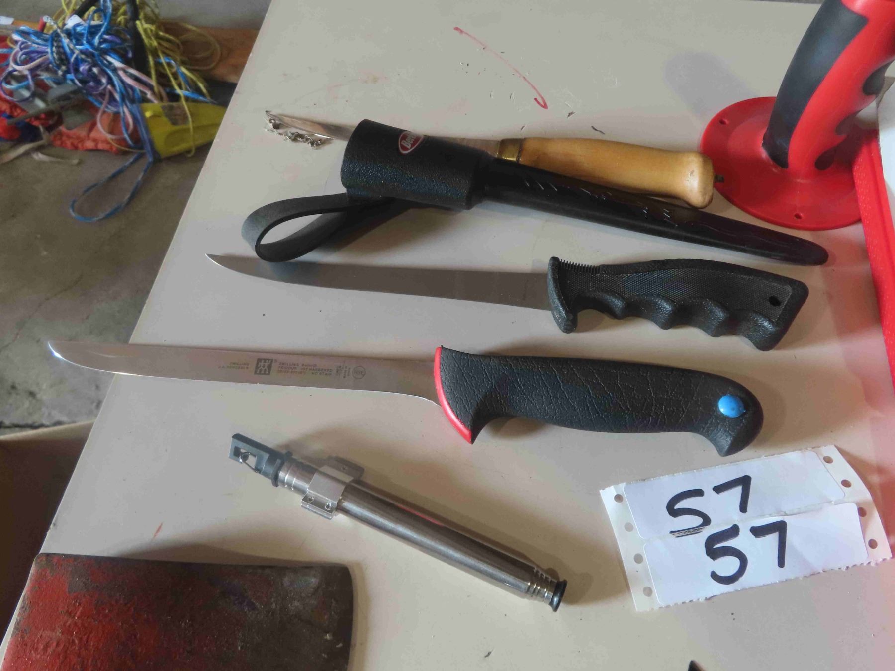 Survivor Hunting Knife, Filleting Knives ( 1 JA Henckels, 2 Burtley ) , Hatchet, Gatco Knife Sharpening Kit, Plus