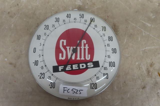 Swift Feeds Tin with Glass Cover Thermometer Made in USA 10" wide