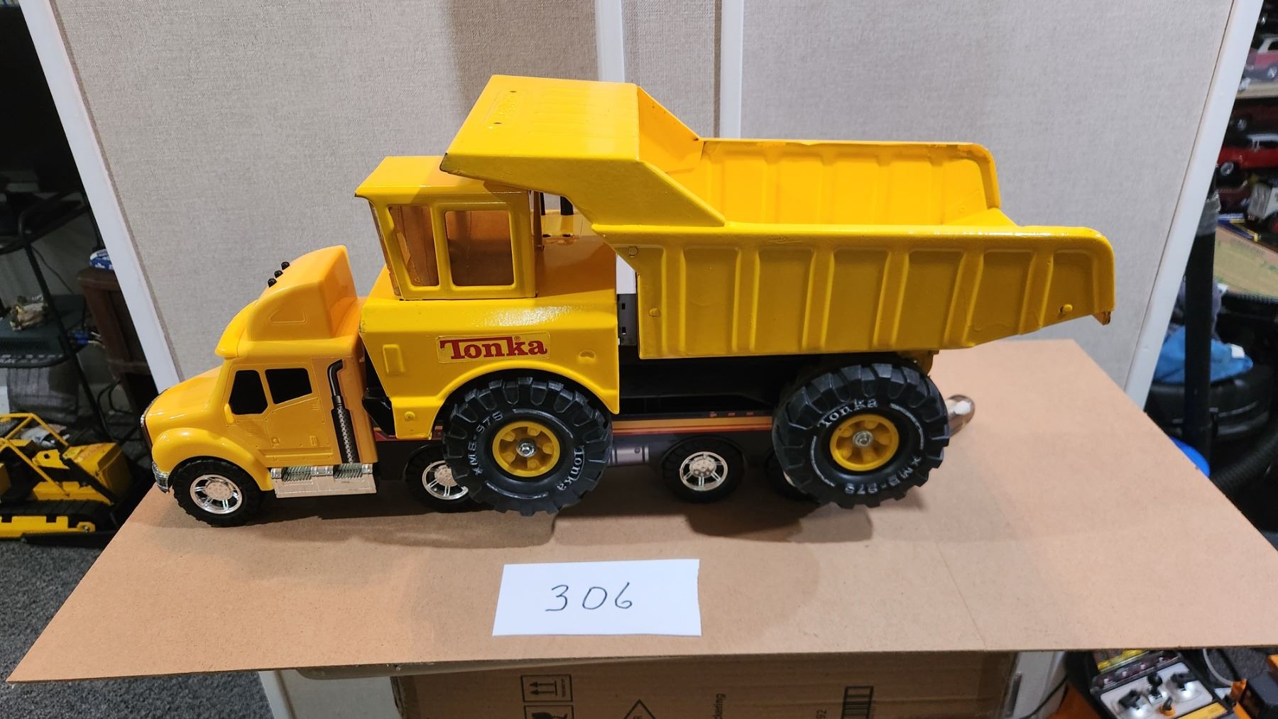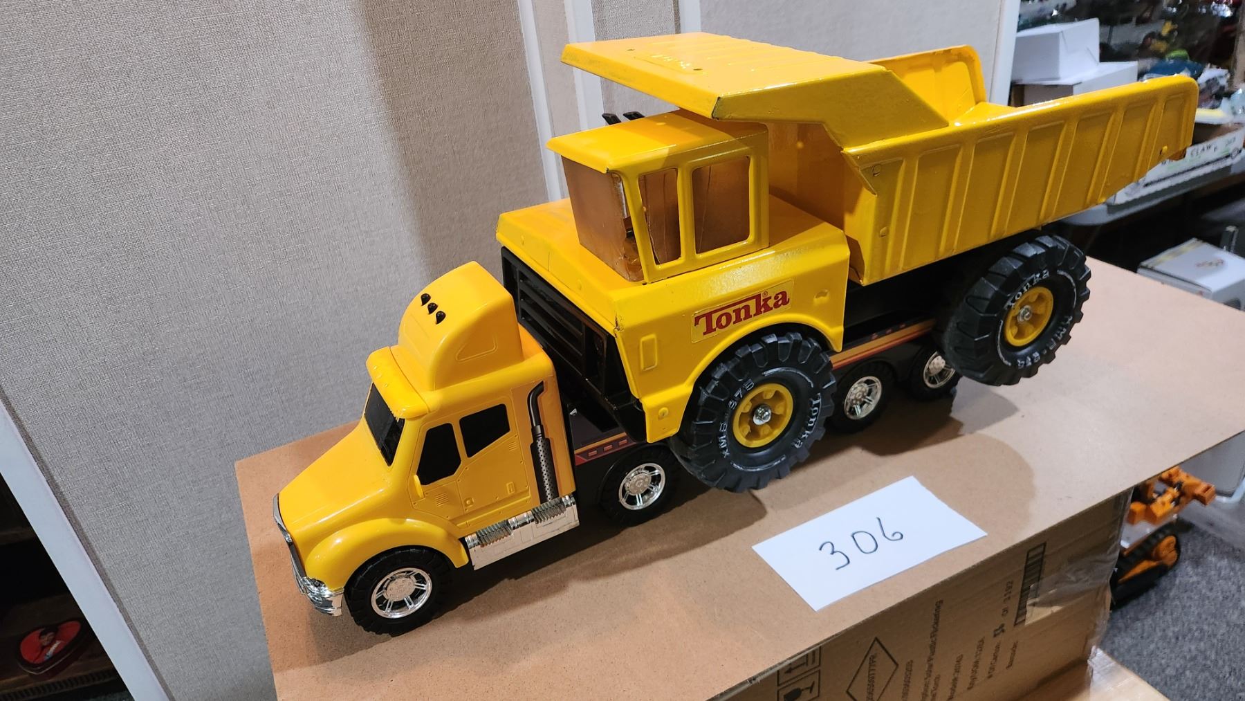 TONKA MIGHTY DUMP TRUCK, CONSTRUCTION EQUIPMENT HAULER WITH LIGHTS AND SOUND.