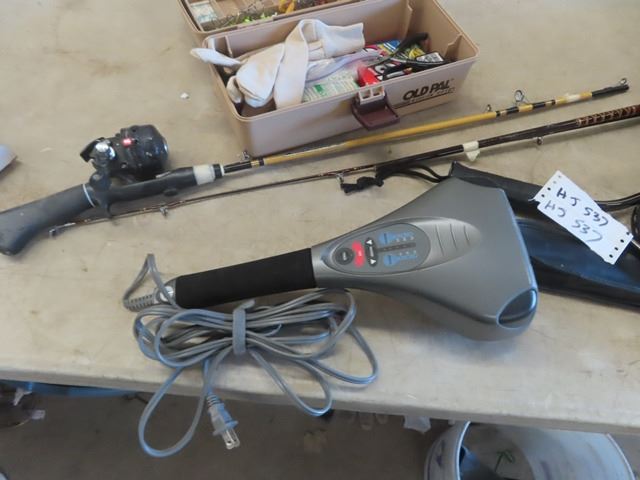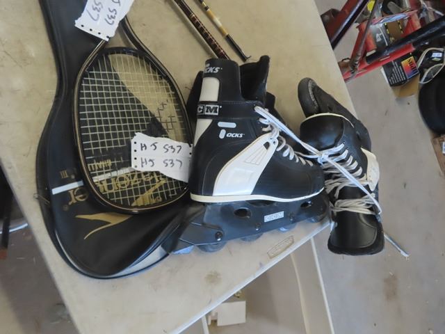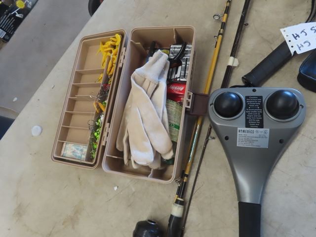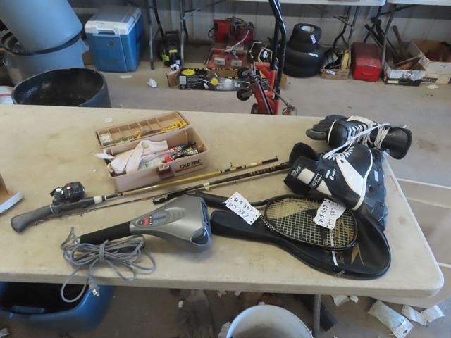 Tackle Box with Tackle, Fishing Rod, Tennis Racket, Roller Blades Sz 9 & Massage Wand