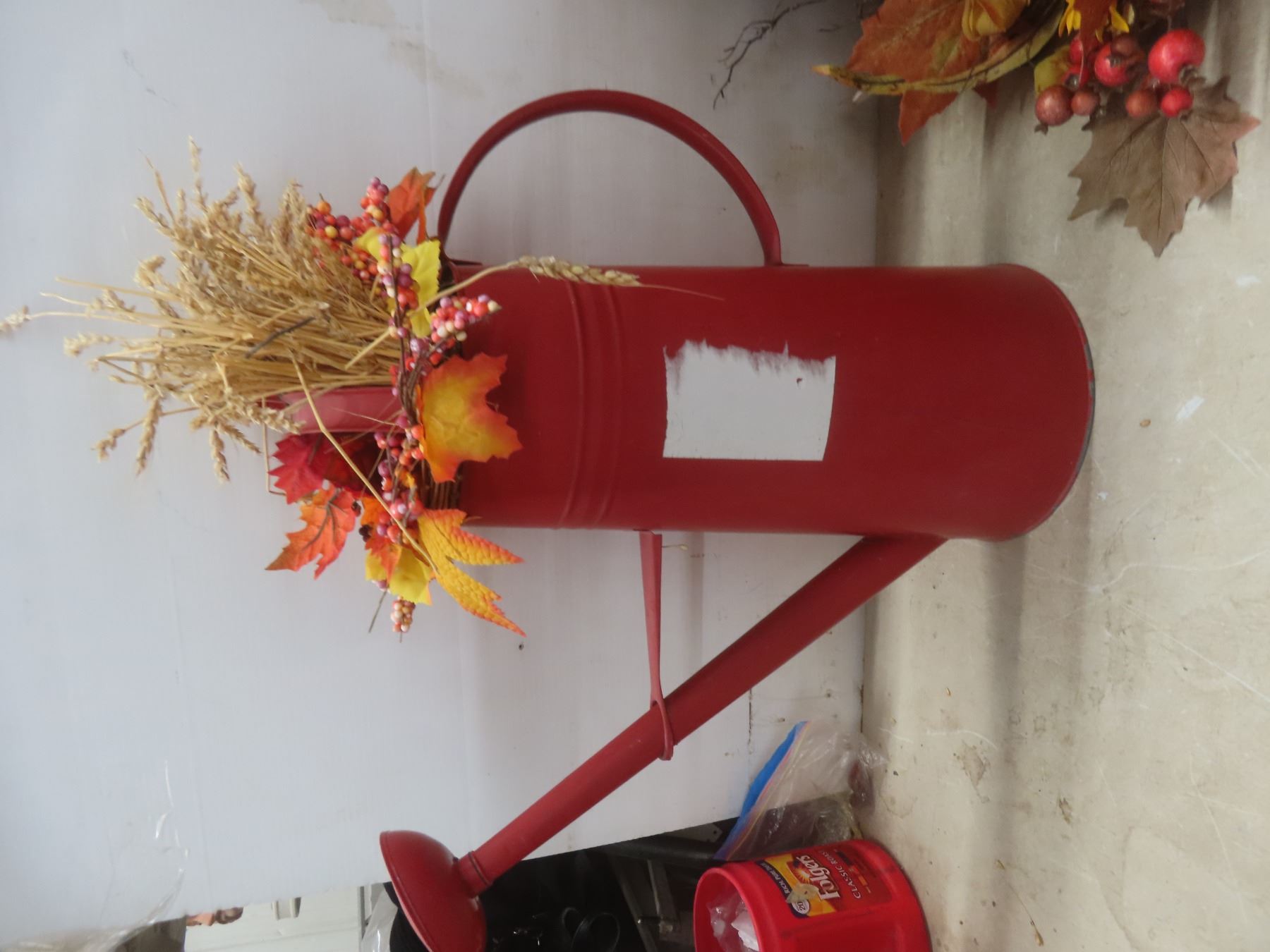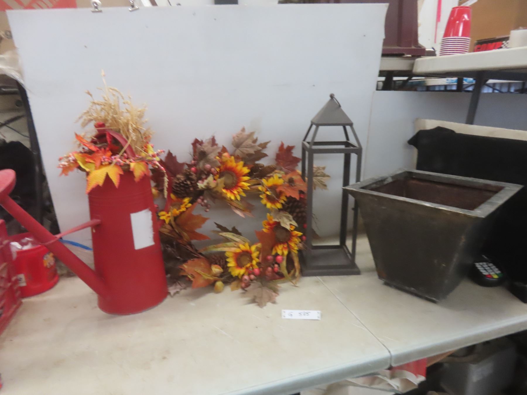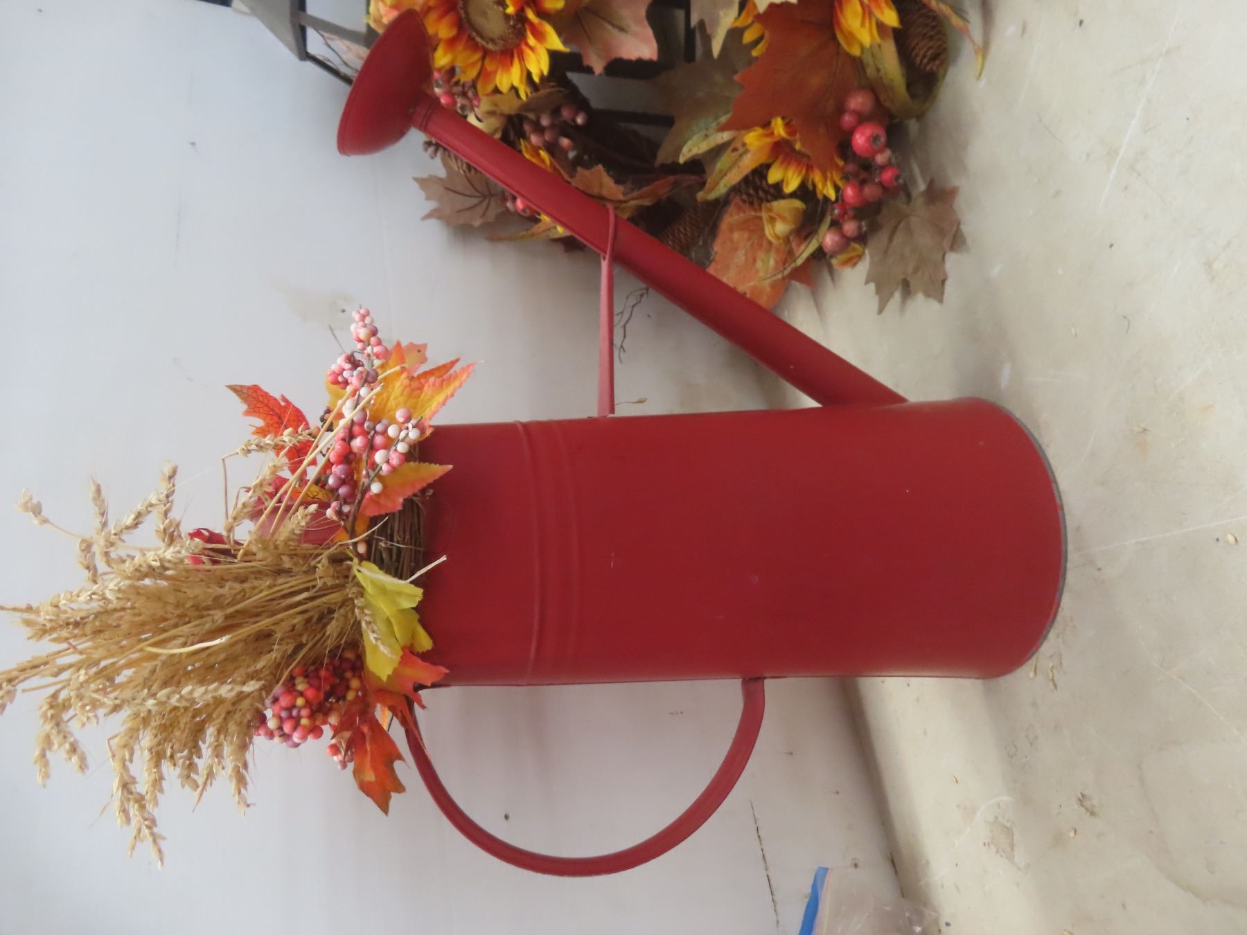 Tall Watering Can with Flowers, Metal Planter, Wreath, Lantern Style Candle Holder