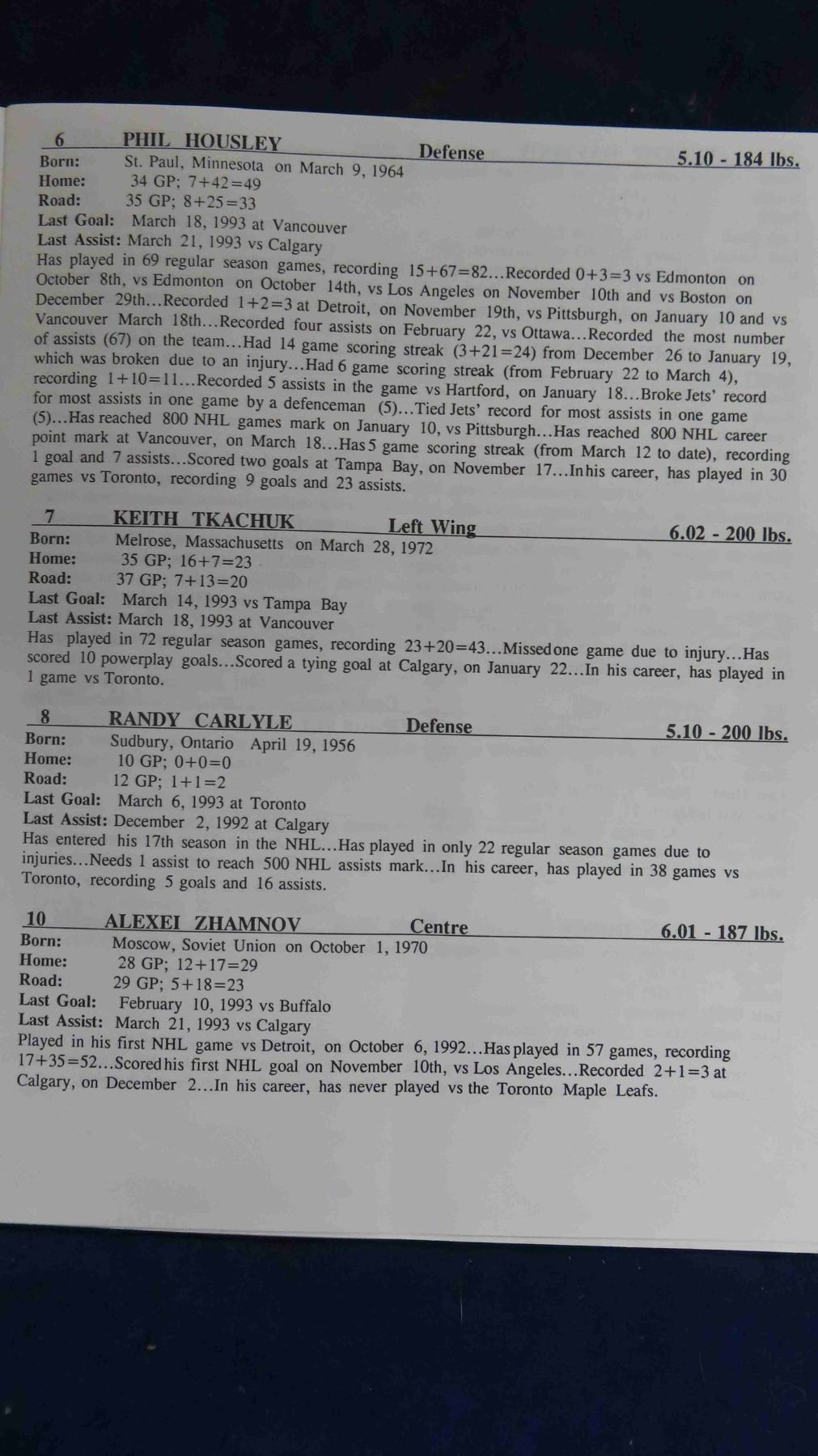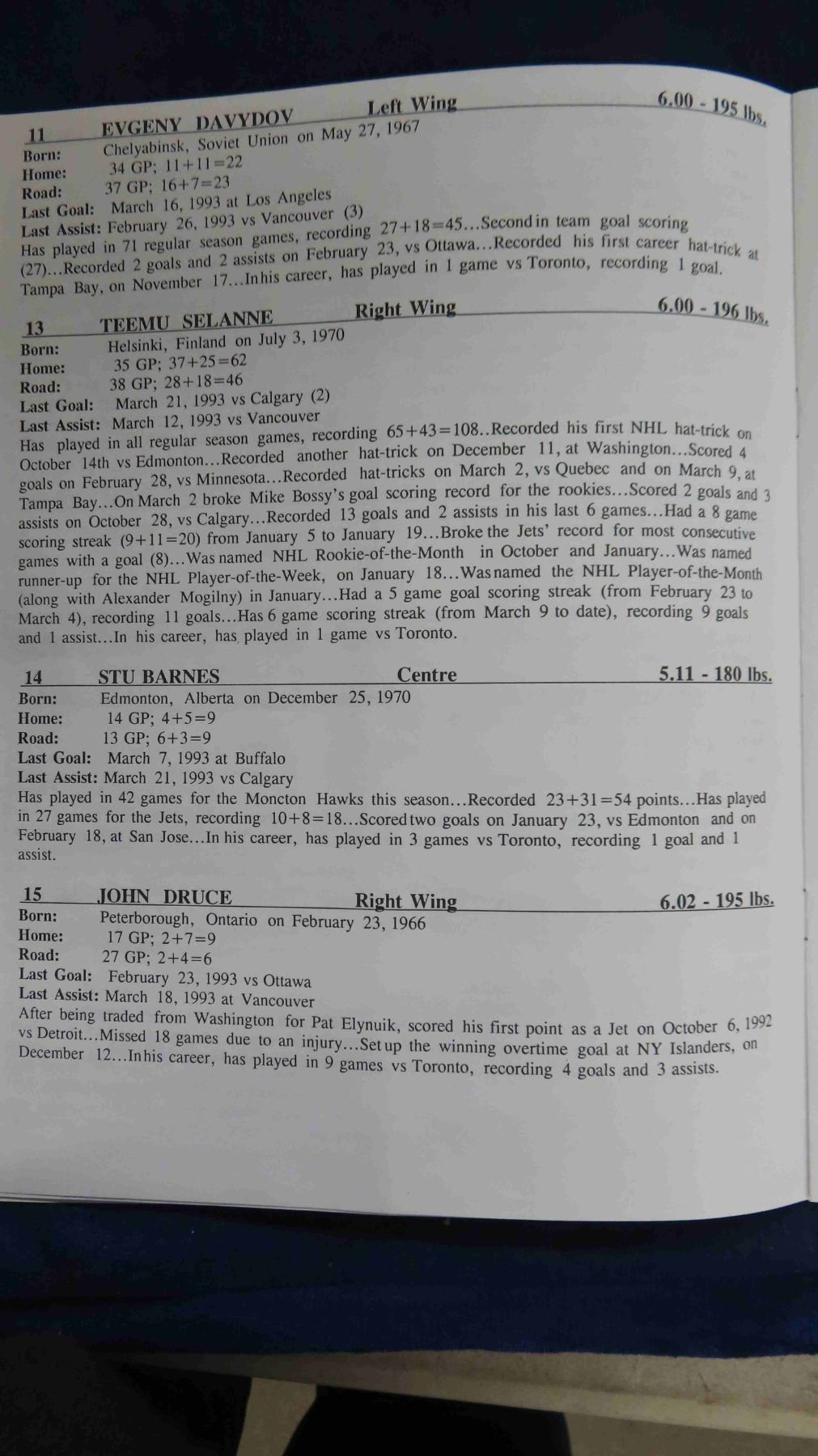 Teemu Selanne Signed Winnipeg Jets Line Up from March 23, 1993 vs Toronto Maple Leafs