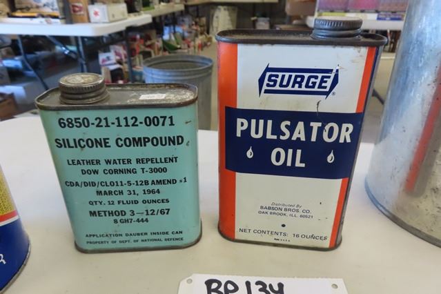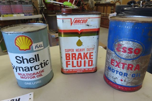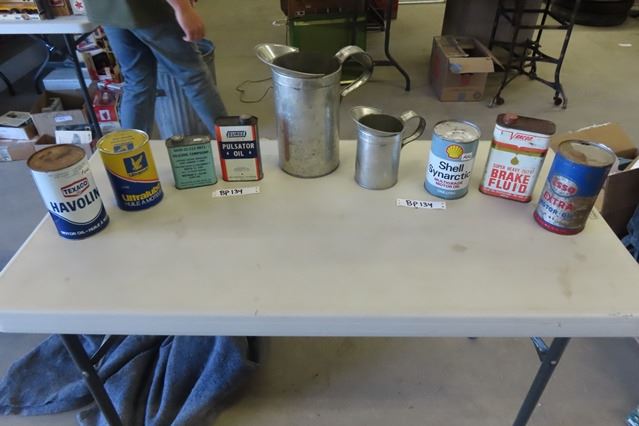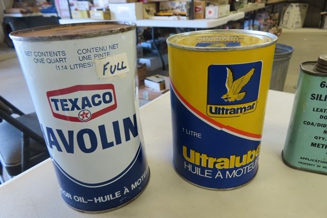 Texaco, Ultramar, Shell - Full Oil Tins, 1 Quart + 1 Gal Metal Pouring Jugs, Assorted Oil Tins