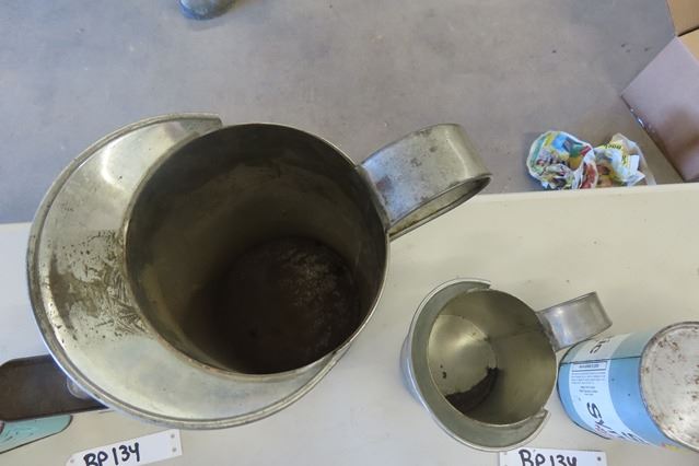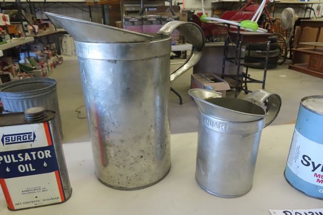Texaco, Ultramar, Shell - Full Oil Tins, 1 Quart + 1 Gal Metal Pouring Jugs,