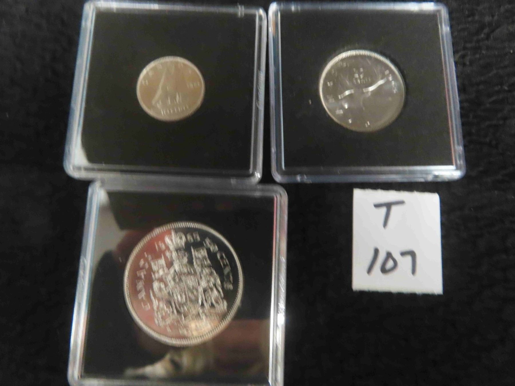 Three 1965 Canadian coins, 80% silver, 50 cent, 25 cent and 10 cent pieces, each sealed in its own case; VERY HIGH Grade, BU-PL-MS, uncirculated and untouched by any hand, ungraded