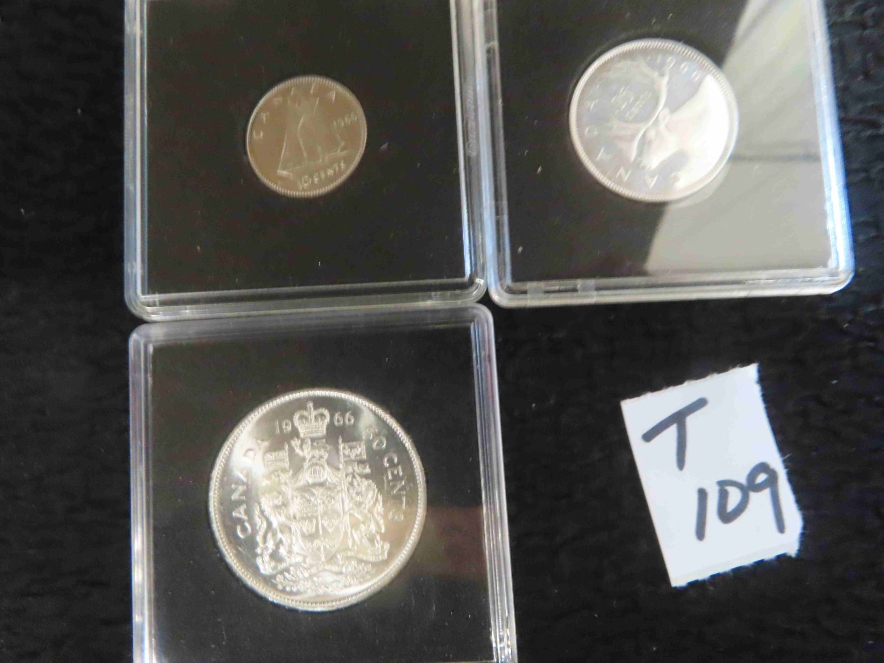 Three 1966 Canadian coins, 80% silver, 50 cent, 25 cent and 10 cent pieces, each sealed