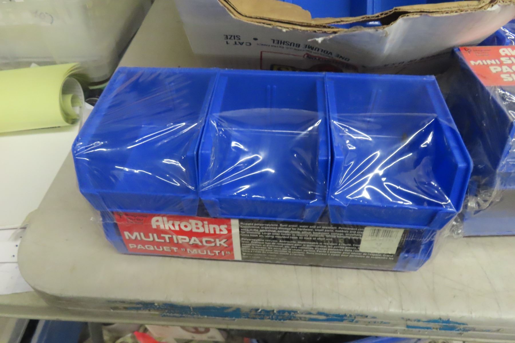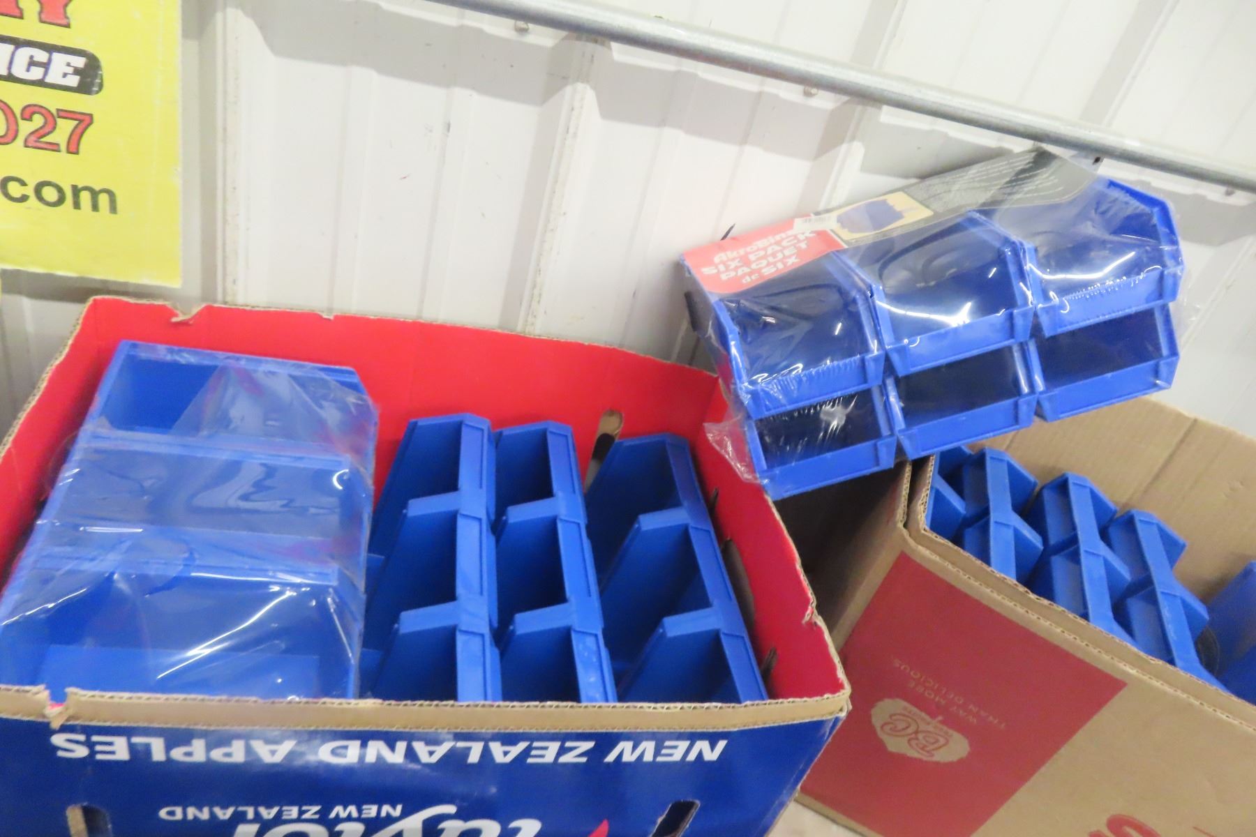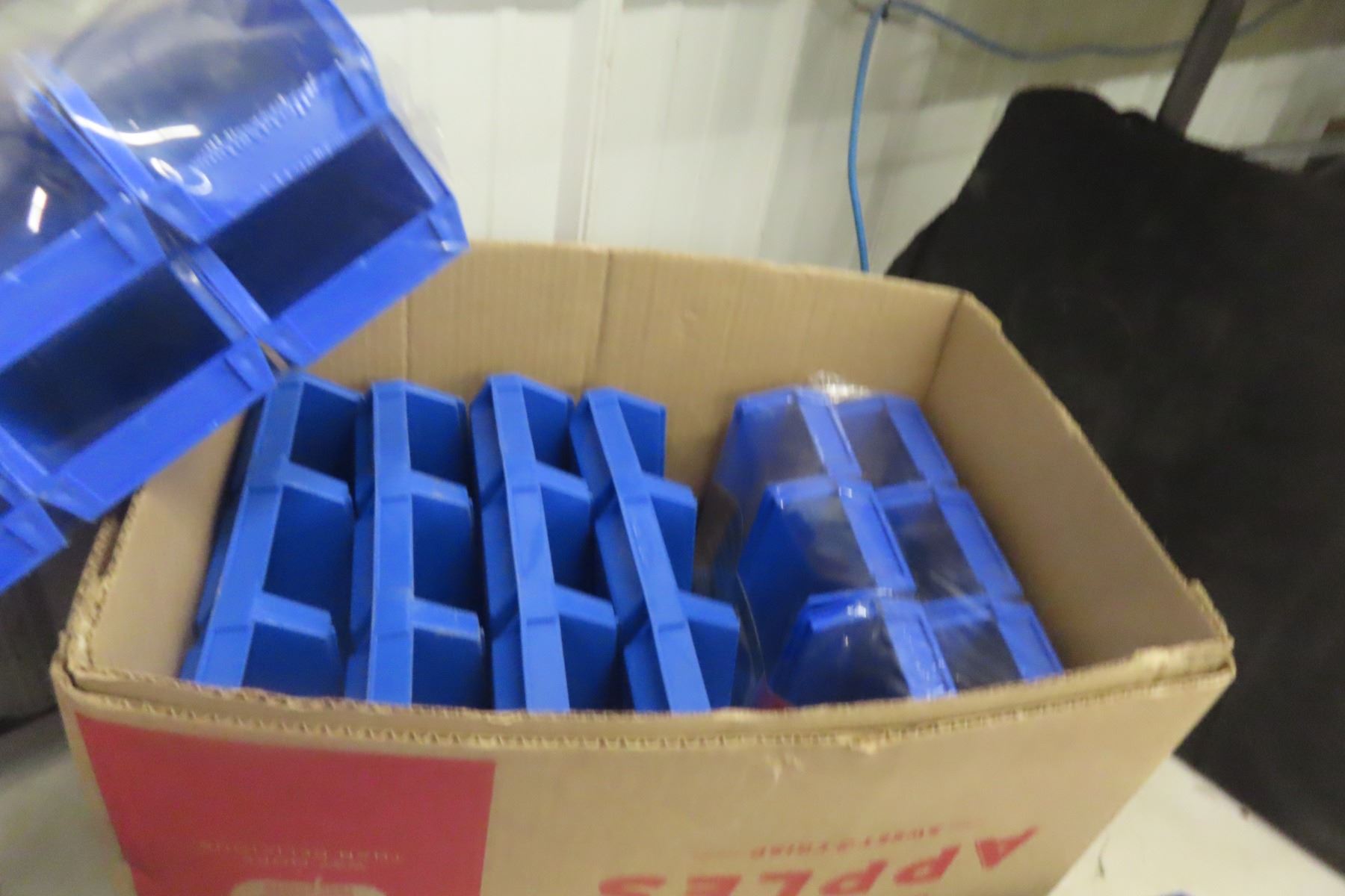 Three Boxes of New Heavy Blue Plastic Rust-Proof Interlocking Bins for Parts, Hardware, and Office Supplies