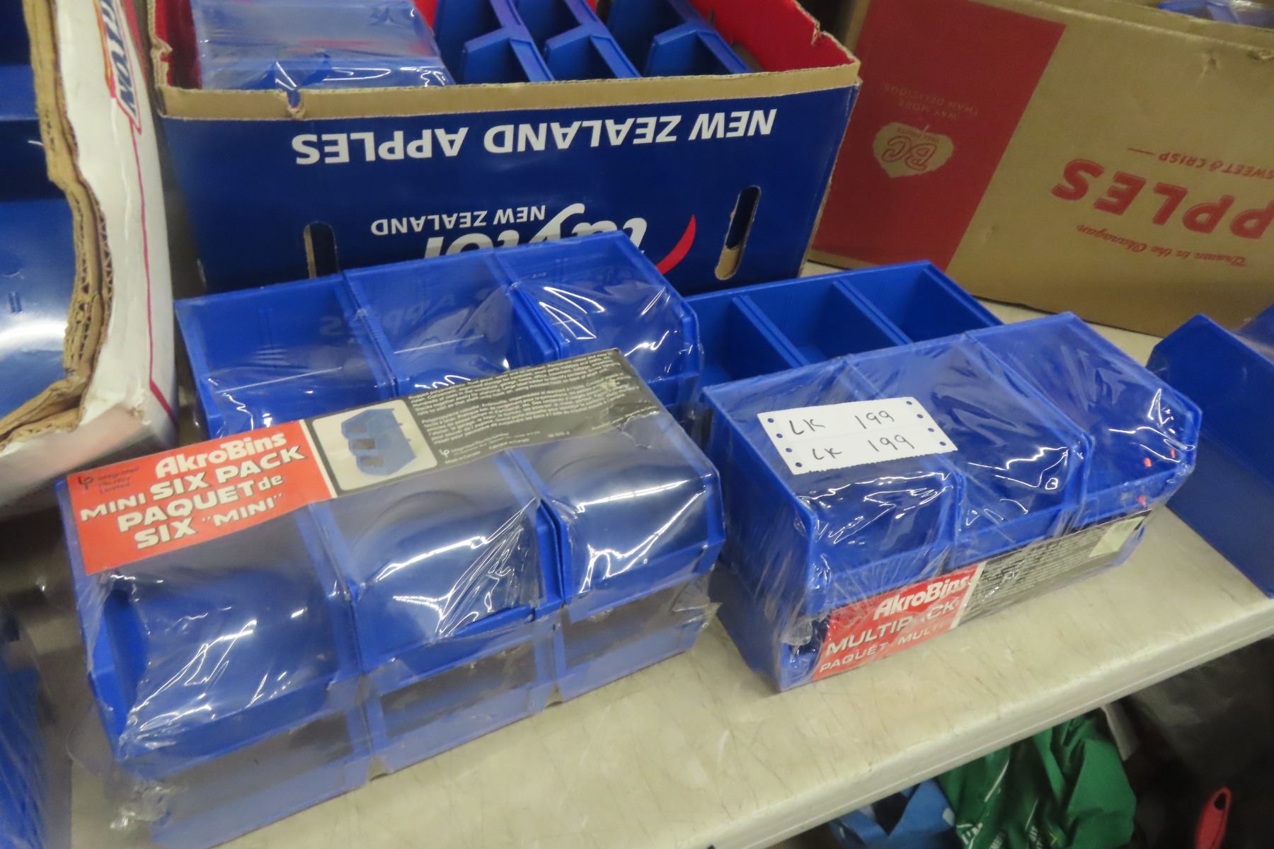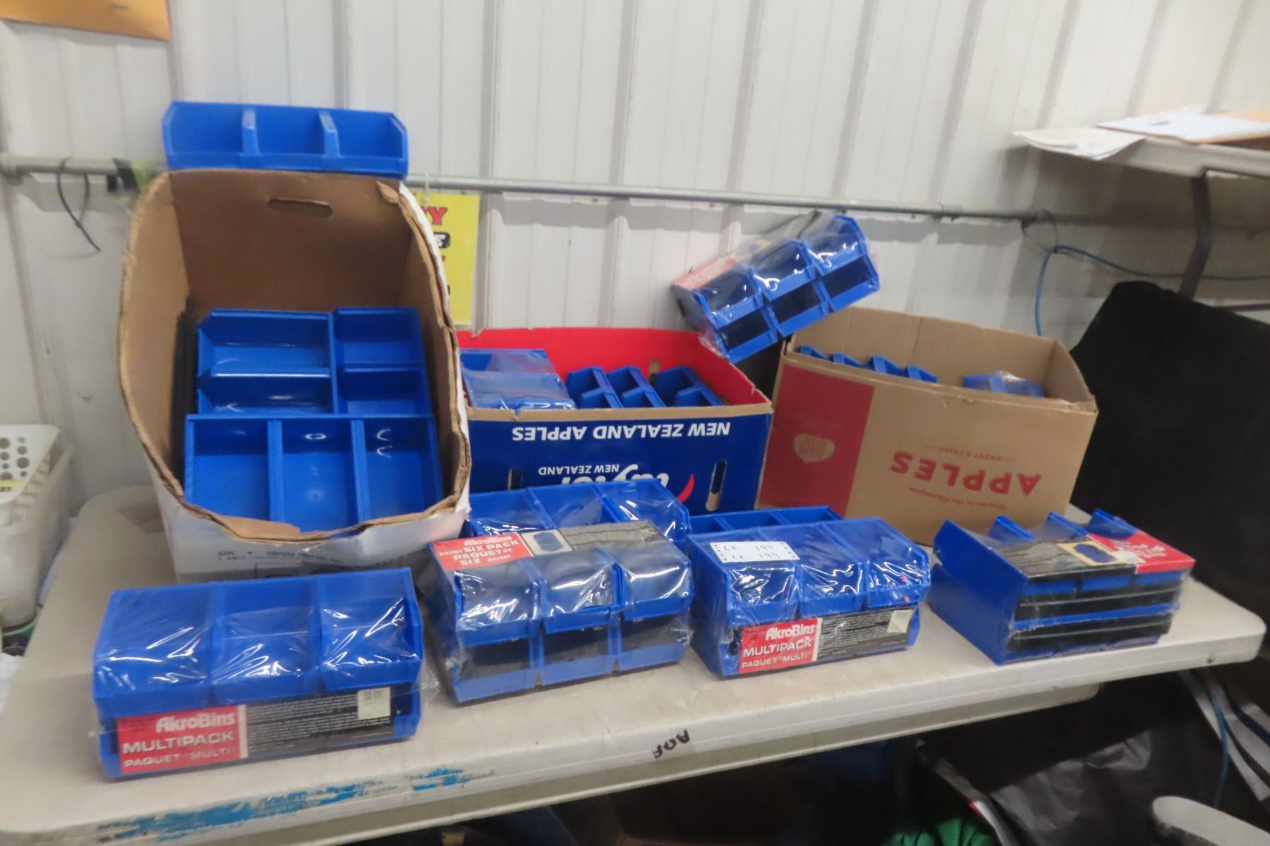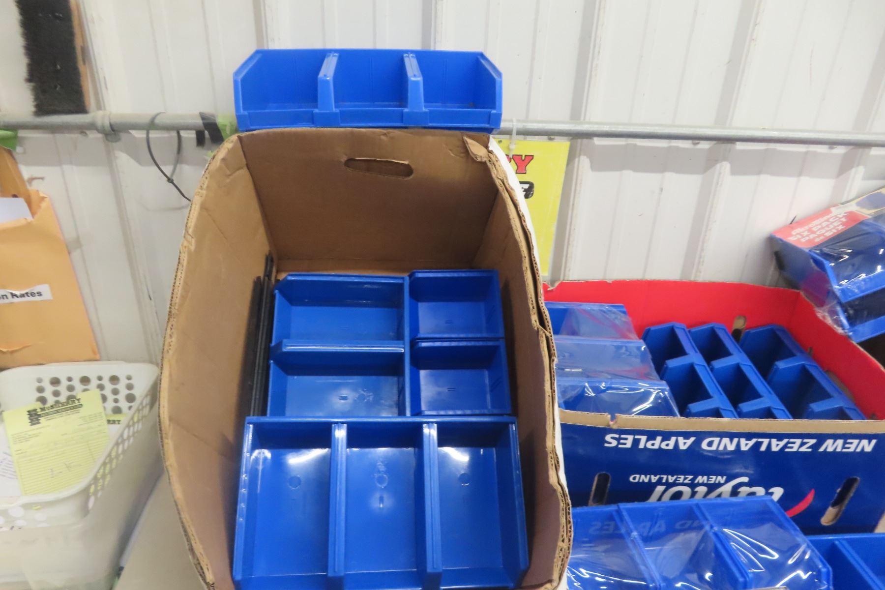 Three Boxes of New Heavy Blue Plastic Rust-Proof Interlocking Bins for Parts, Hardware, and Office Supplies