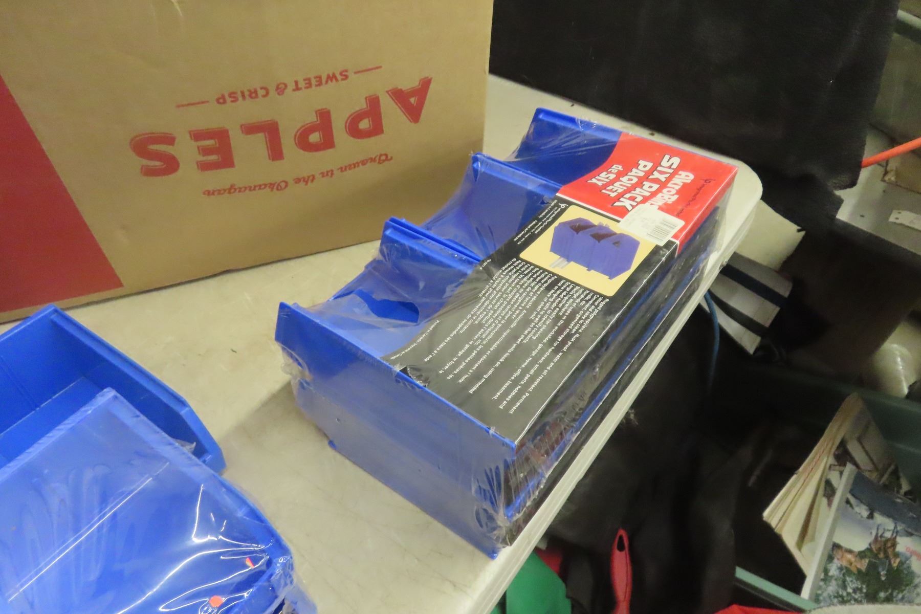 Three Boxes of New Heavy Blue Plastic Rust-Proof Interlocking Bins for Parts, Hardware, and Office
