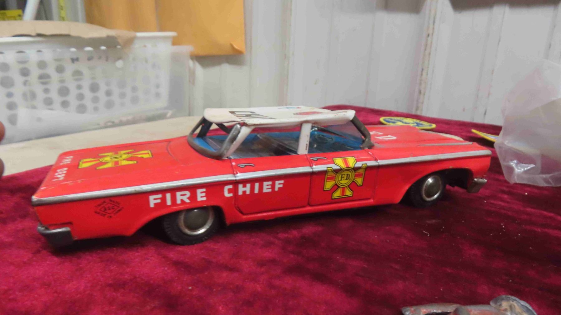 Tin Friction Fire Chief Car Made in Japan, Metal Soldiers, Race Car, Pin Back, The Gump Animated Film